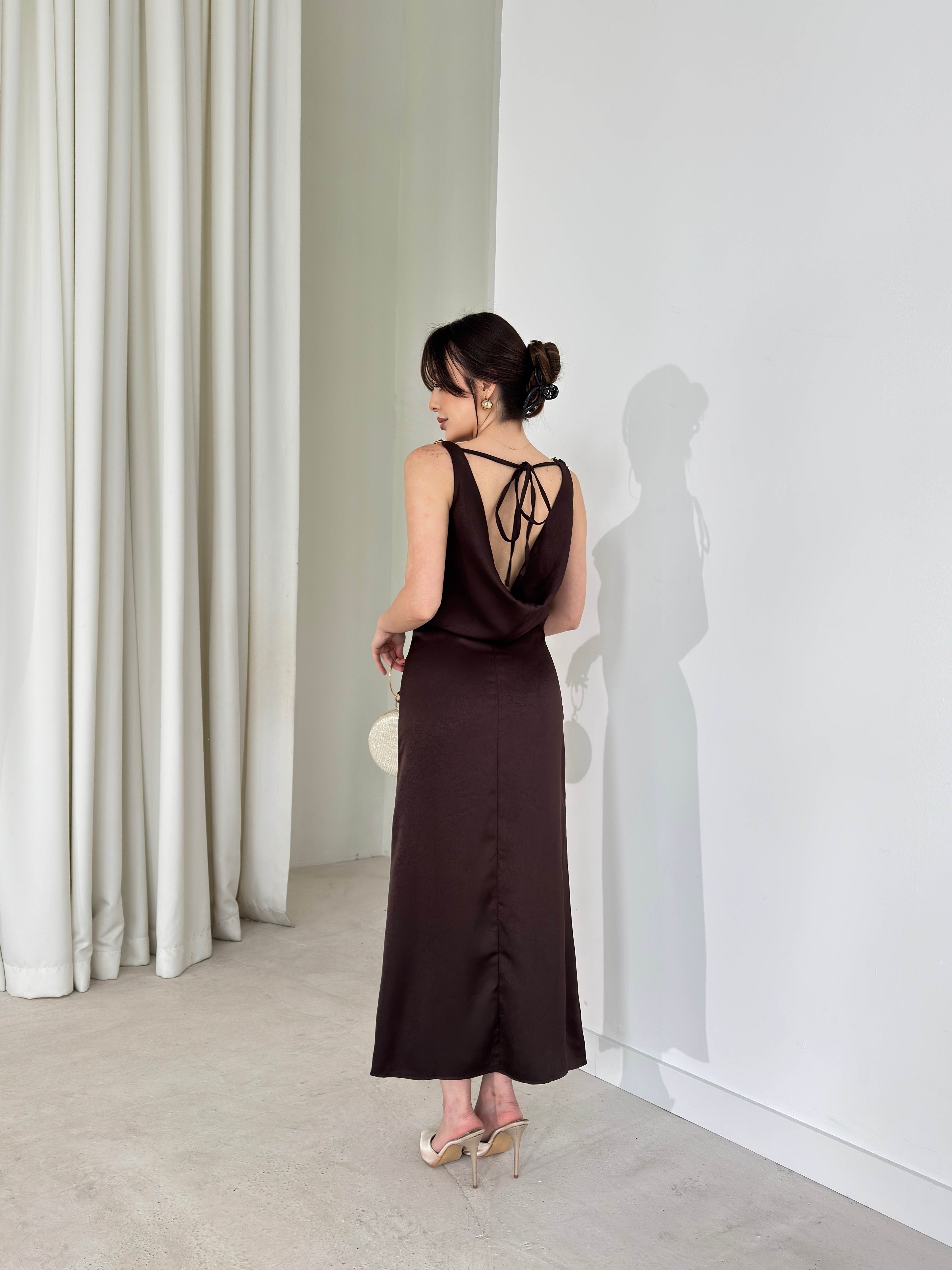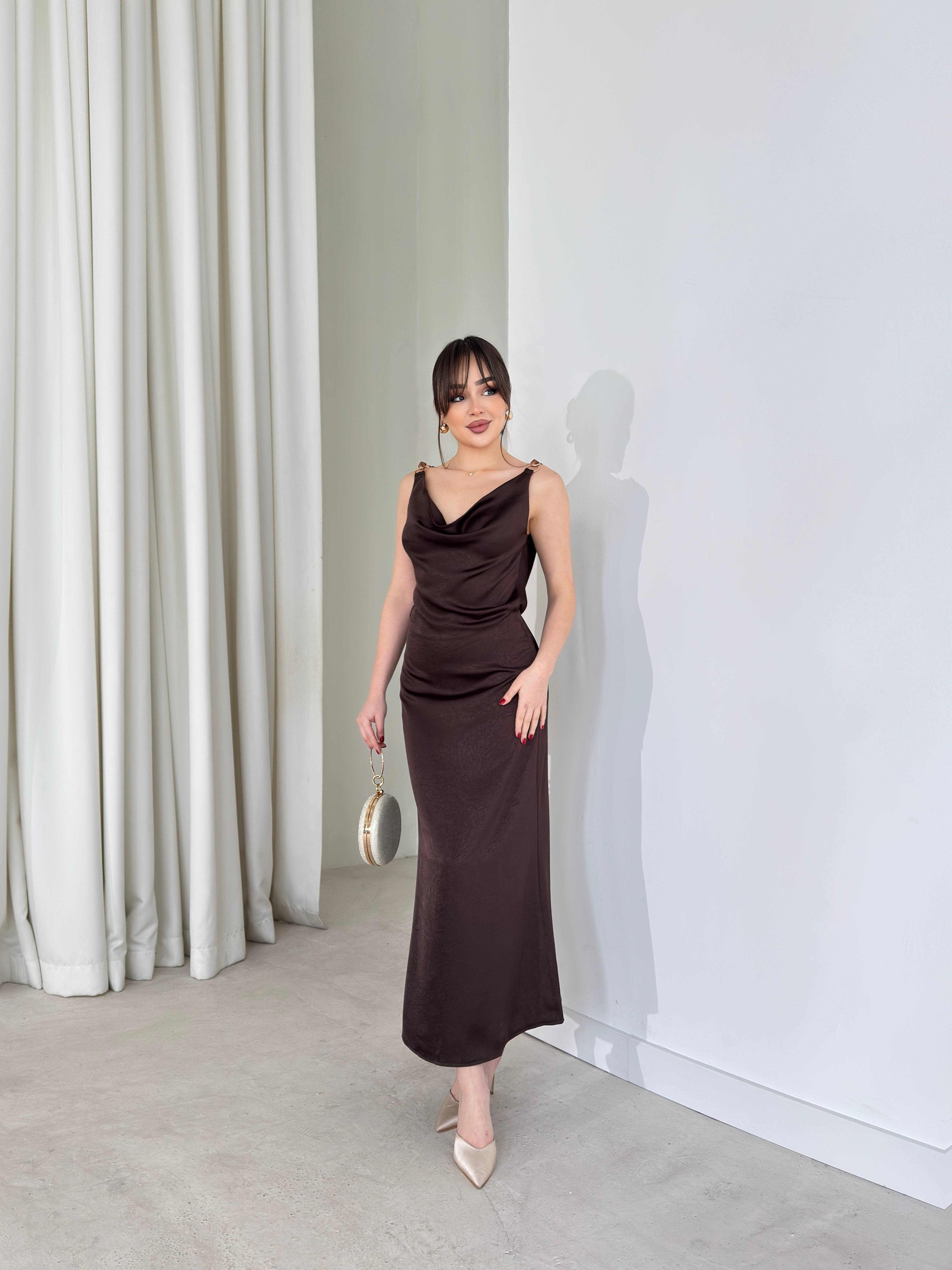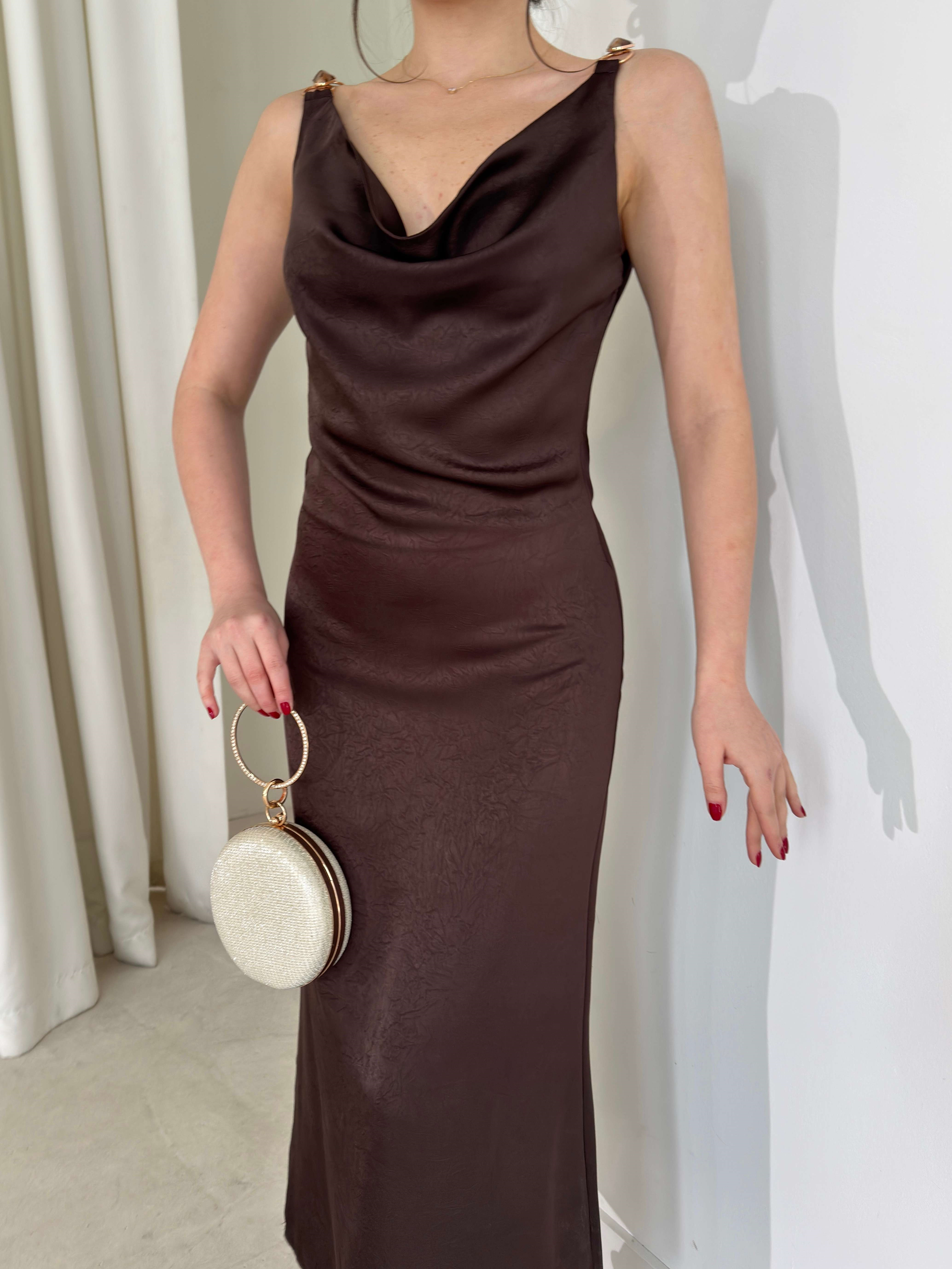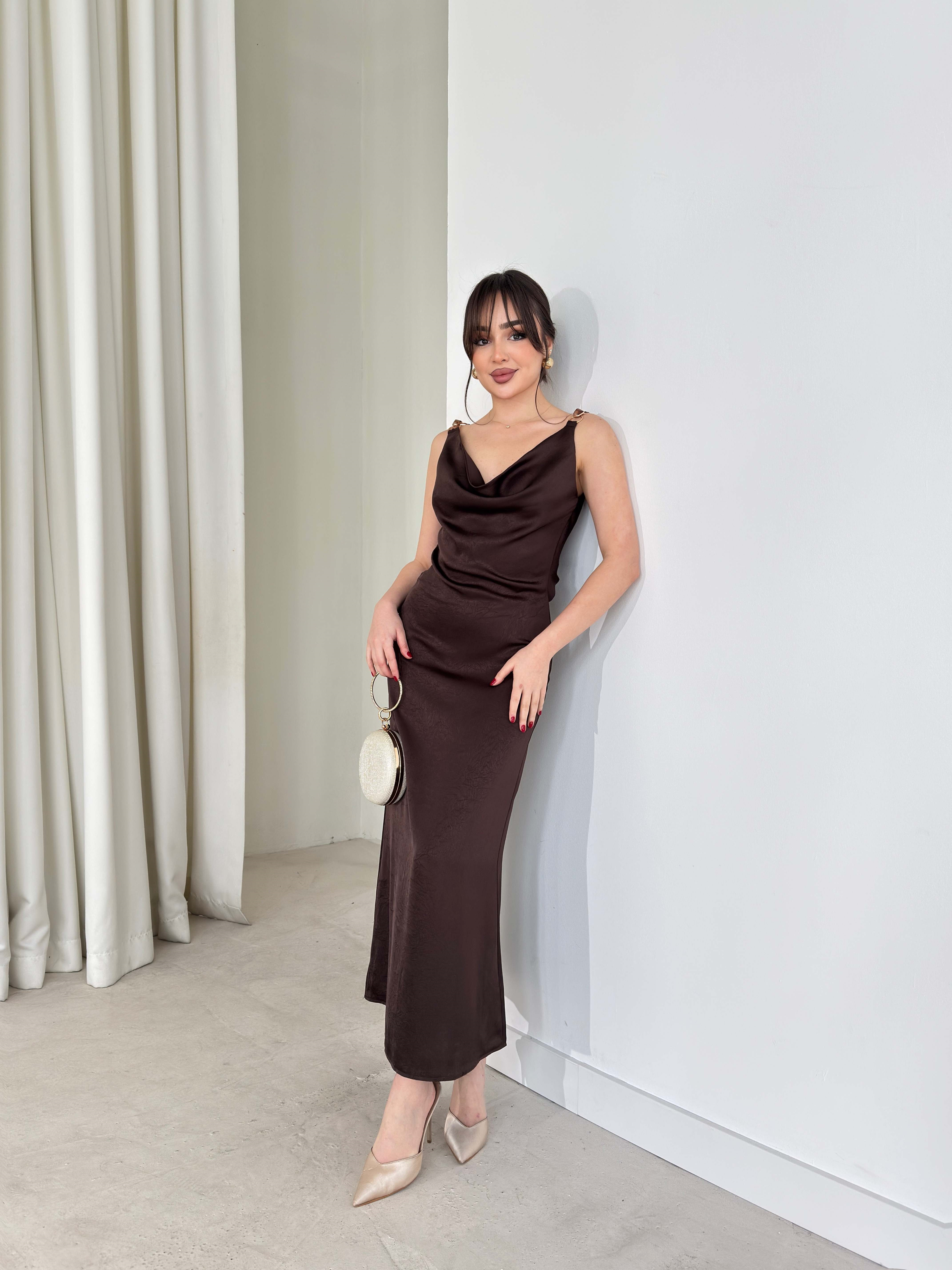 Aksesuar Detaylı Sırtı İp Ve Degaje Detaylı Kahverengi Midi Fabiola Kadın Elbise 26Y135 (26Y135)
