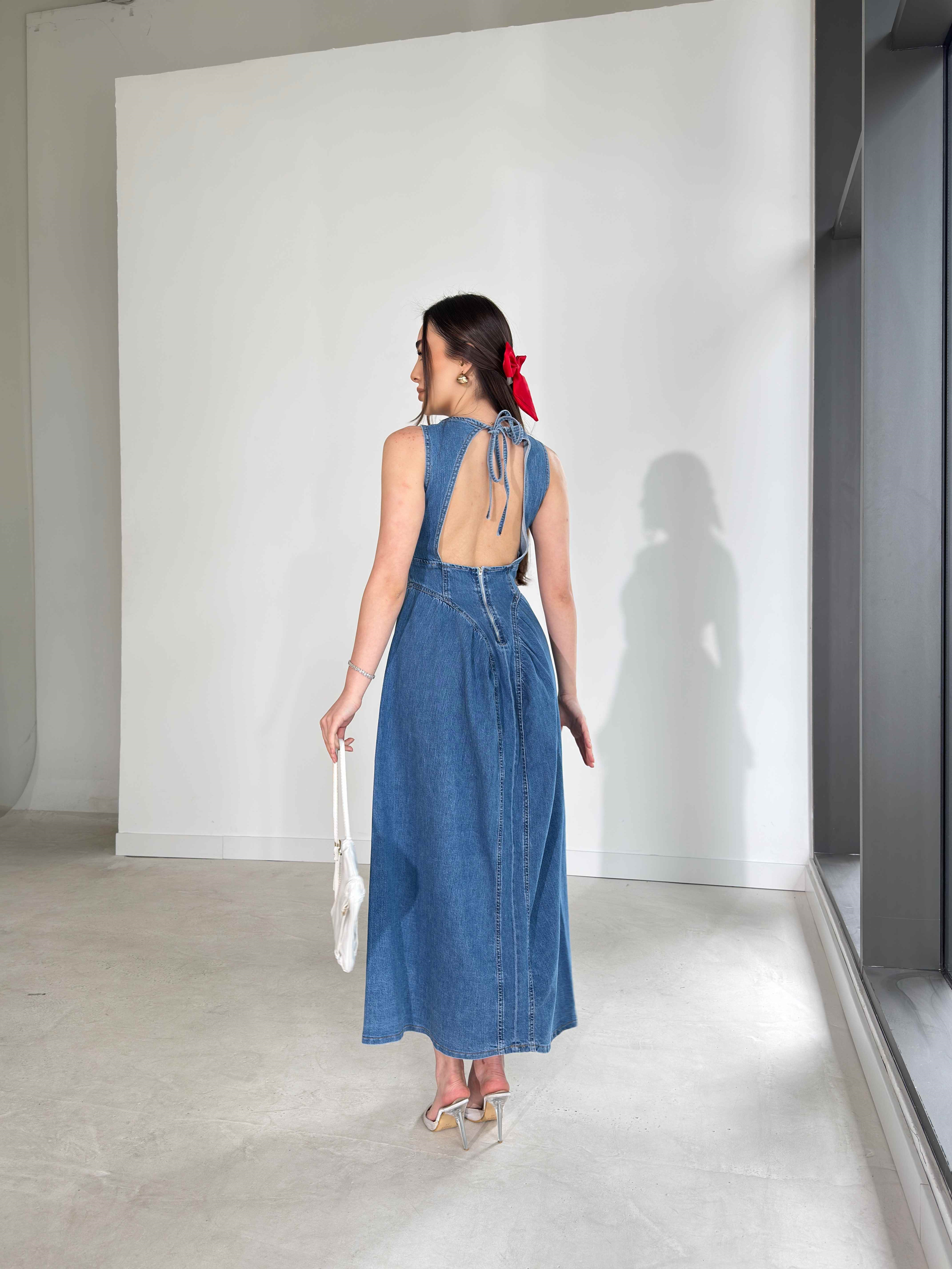 Arkası İp Bağlamalı Pencere Detaylı Eteği Çan Model Kevran Mavi Kadın Kot Elbise 26Y121 (26Y121)