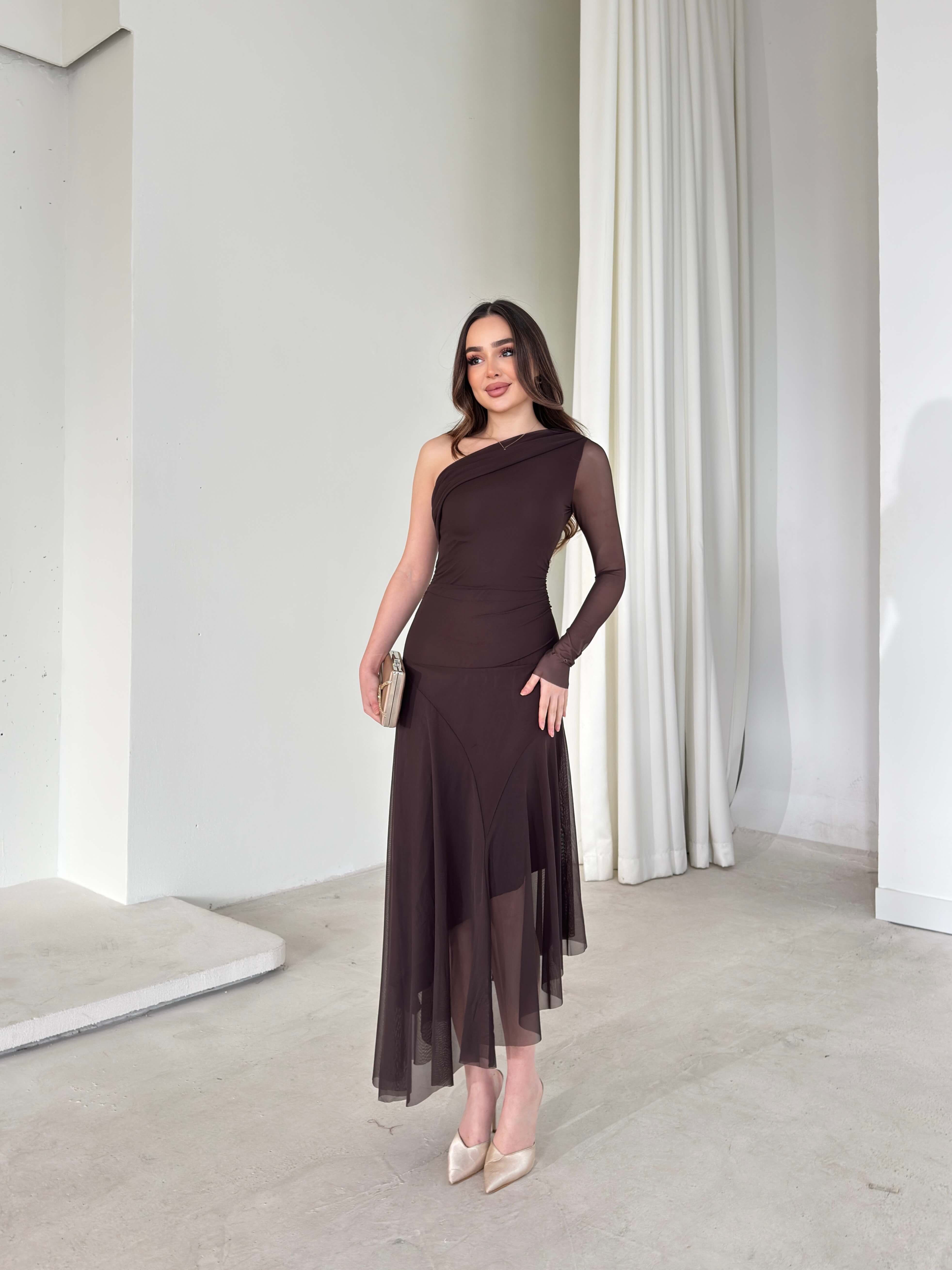 Asimetrik Kesim Tek Kol Tül Lirve Kahve Kadın Elbise 26Y040 (26Y040)