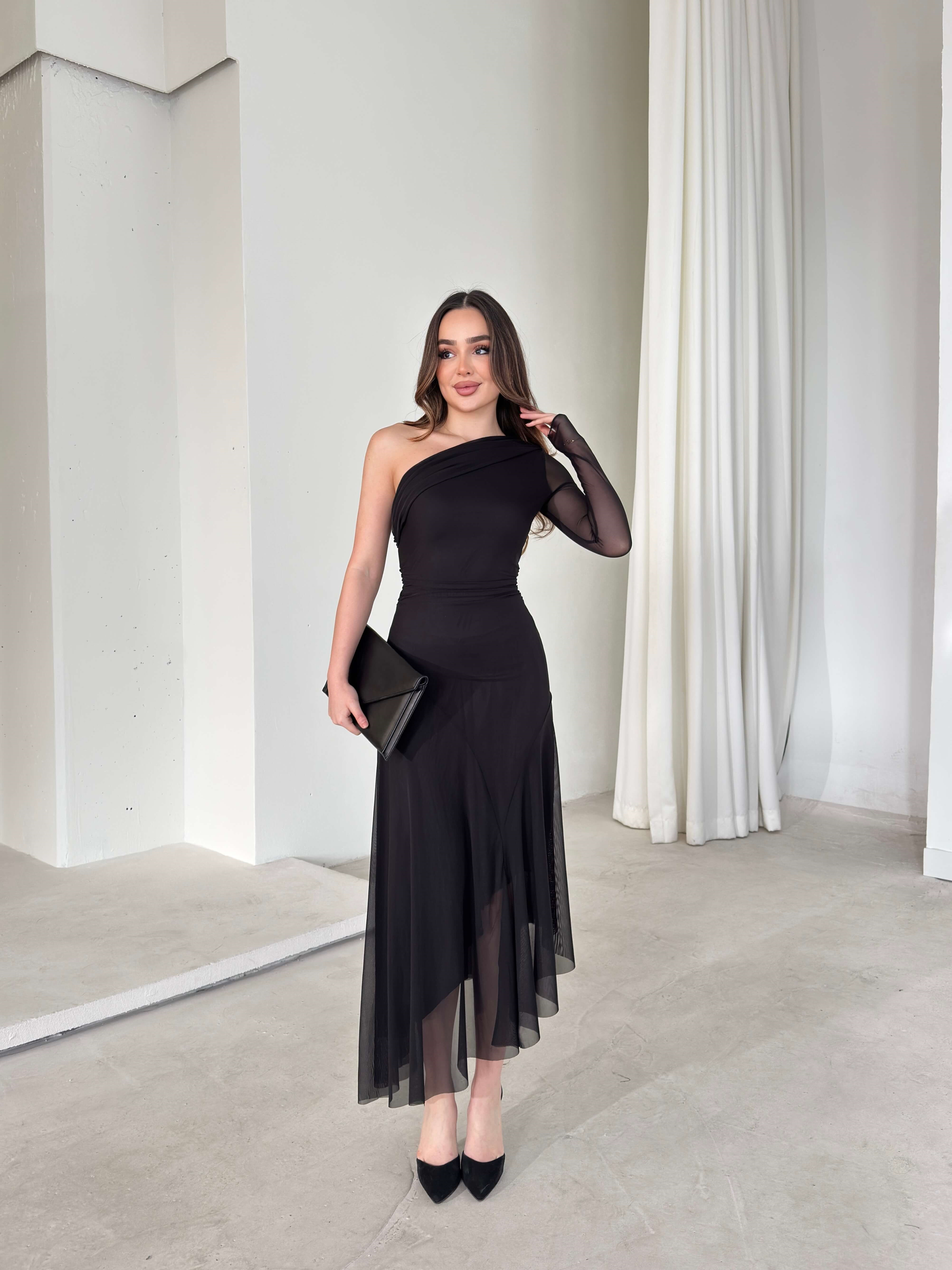 Asimetrik Kesim Tek Kol Tül Lirve Siyah Kadın Elbise 26Y040 (26Y040)