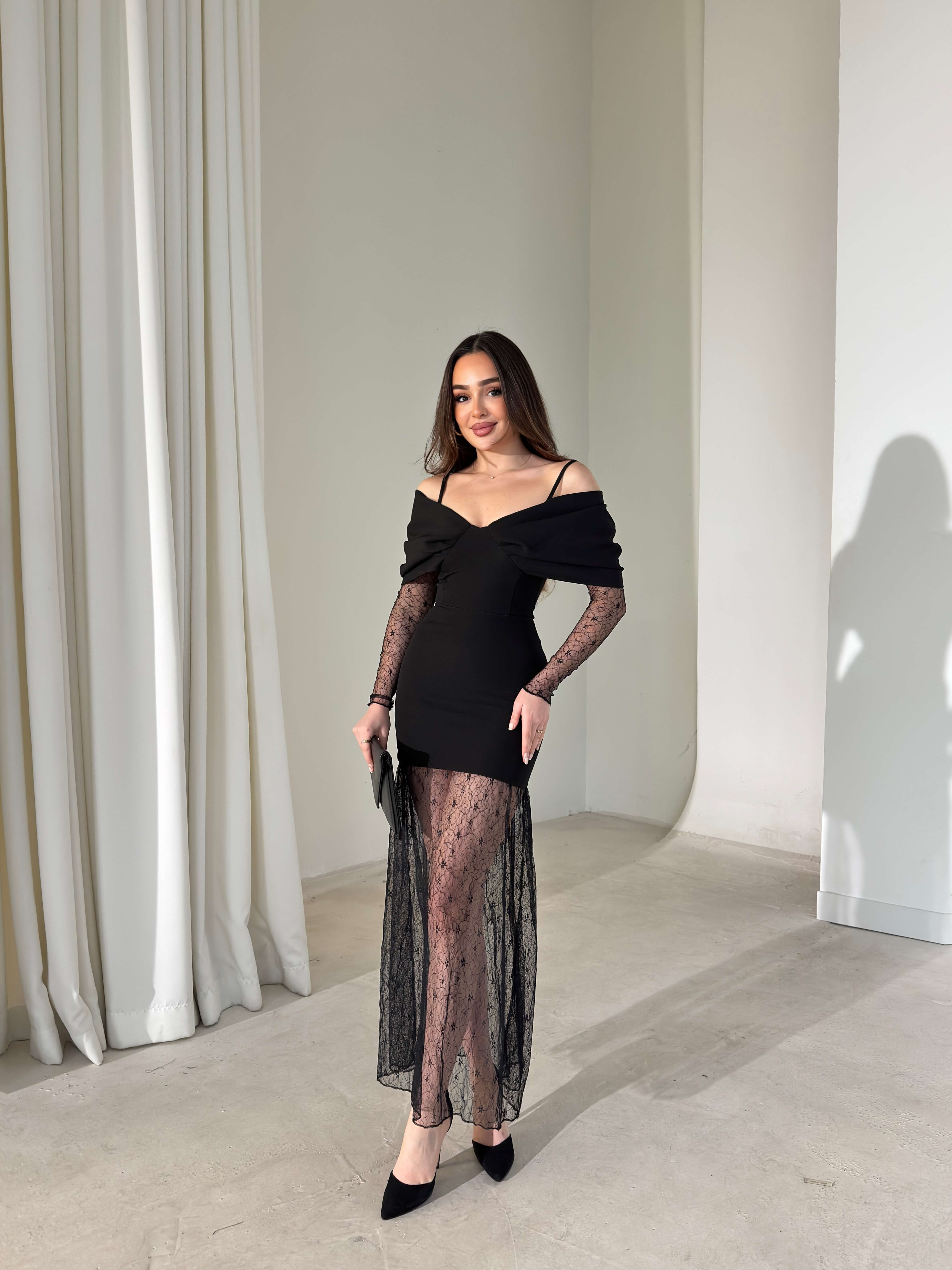 Askılı Madonna Yaka Kolları Eteği Dantelli Drapeli Oliner Siyah Kadın Elbise 26Y030 (26Y030)