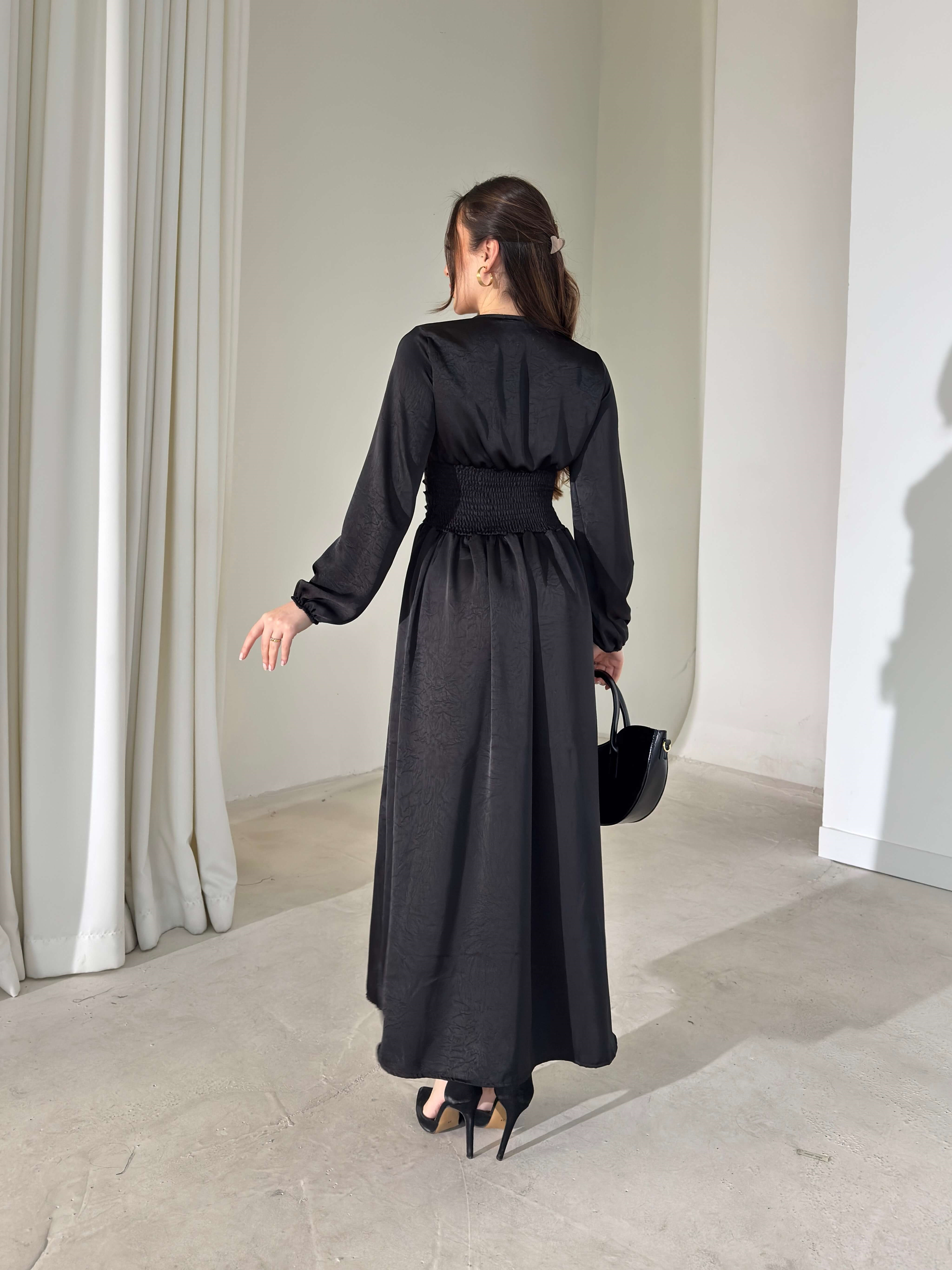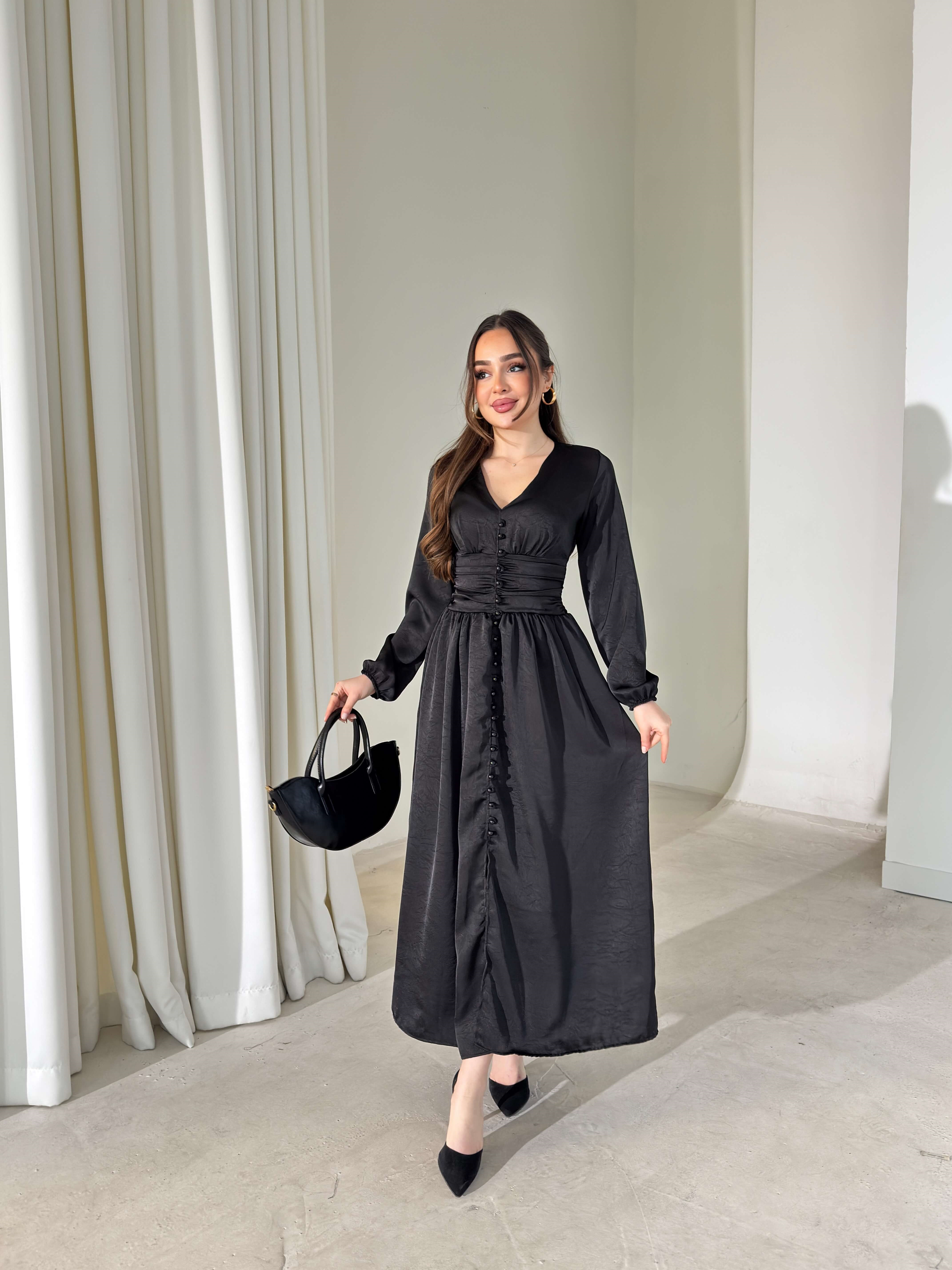 Belden Oturtmalı V Yaka Drapeli Önü Düğmeli Alvire Siyah Kadın Elbise 26Y031 (26Y031)