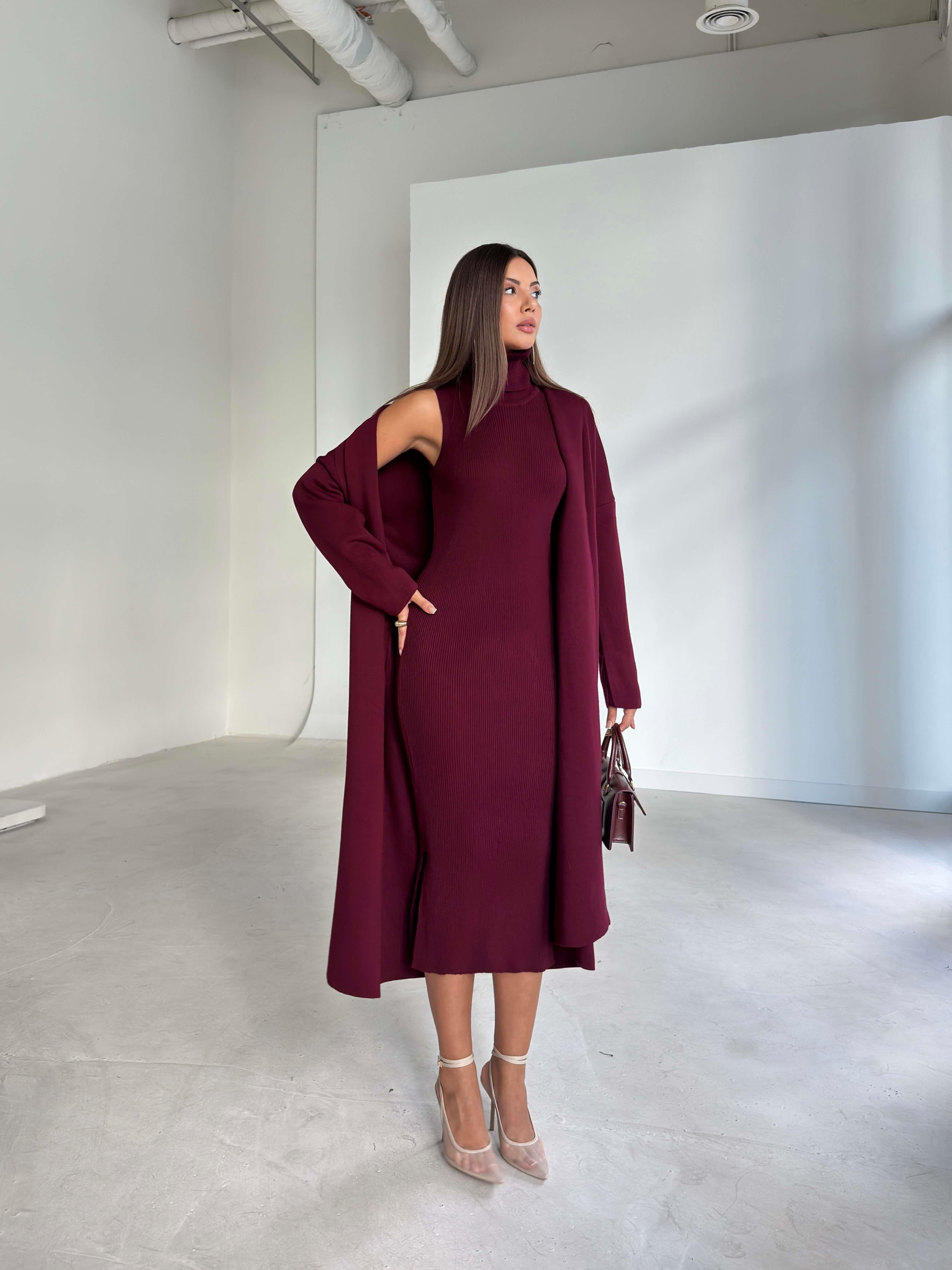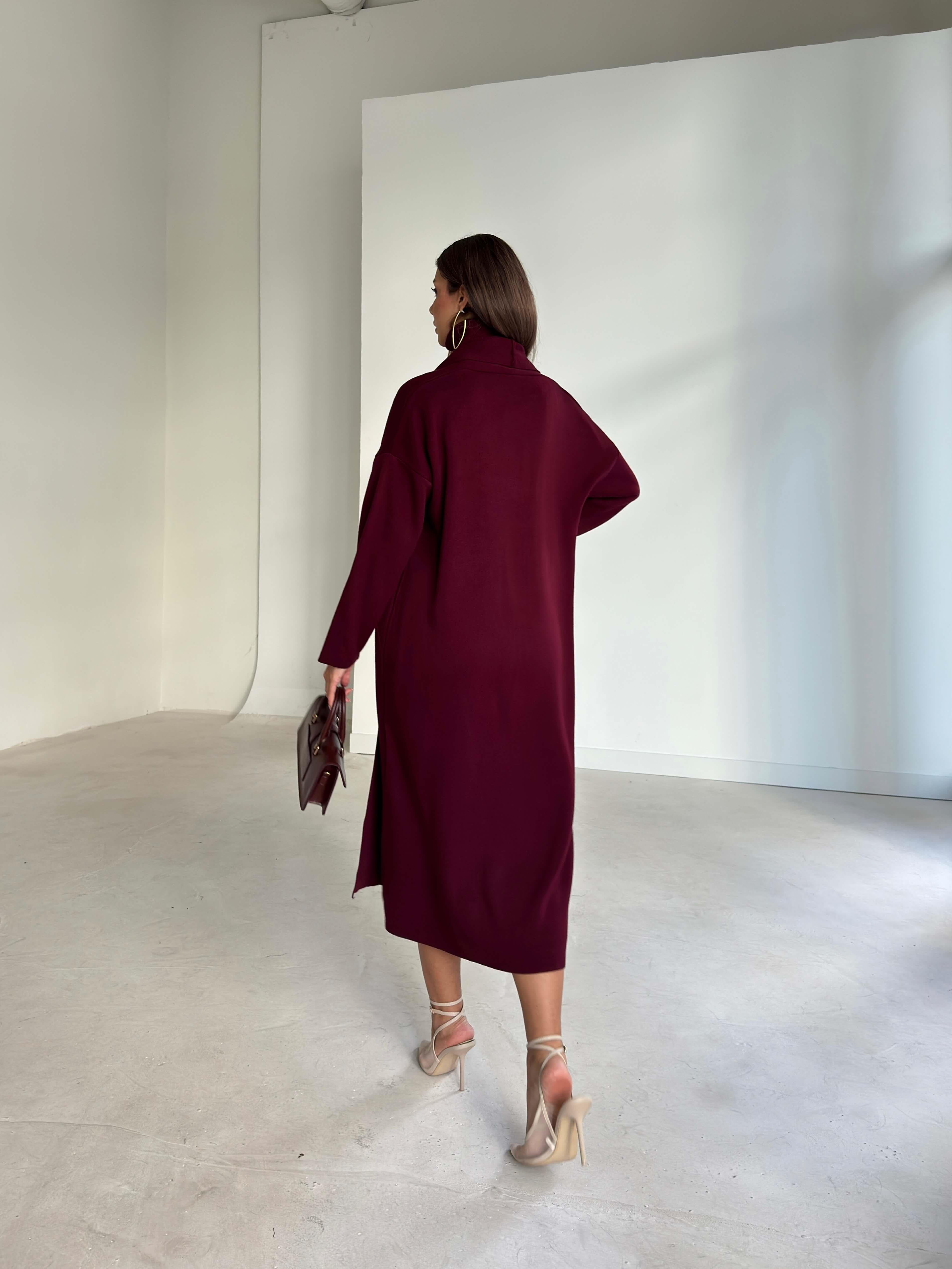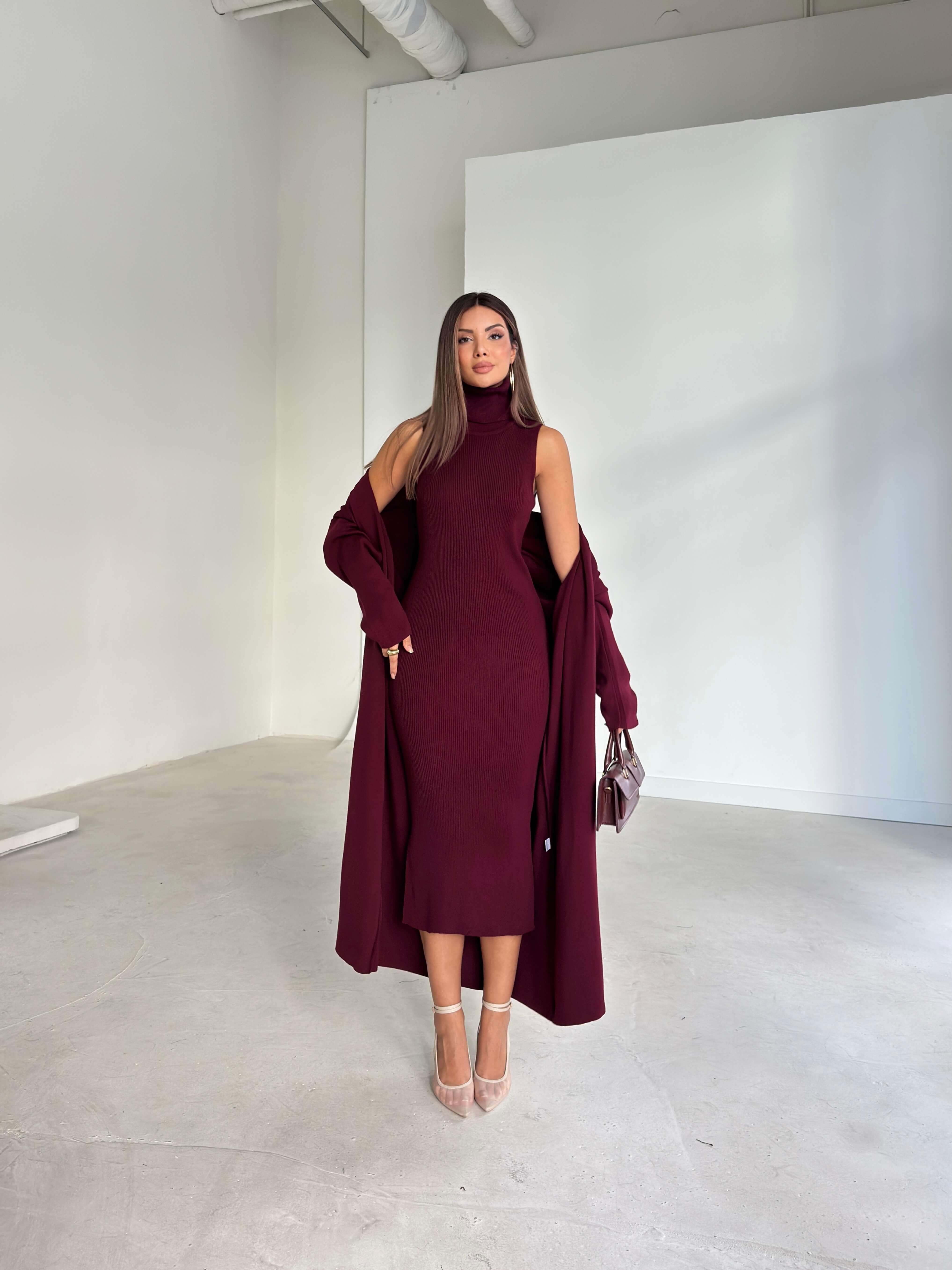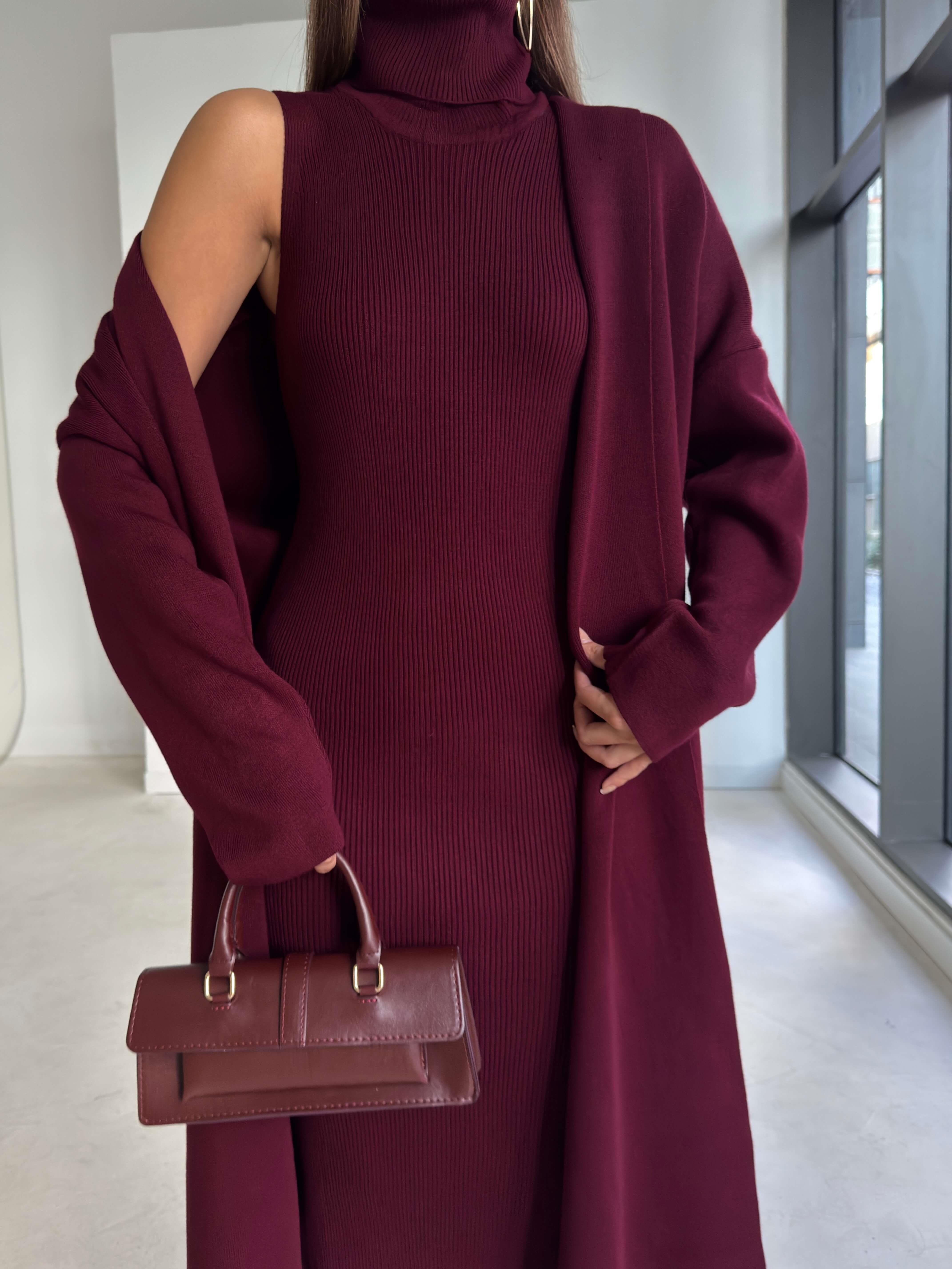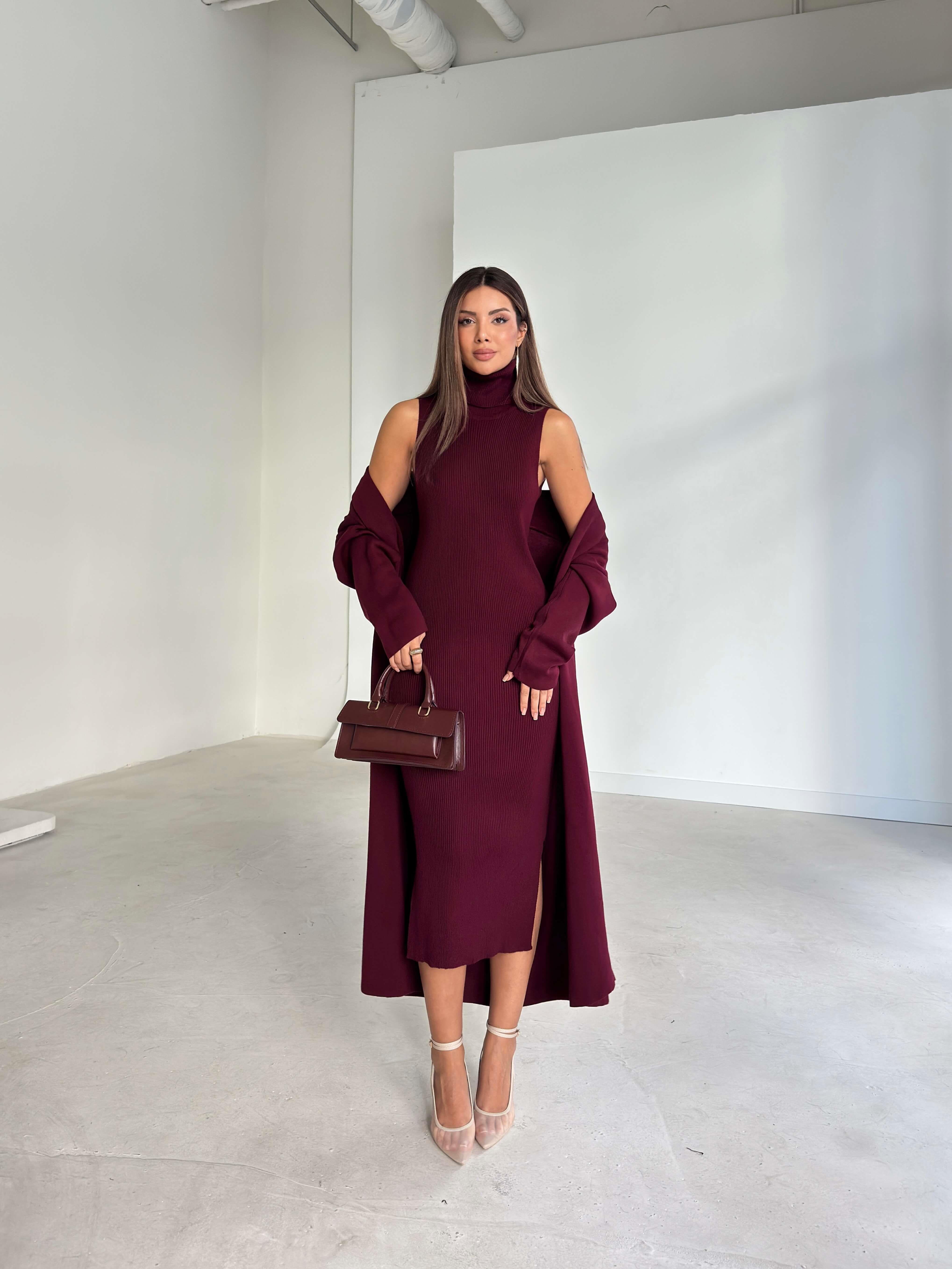 Boğazlı Elbisesi Yırtmaçlı Heldo Kadın Bordo İkili Triko Takım 26K094 (26K094)