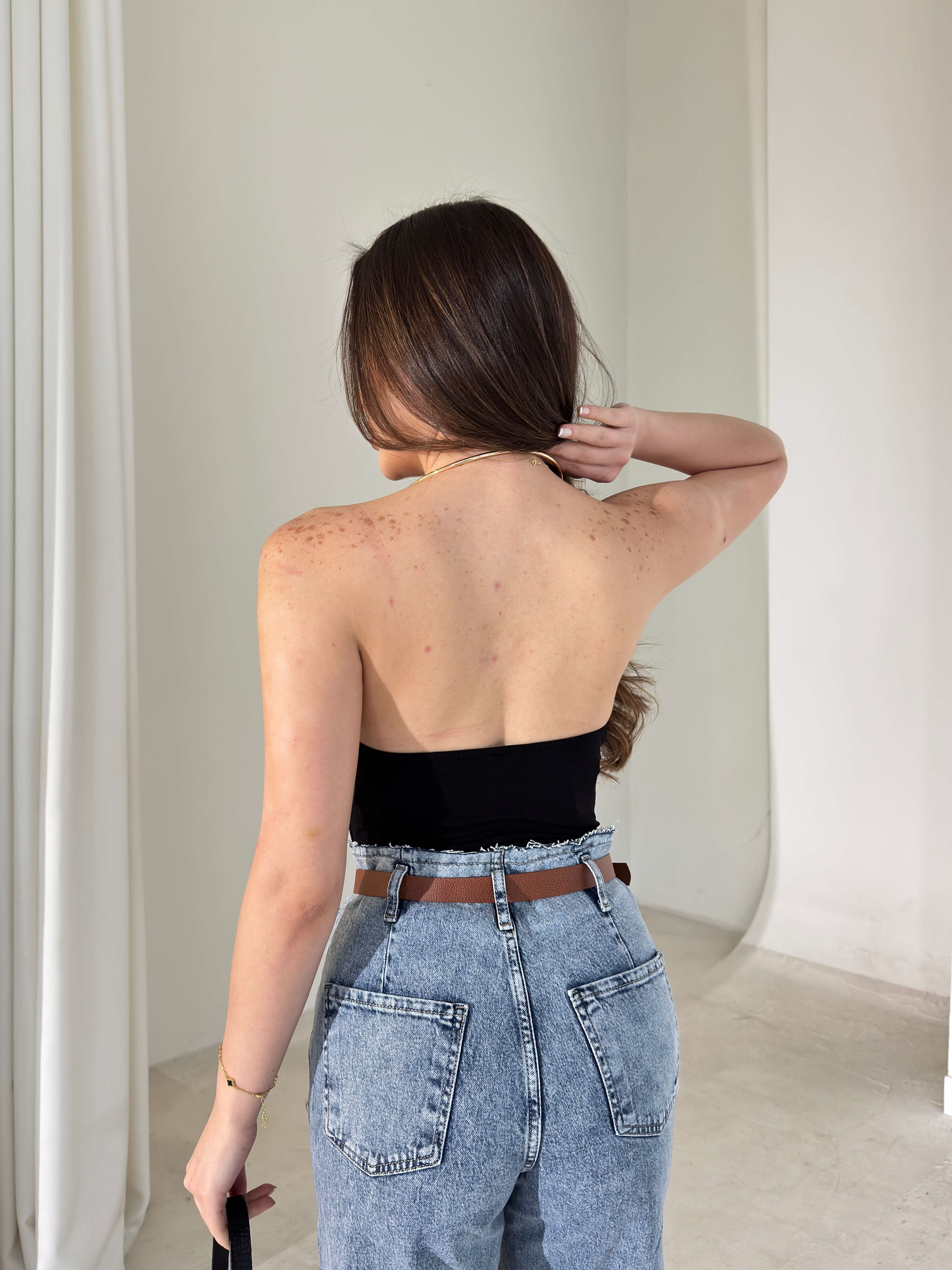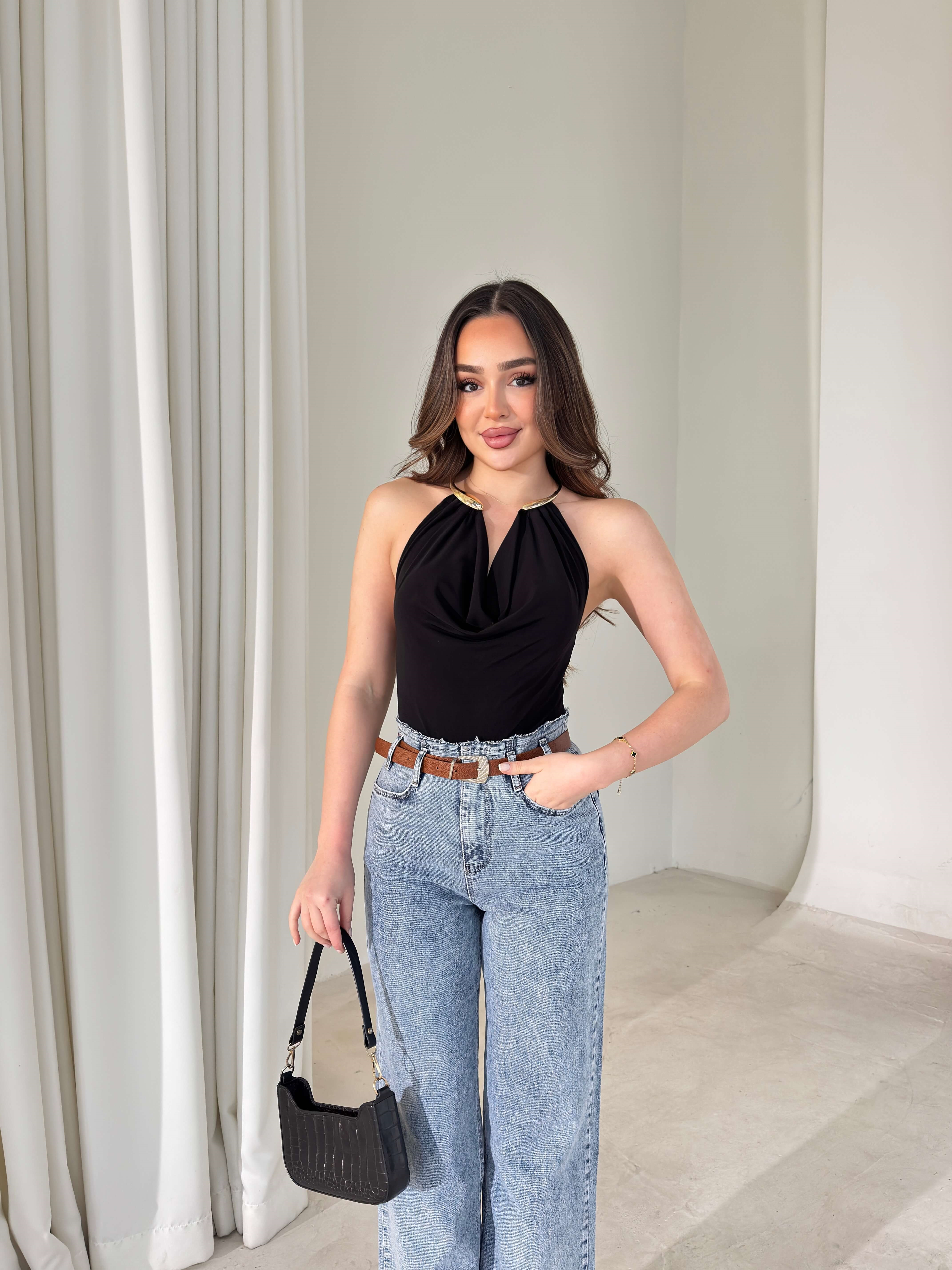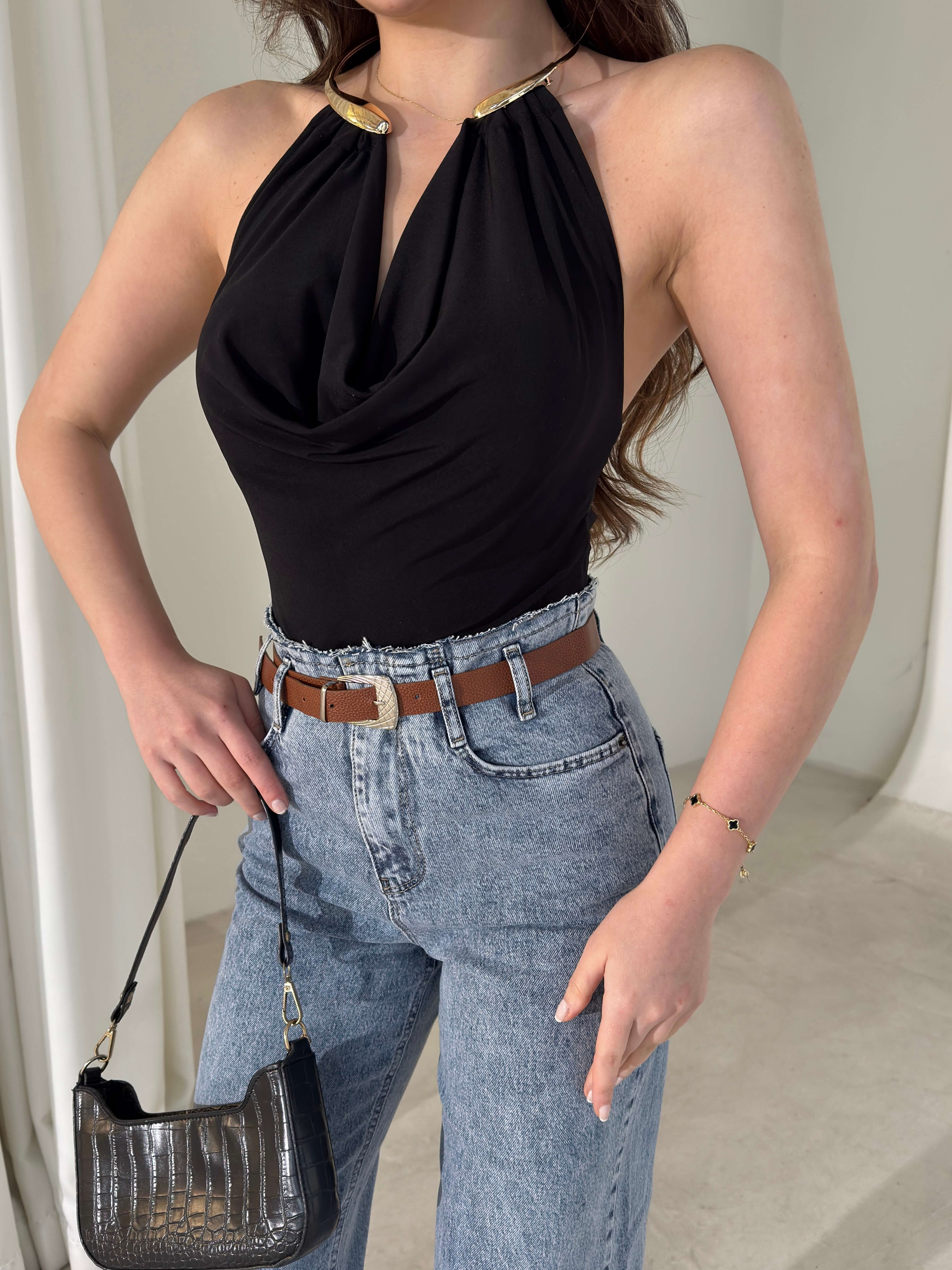 Boyundan Aksesuarlı Degaje Yaka Eolen Siyah Kadın Bodysuit 26Y018 (26Y018)
