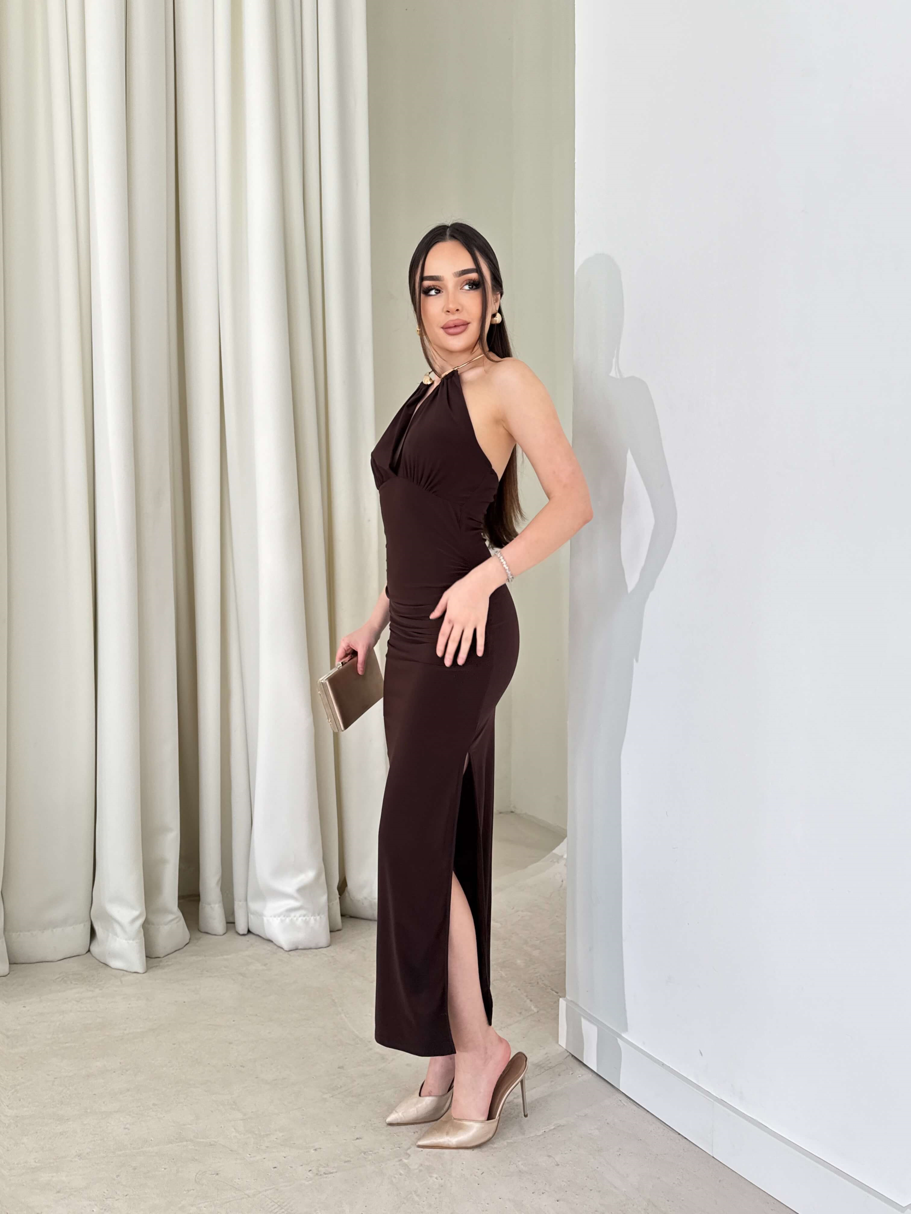 Boyundan Aksesuarlı Yandan Yırtmaçlı V Yaka Lonerme Kahve Kadın Elbise 26Y119 (26Y119)