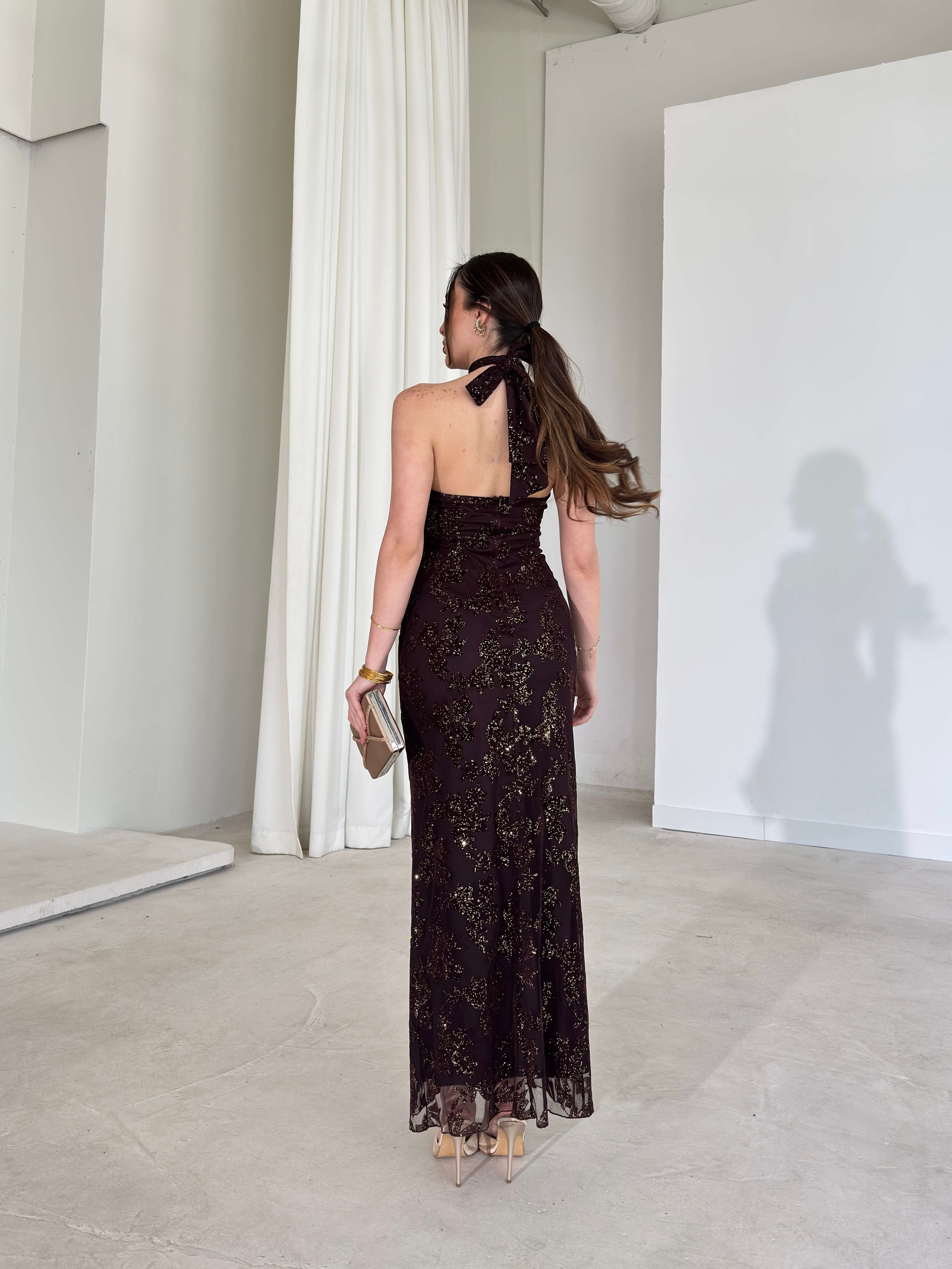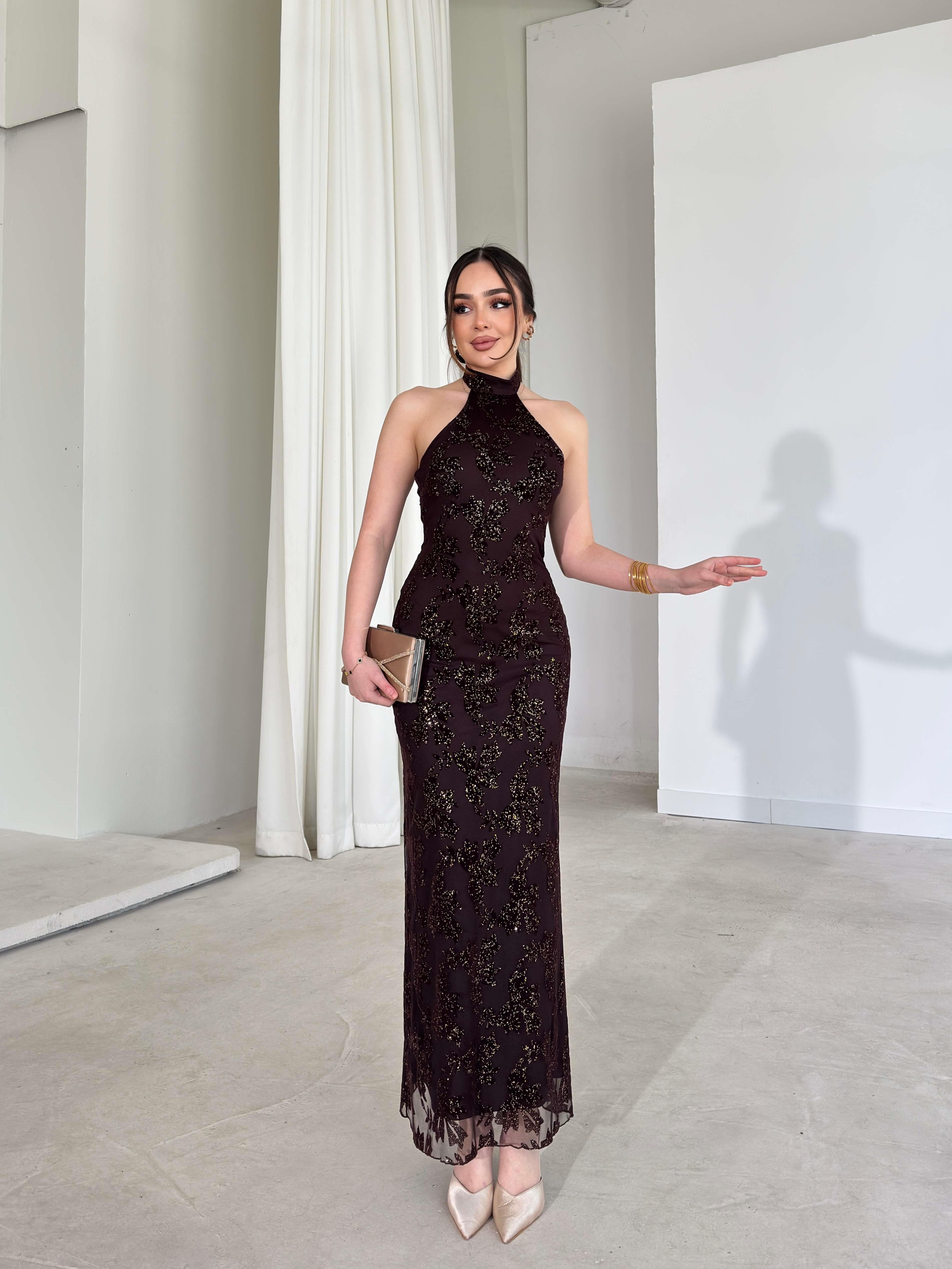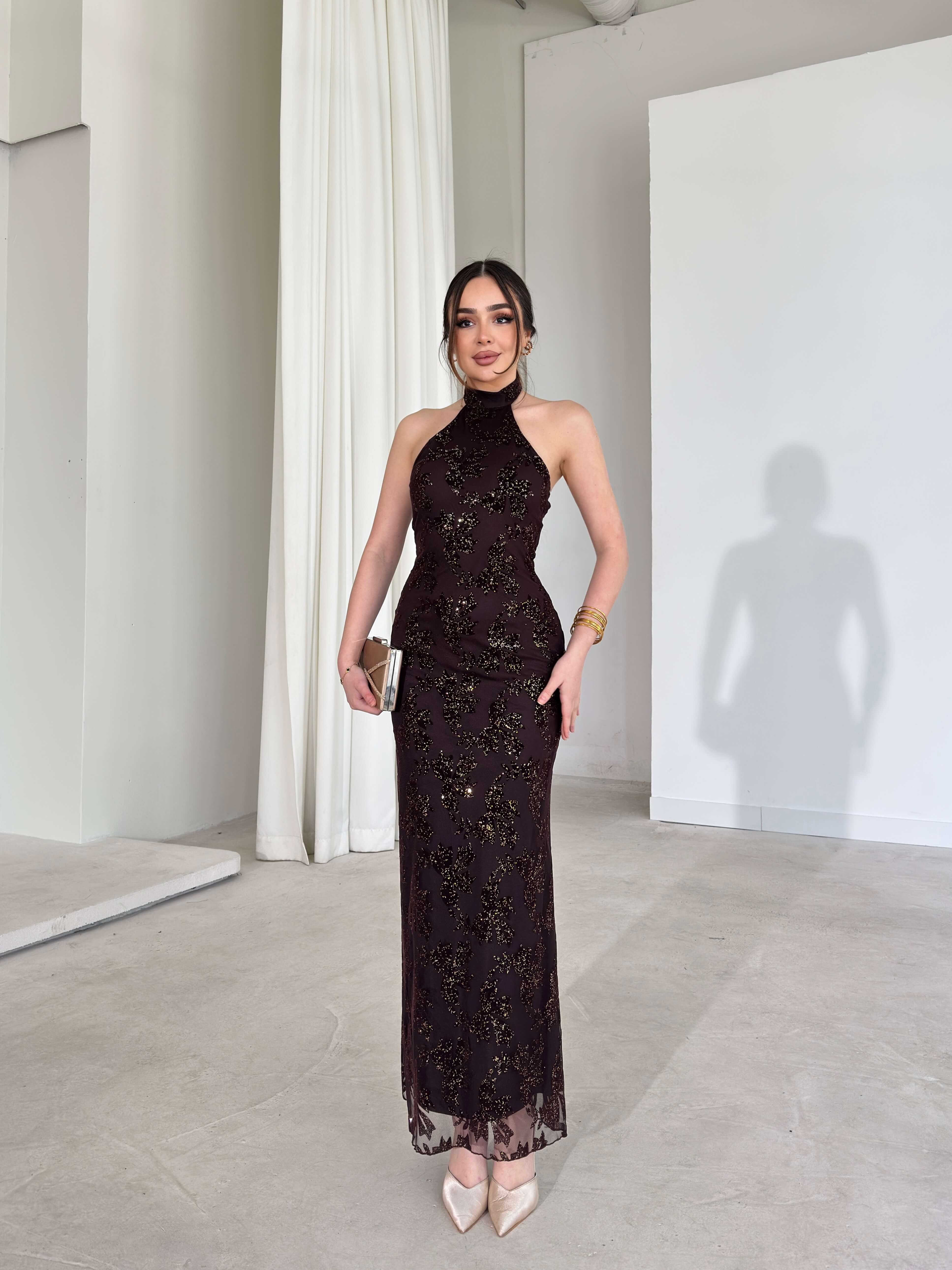 Boyundan Bağlamalı Parlak Simli Desenli Avmo Kahverengi Kadın Elbise 26Y093 (26Y093)