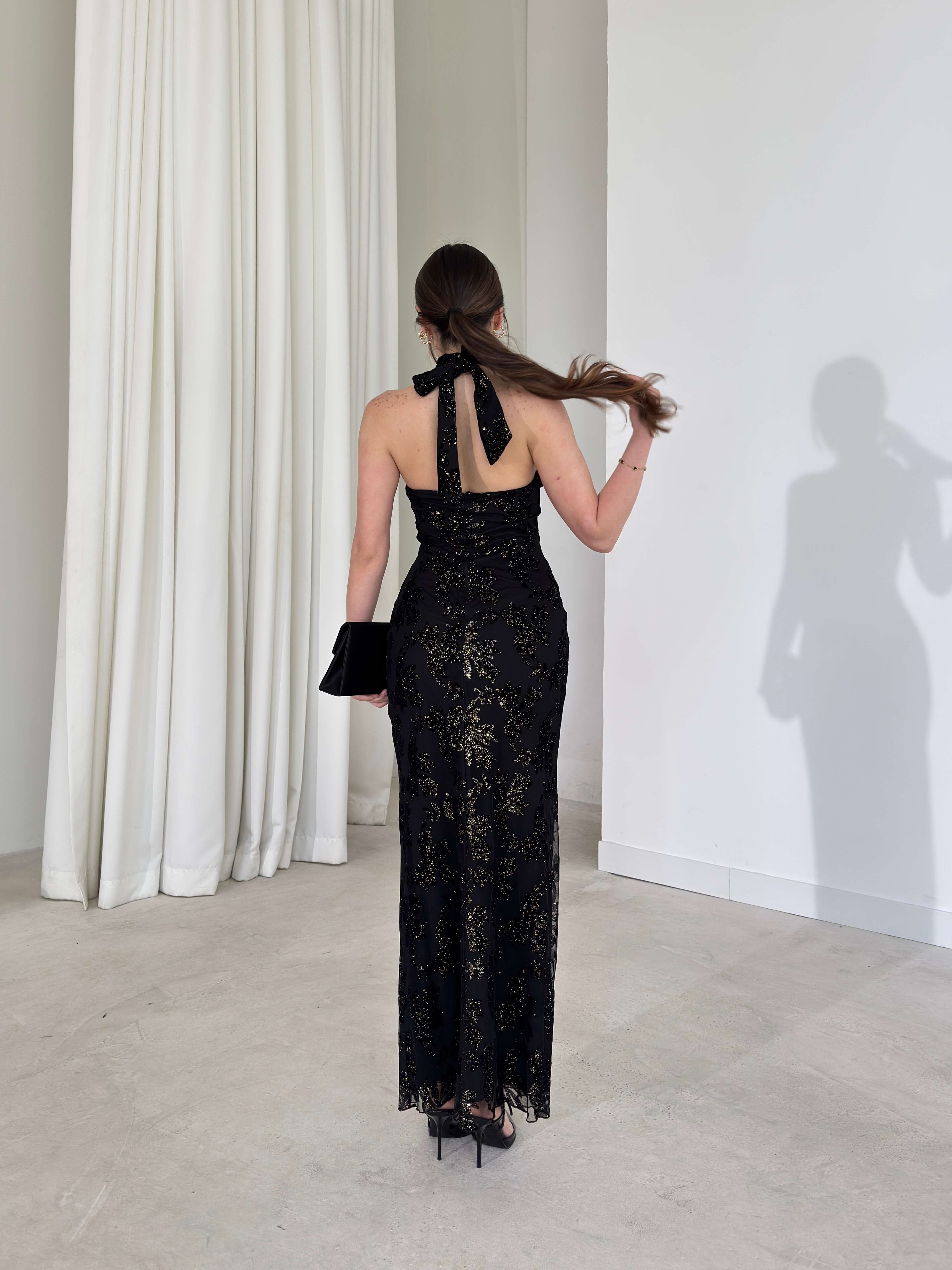 Boyundan Bağlamalı Parlak Simli Desenli Avmo Siyah Kadın Elbise 26Y093 (26Y093)
