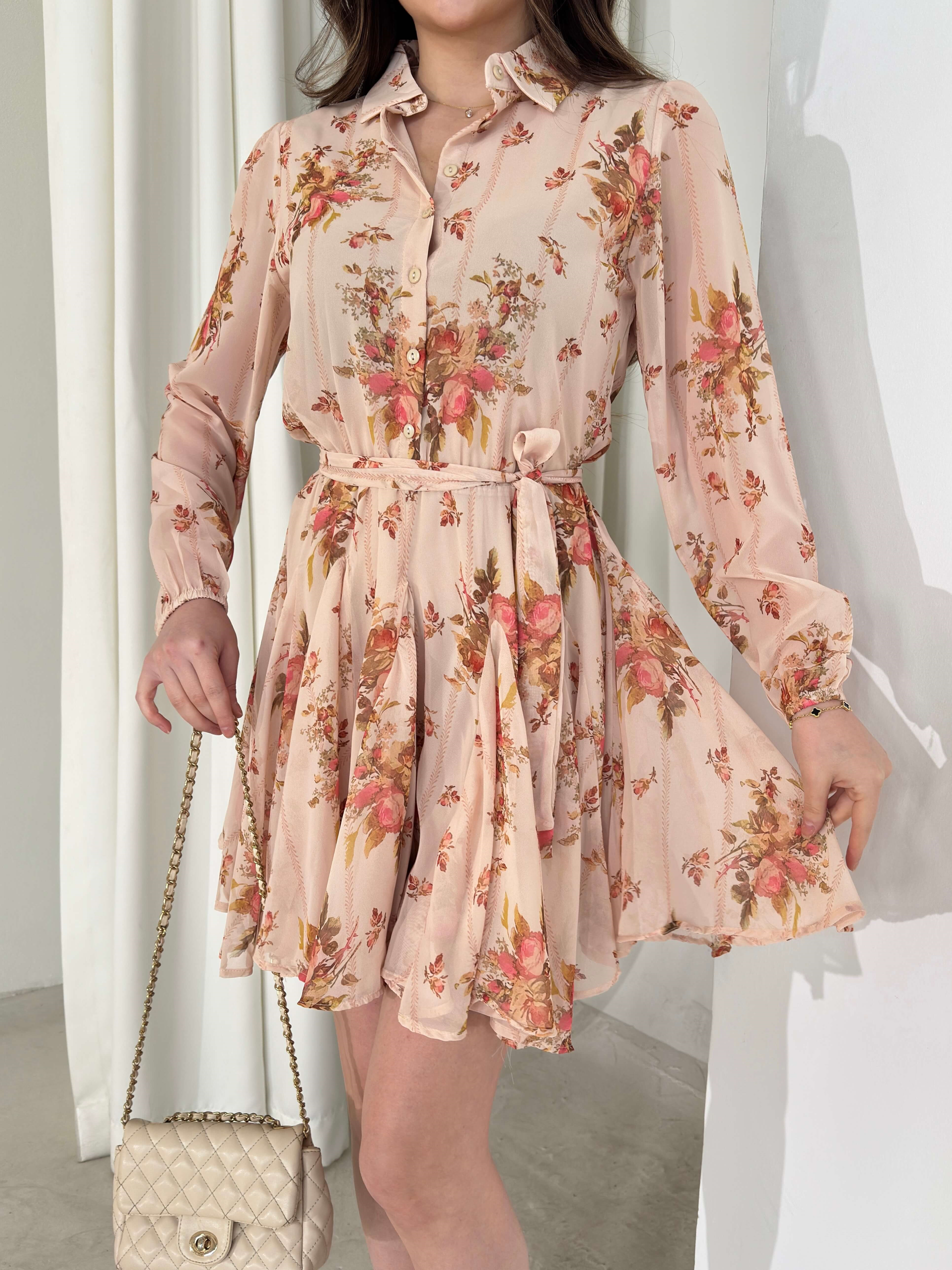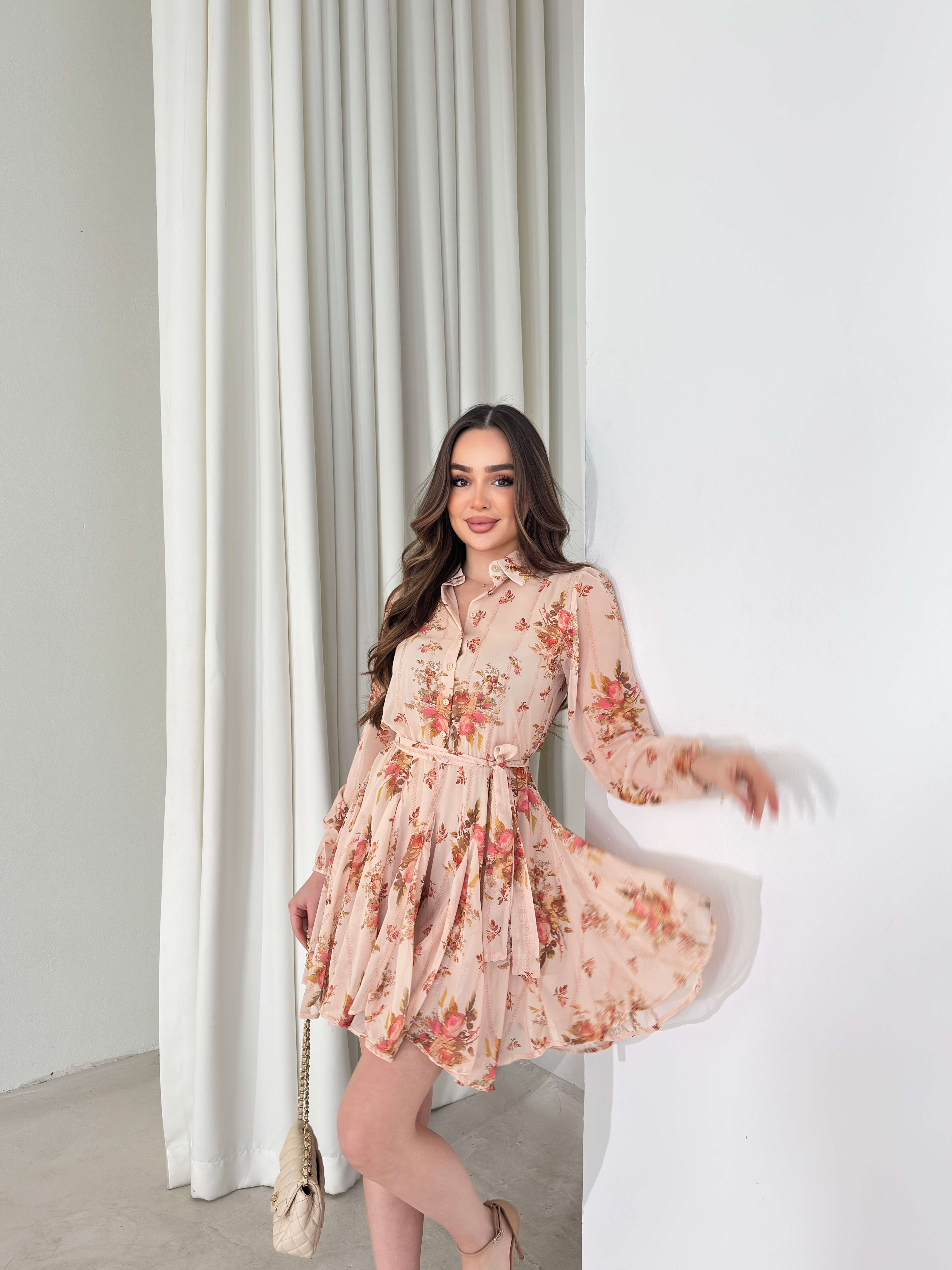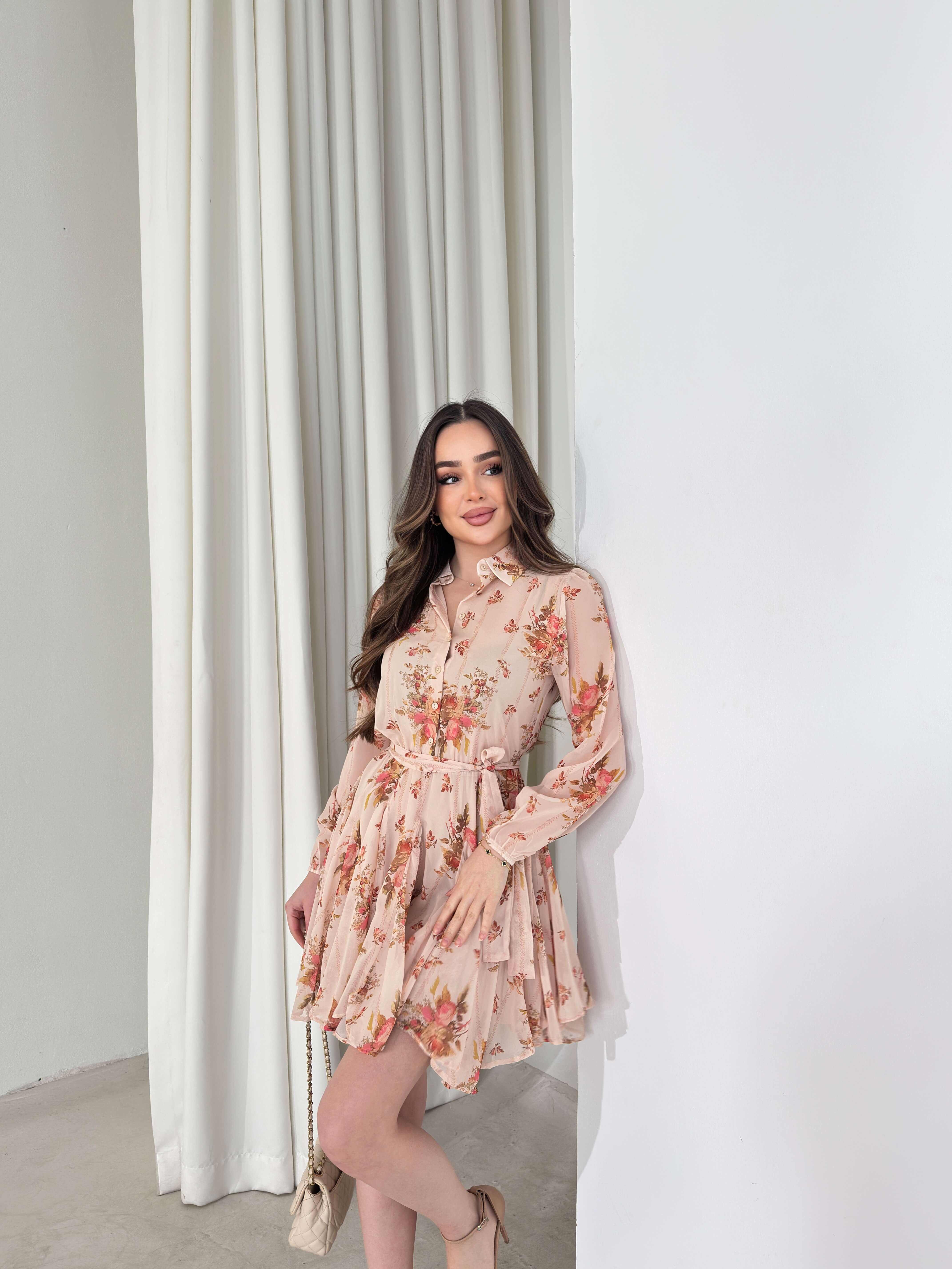Desenli Kemerli Üstü Düğmeli Eteği Pileli İrande Bej Kadın Elbise 26Y023 (26Y023)