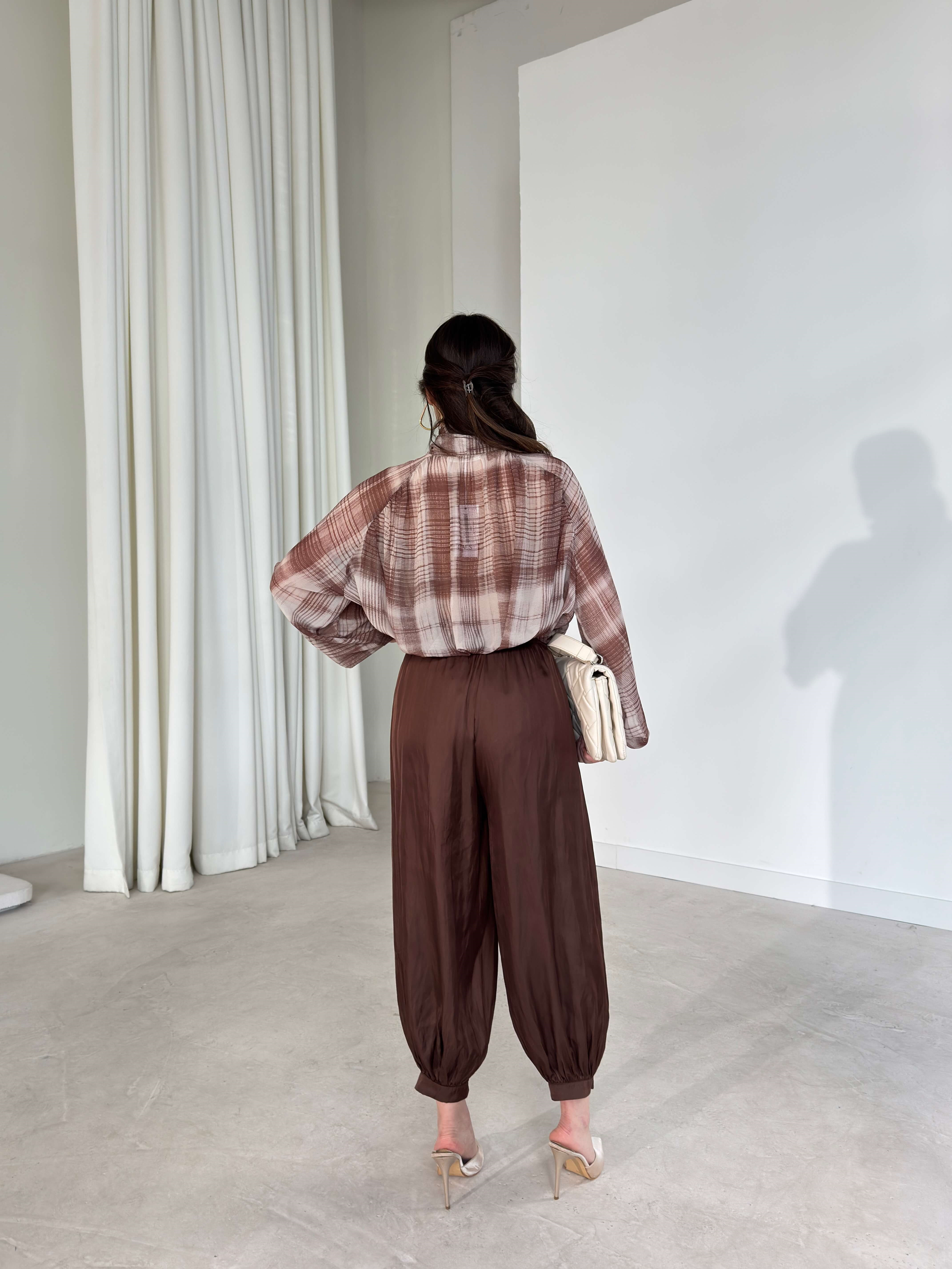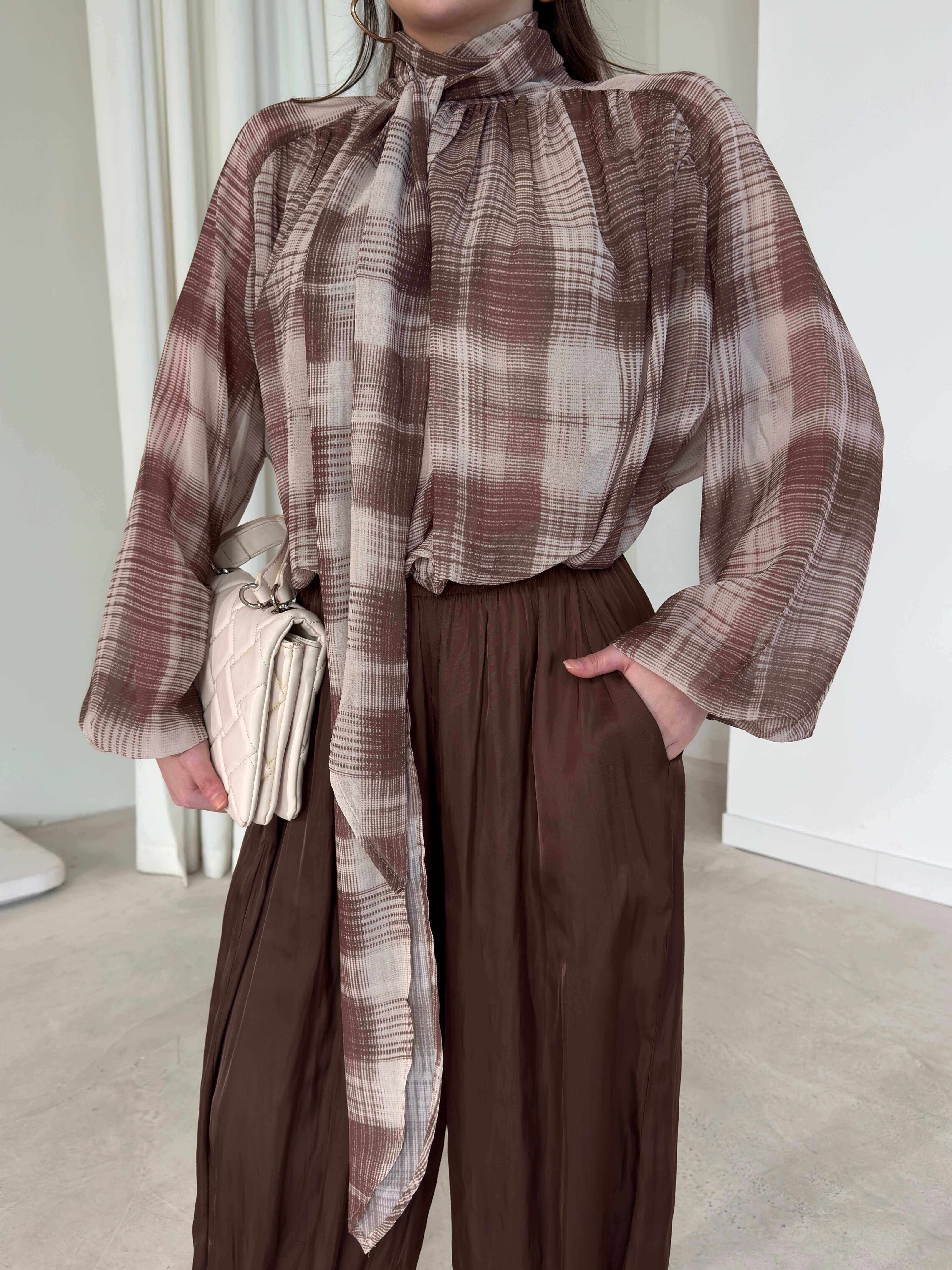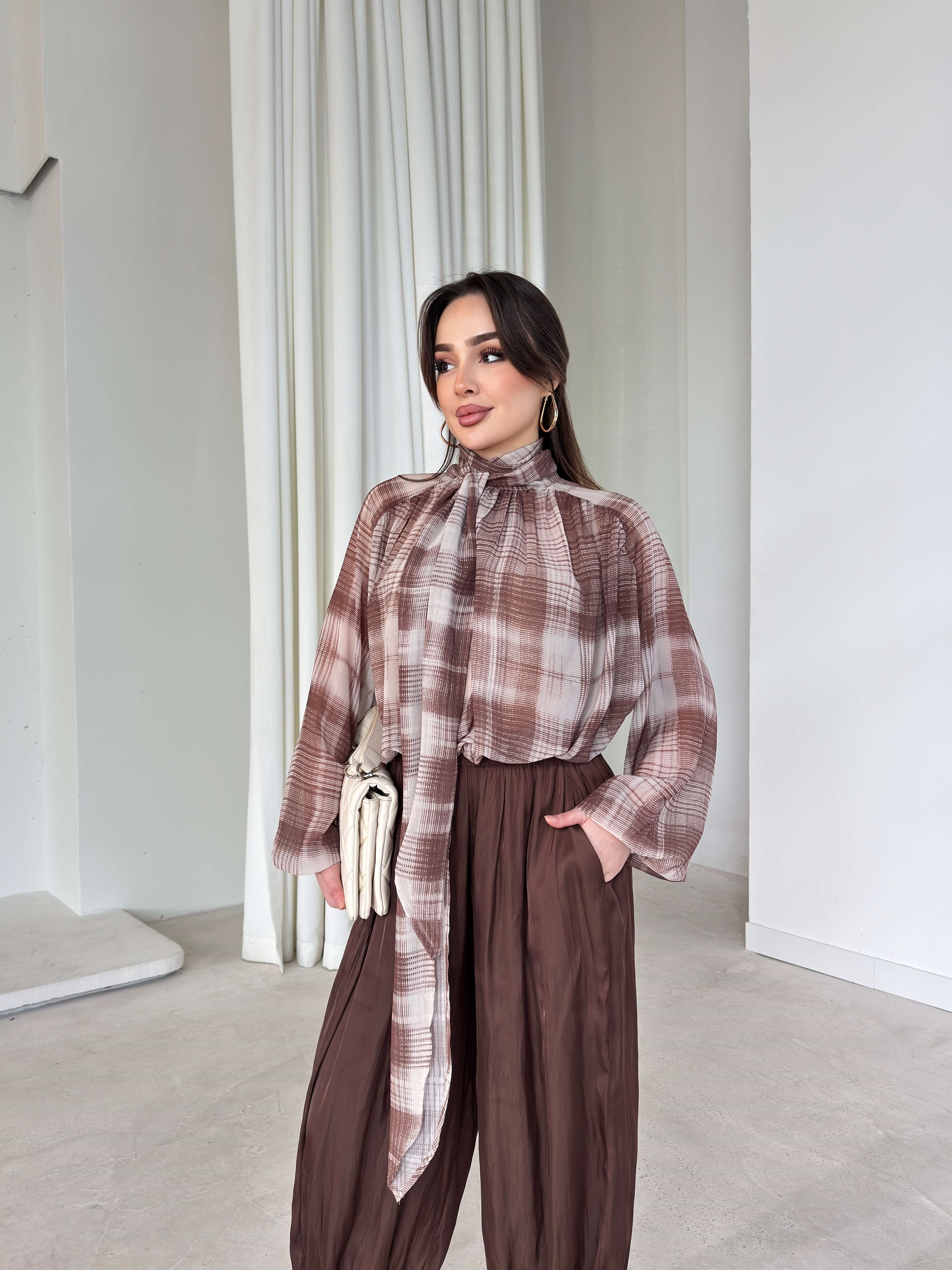 Desenli Transparan Boynu Fularlı Berrin Kahve Kadın Bluz 26Y155 (26Y155)