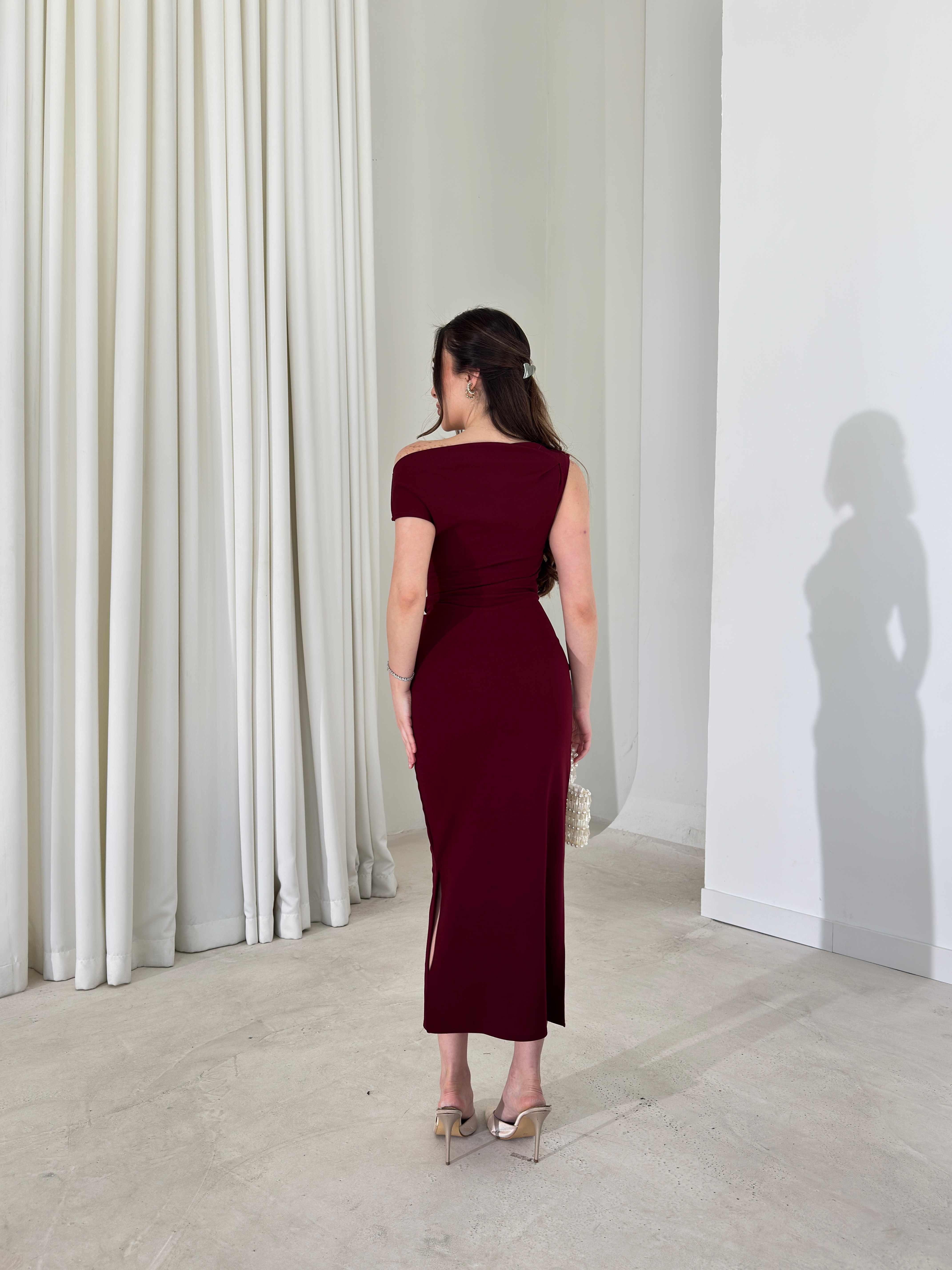 Düşük Omuz Belden Oturtmalı Aksesuar Detaylı Bordo Arves Kadın Elbise 26Y081 (26Y081)