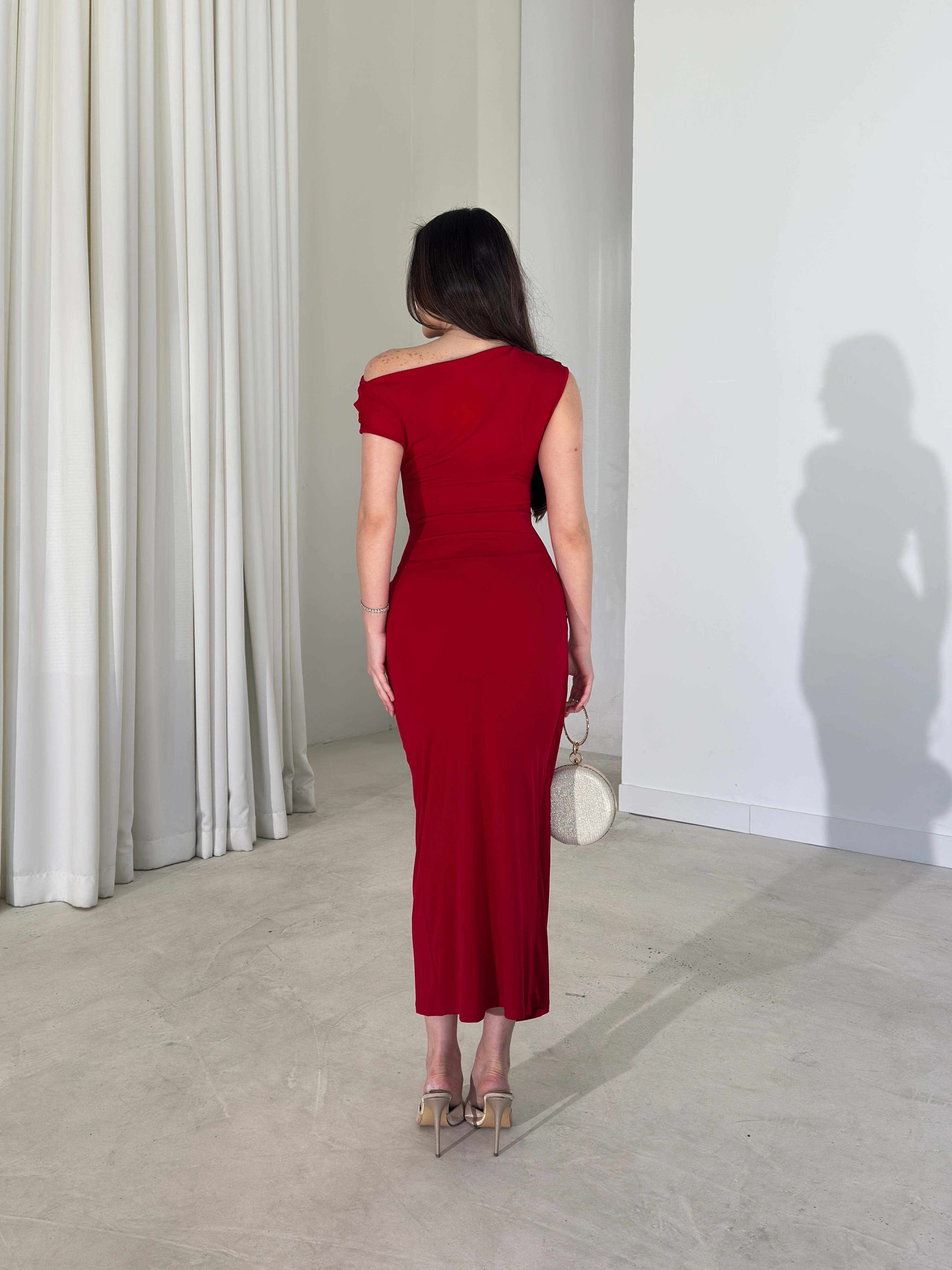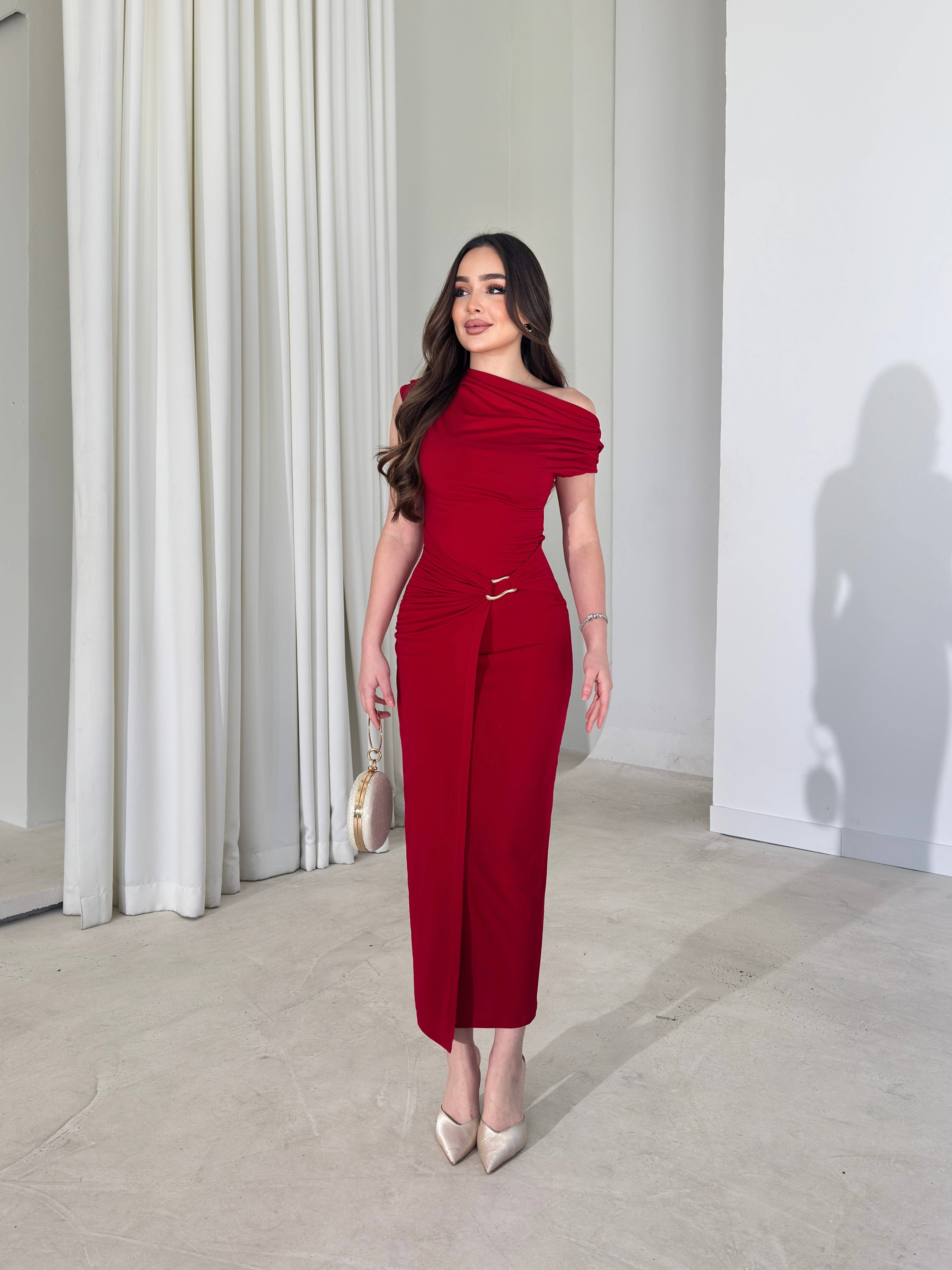 Düşük Omuz Belden Oturtmalı Aksesuar Detaylı Kırmızı Kamrı Kadın Elbise 26Y084 (26Y084)