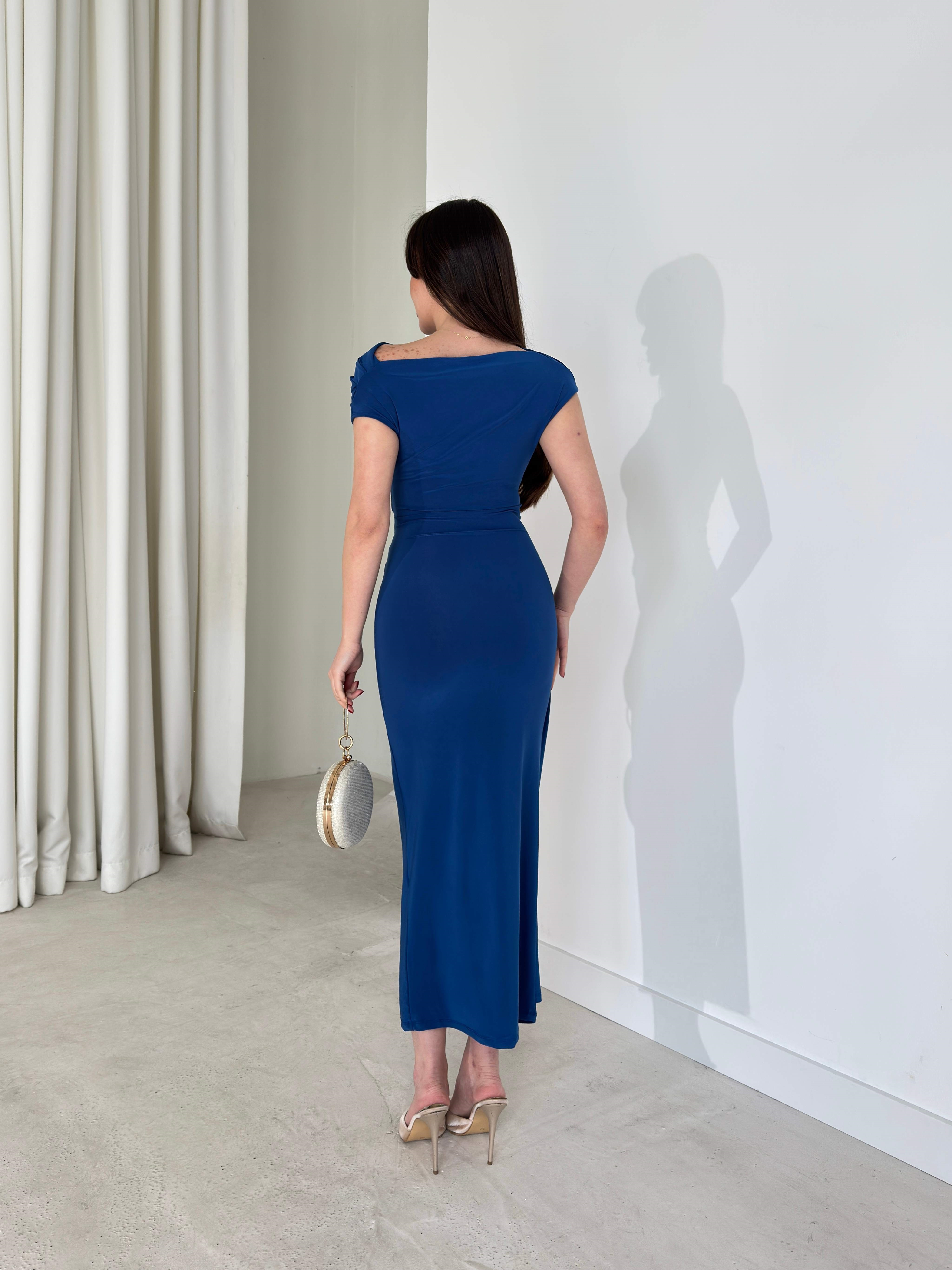 Düşük Omuz Belden Oturtmalı Aksesuar Detaylı Mavi Kamrı Kadın Elbise 26Y084 (26Y084)