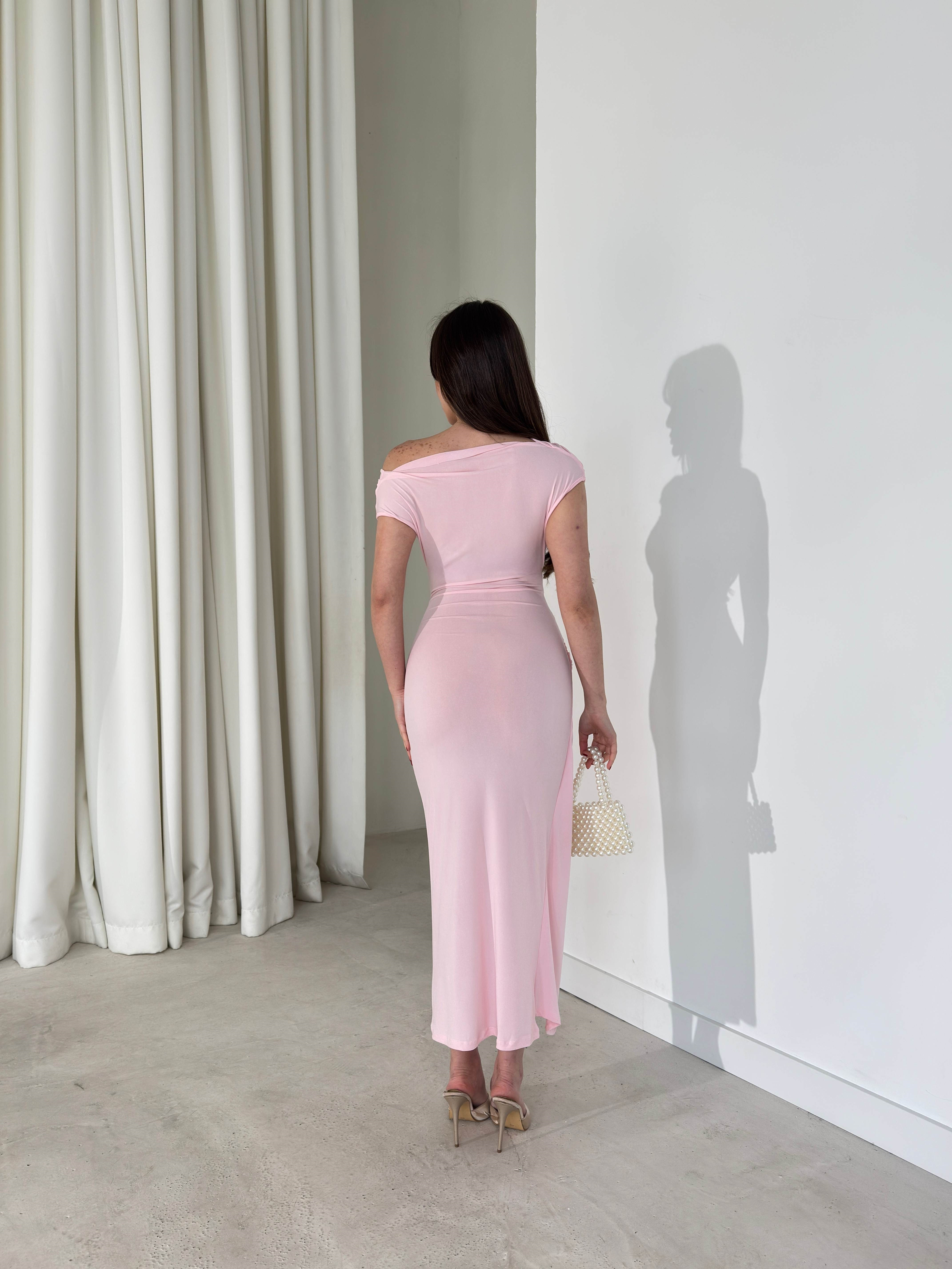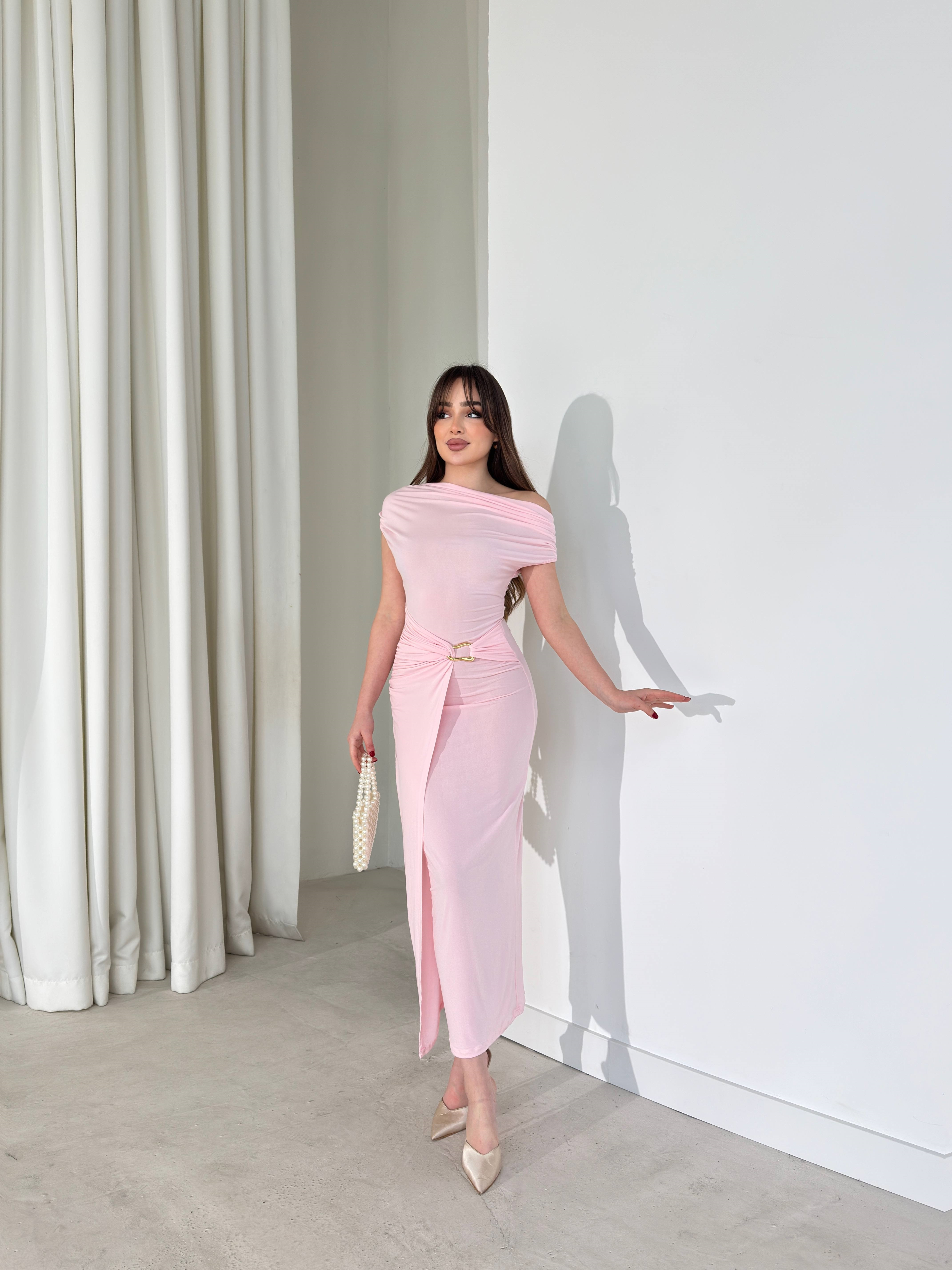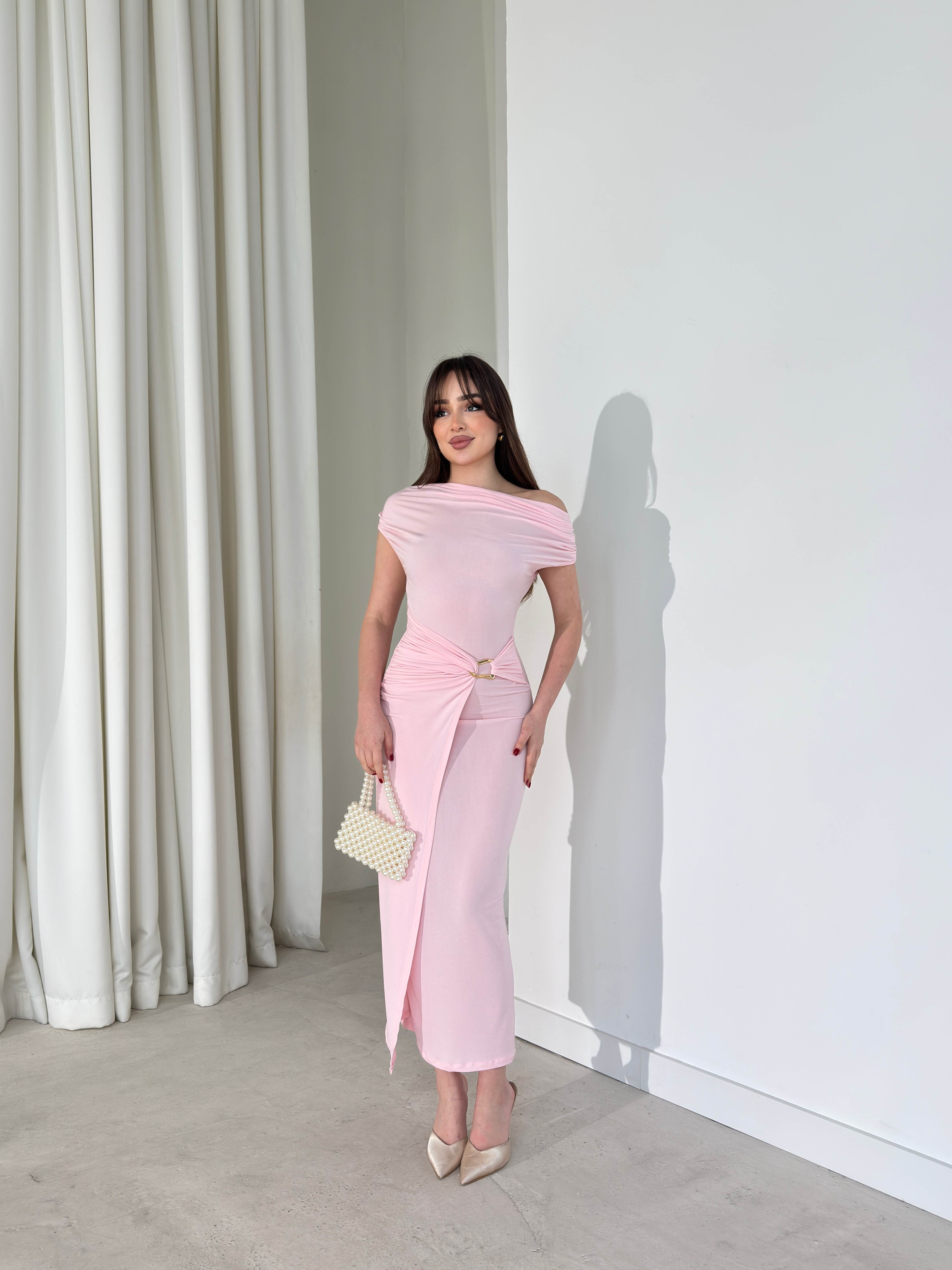 Düşük Omuz Belden Oturtmalı Aksesuar Detaylı Toz Pembe Kamrı Kadın Elbise 26Y084 (26Y084)
