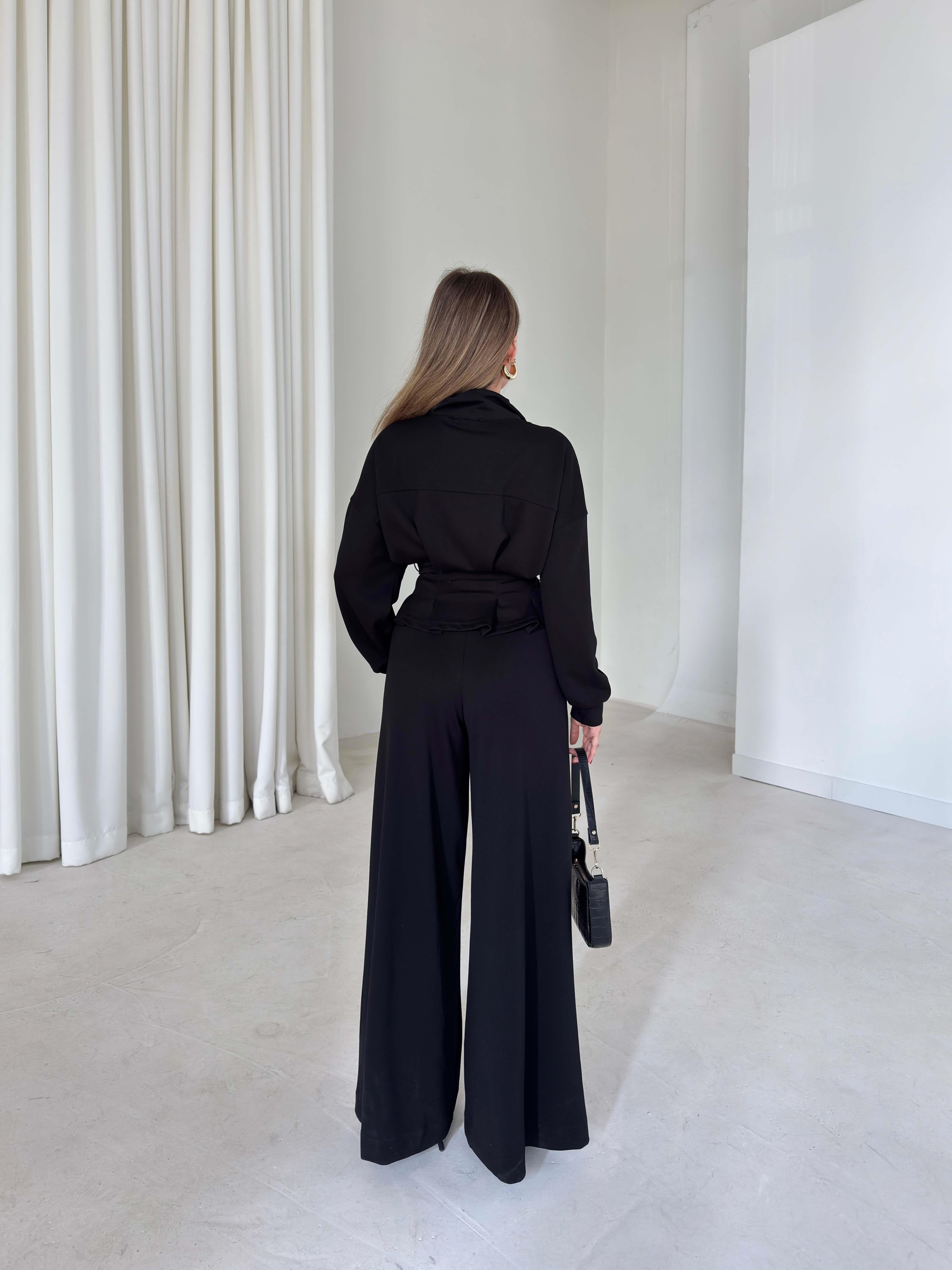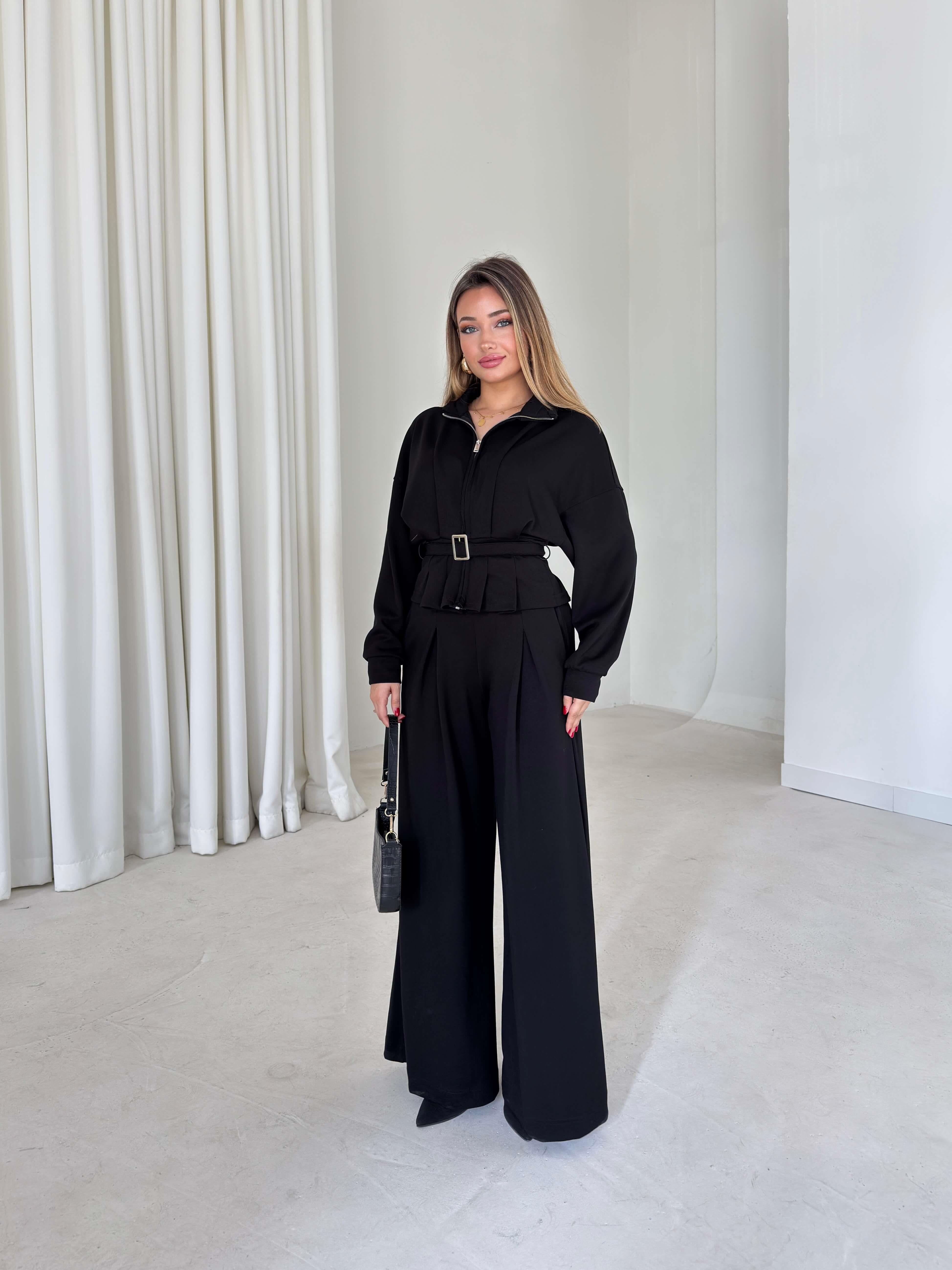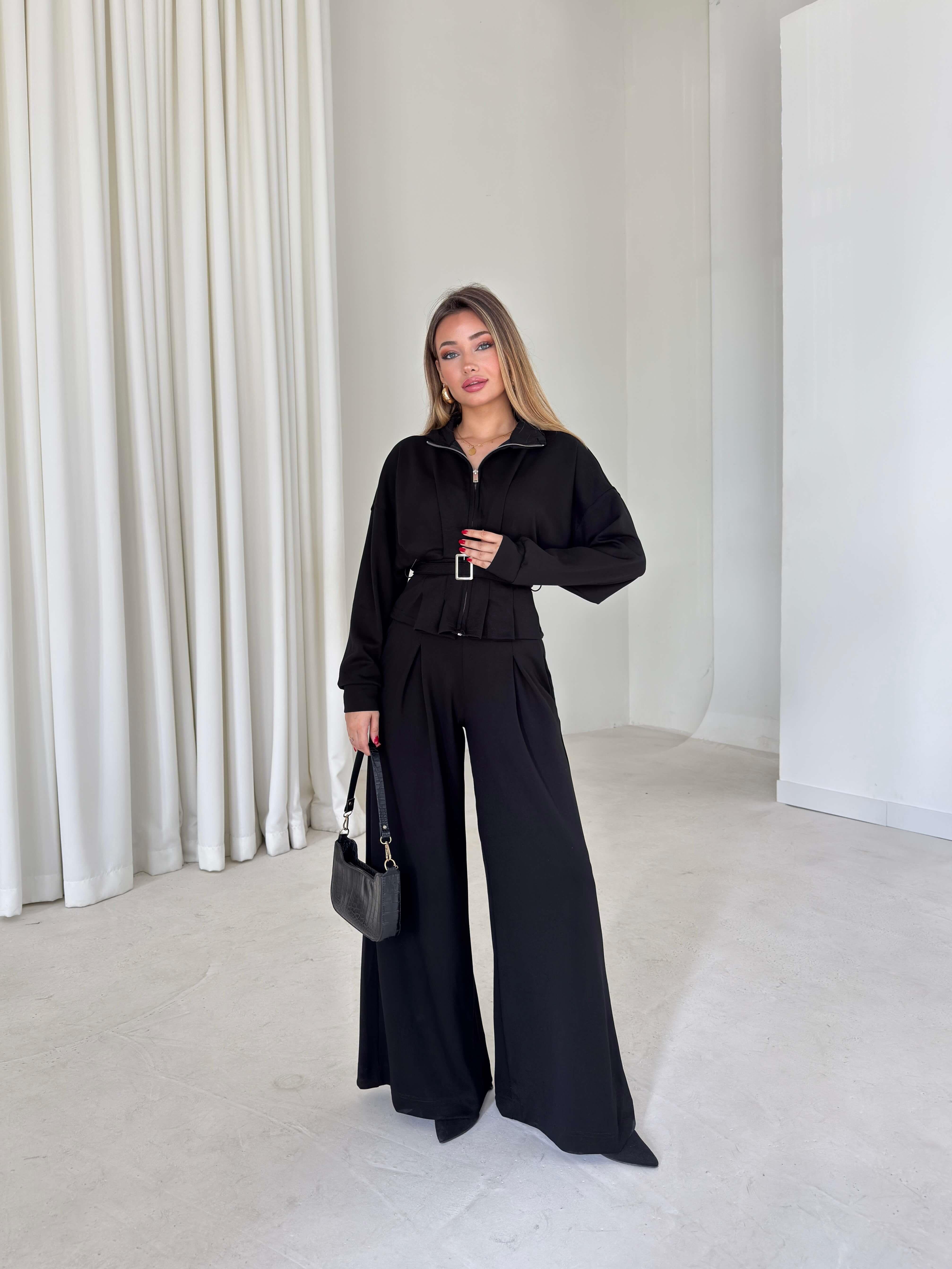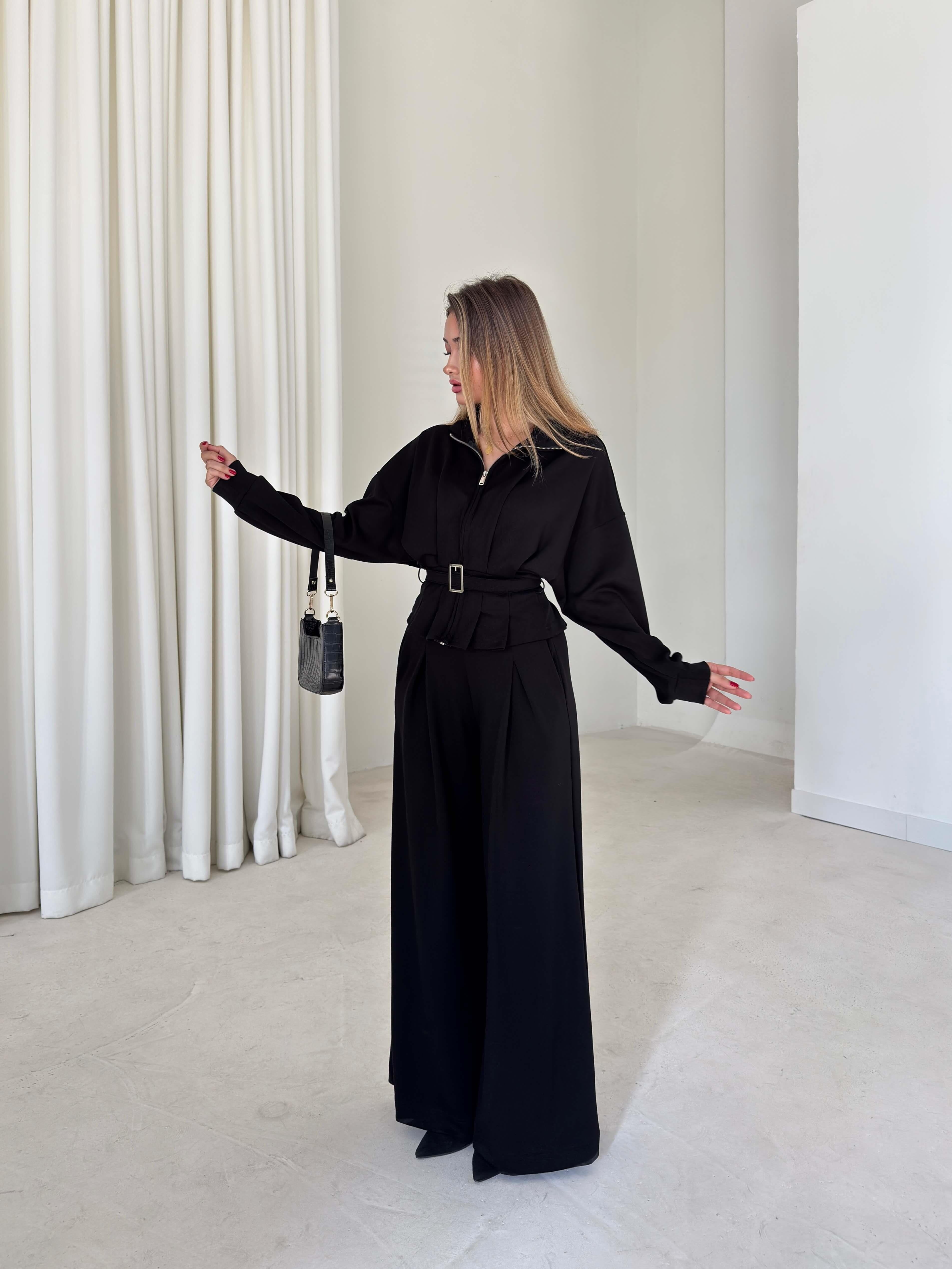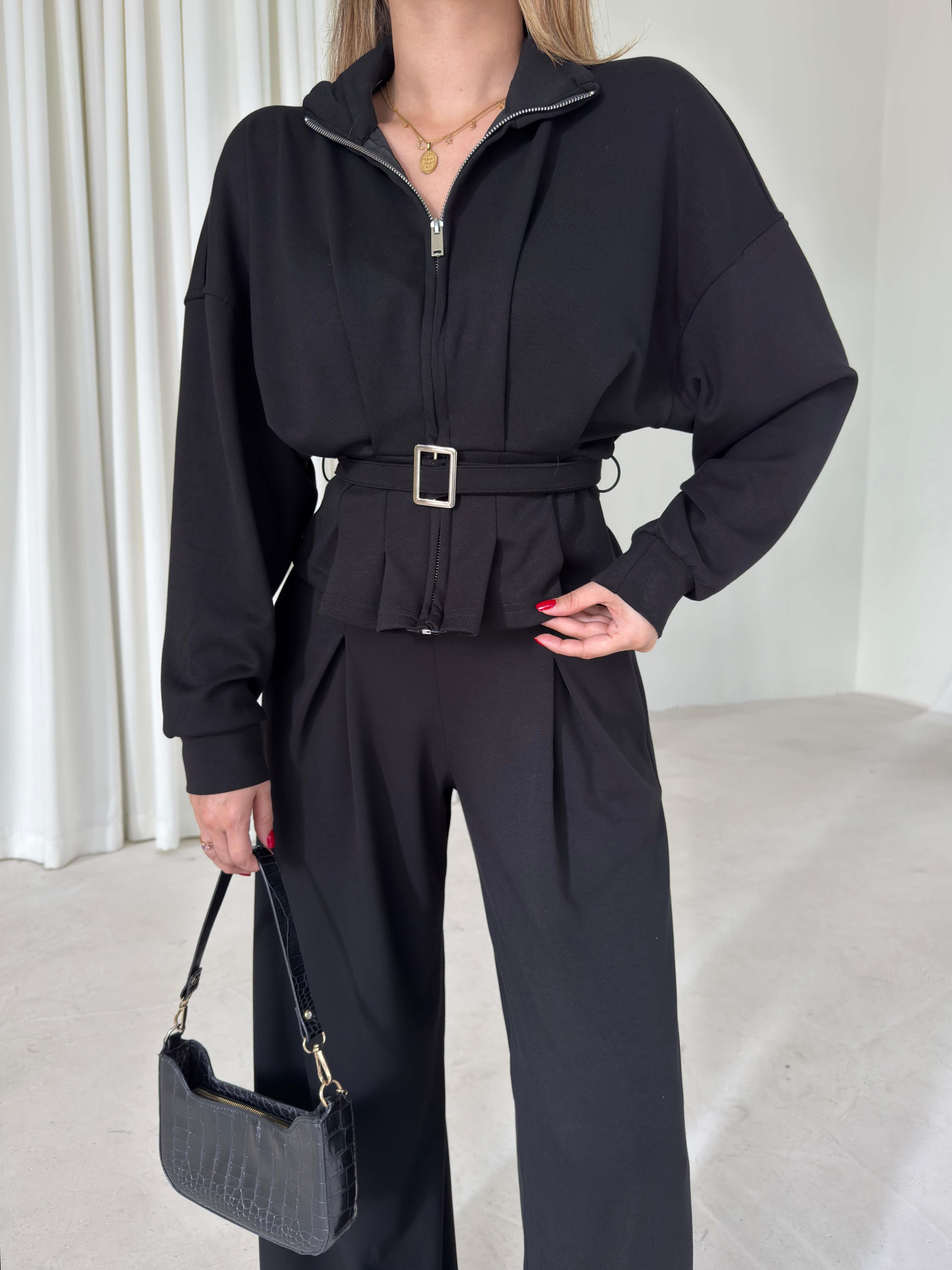 Fermuar Detaylı Beli Kemerli Alt Kısmı Pileli Herli Siyah Kadın İkili Takım 26K126 (26K126)