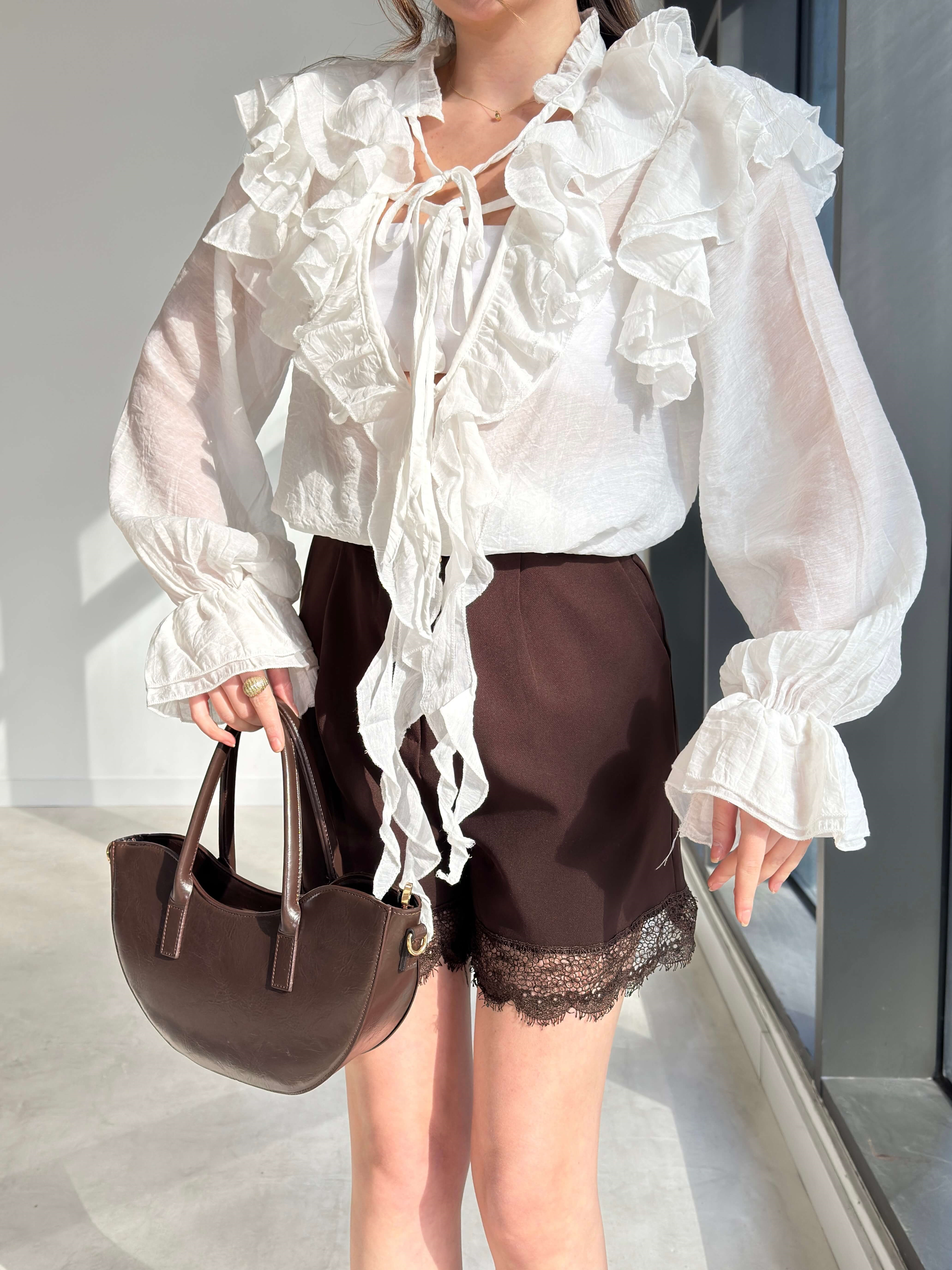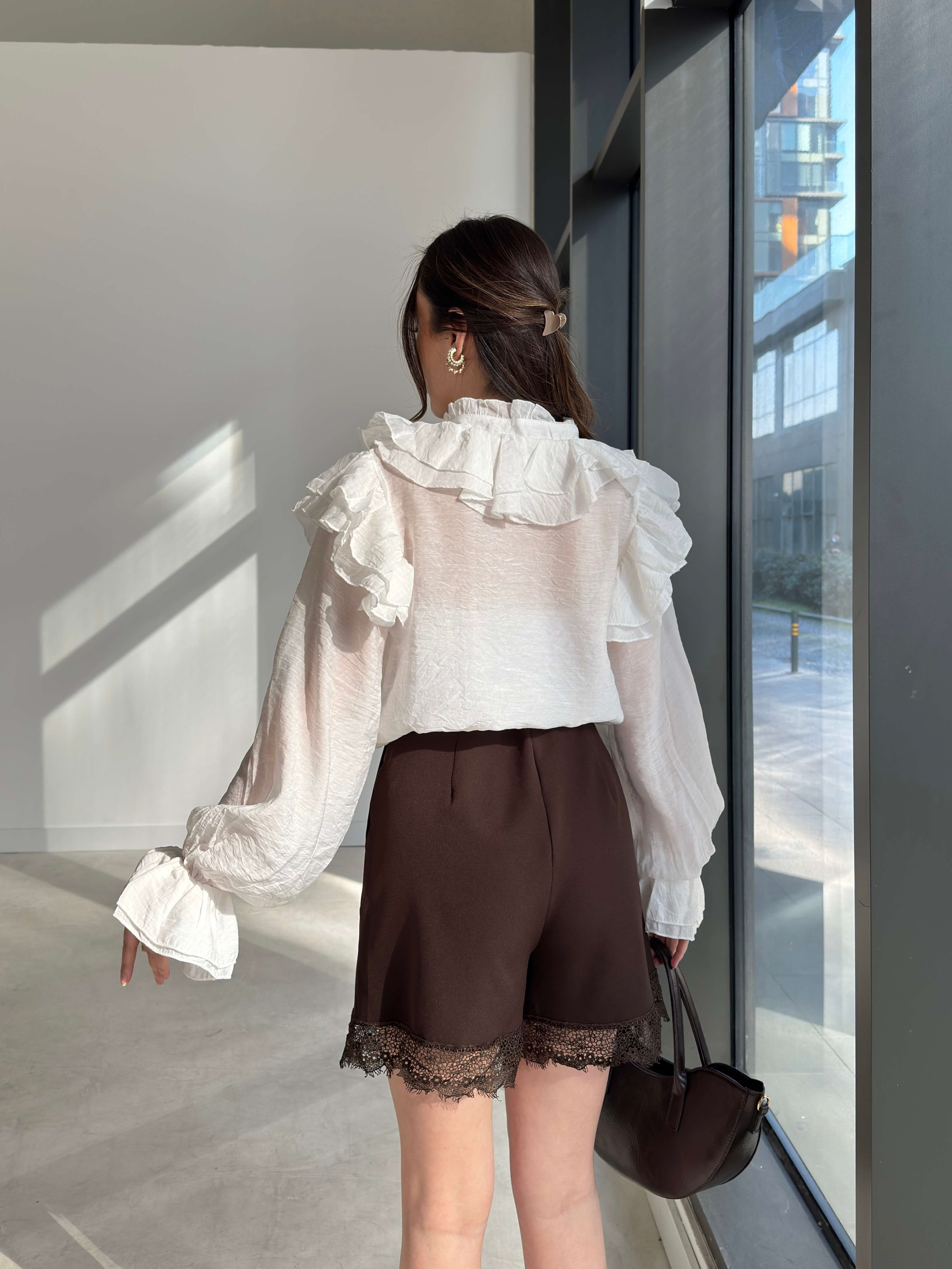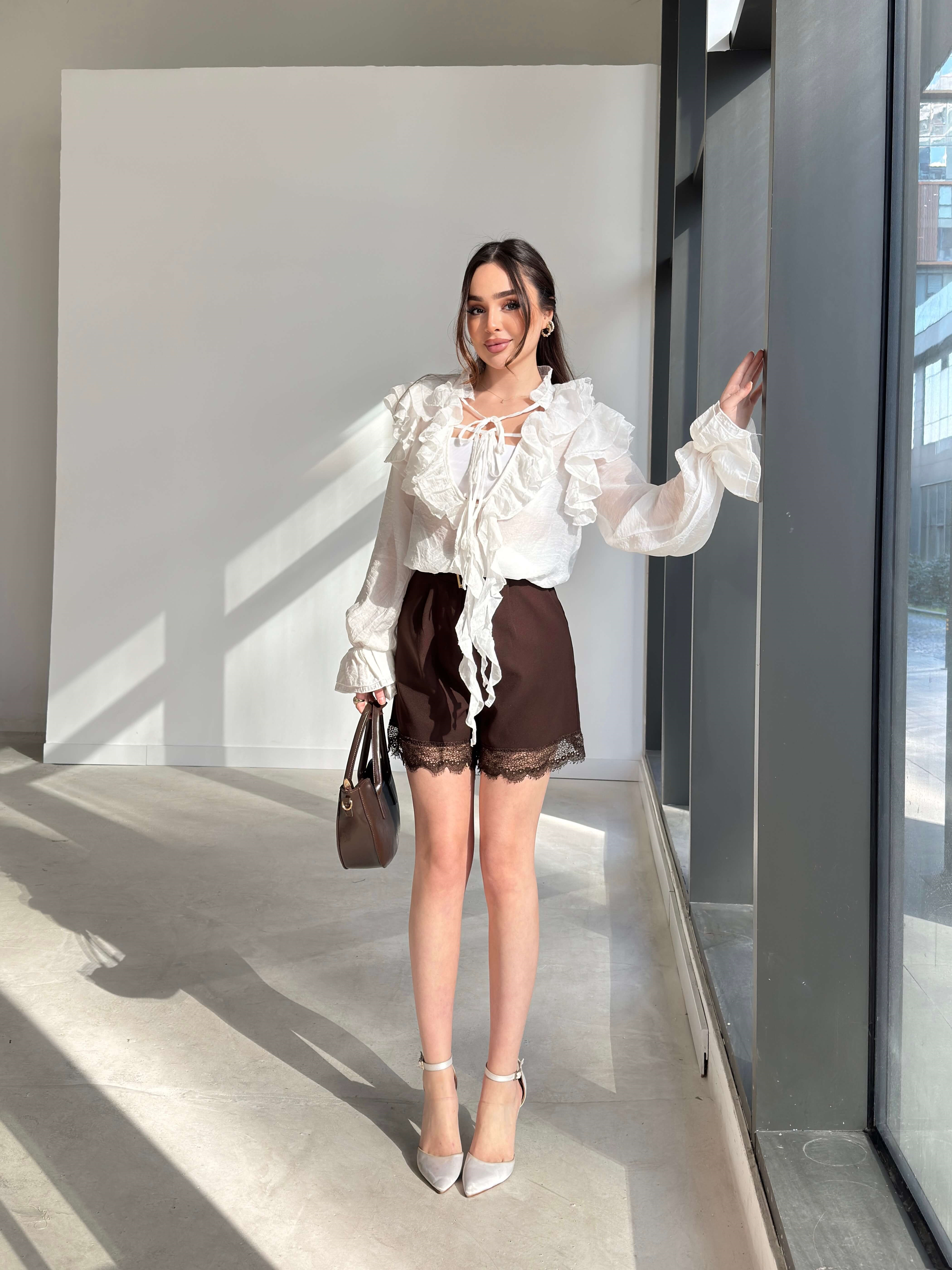 Fırfır Detaylı İp Bağlamalı V Yaka Senro Ekru Kadın Gömlek 26Y035 (26Y035)
