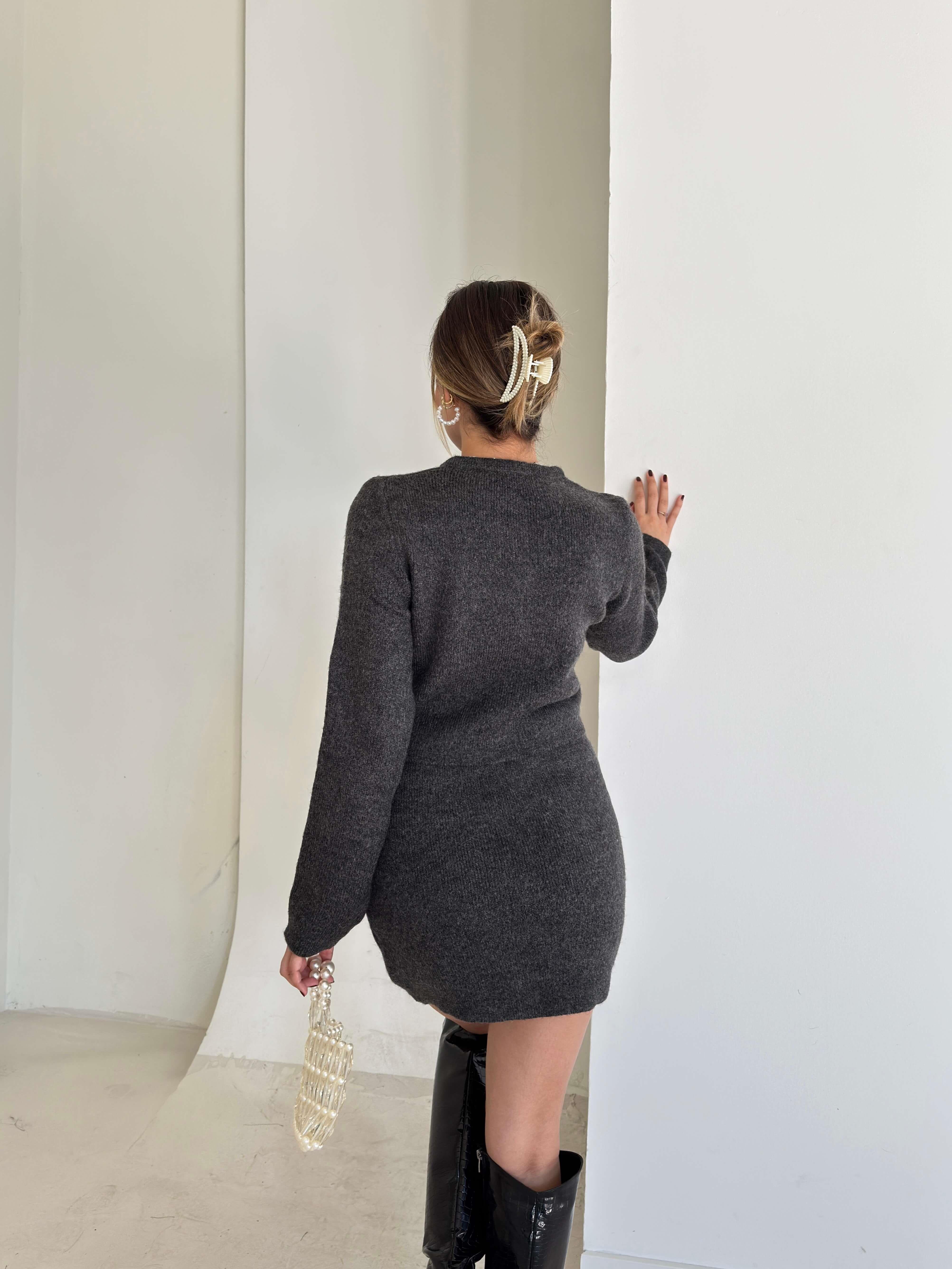 Kalp Düğmeli Hırka Beli Lastikli Mini Etek Keldi Antrasit Kadın İkili Triko Takım 26K157 (26K157)