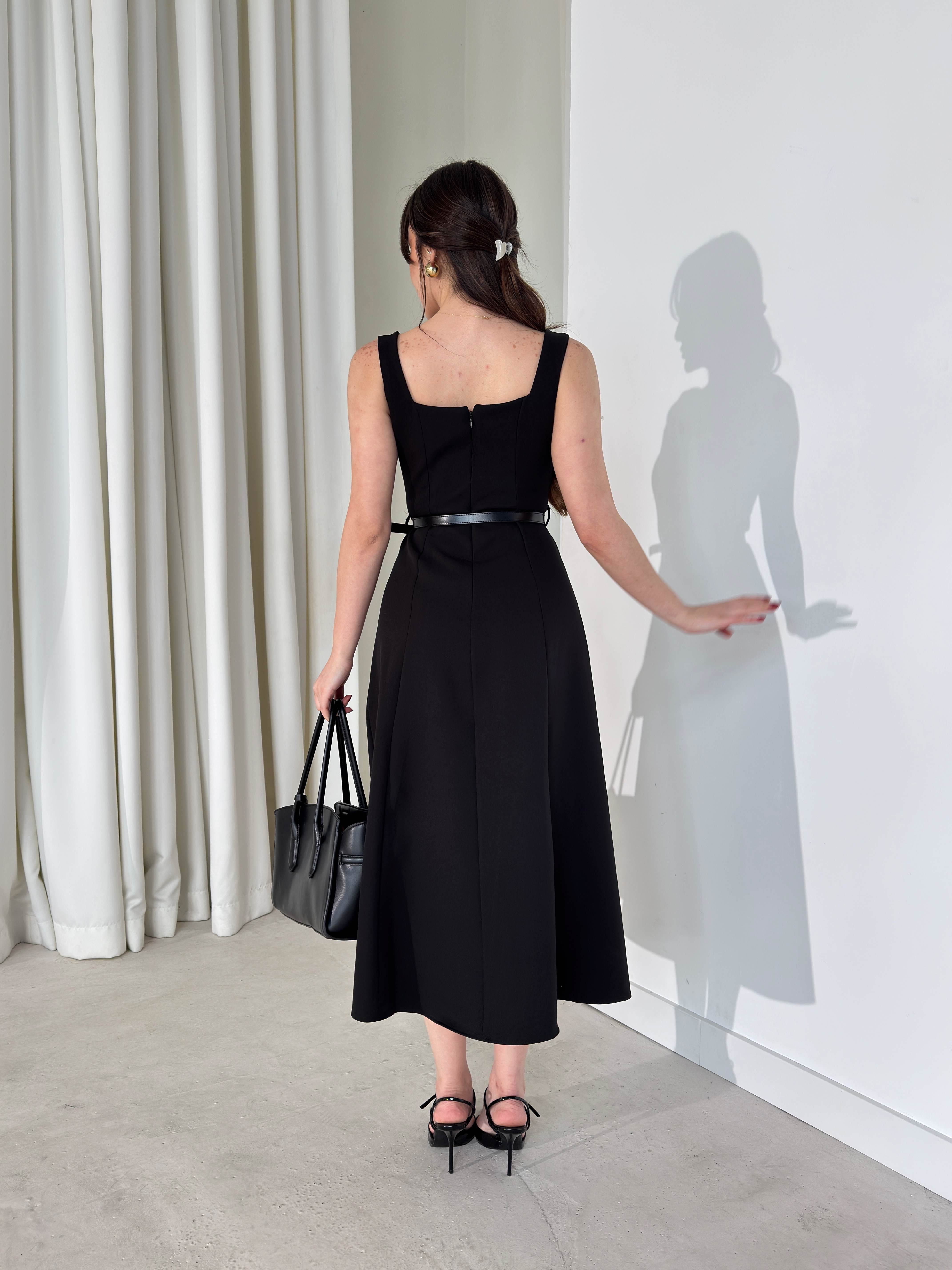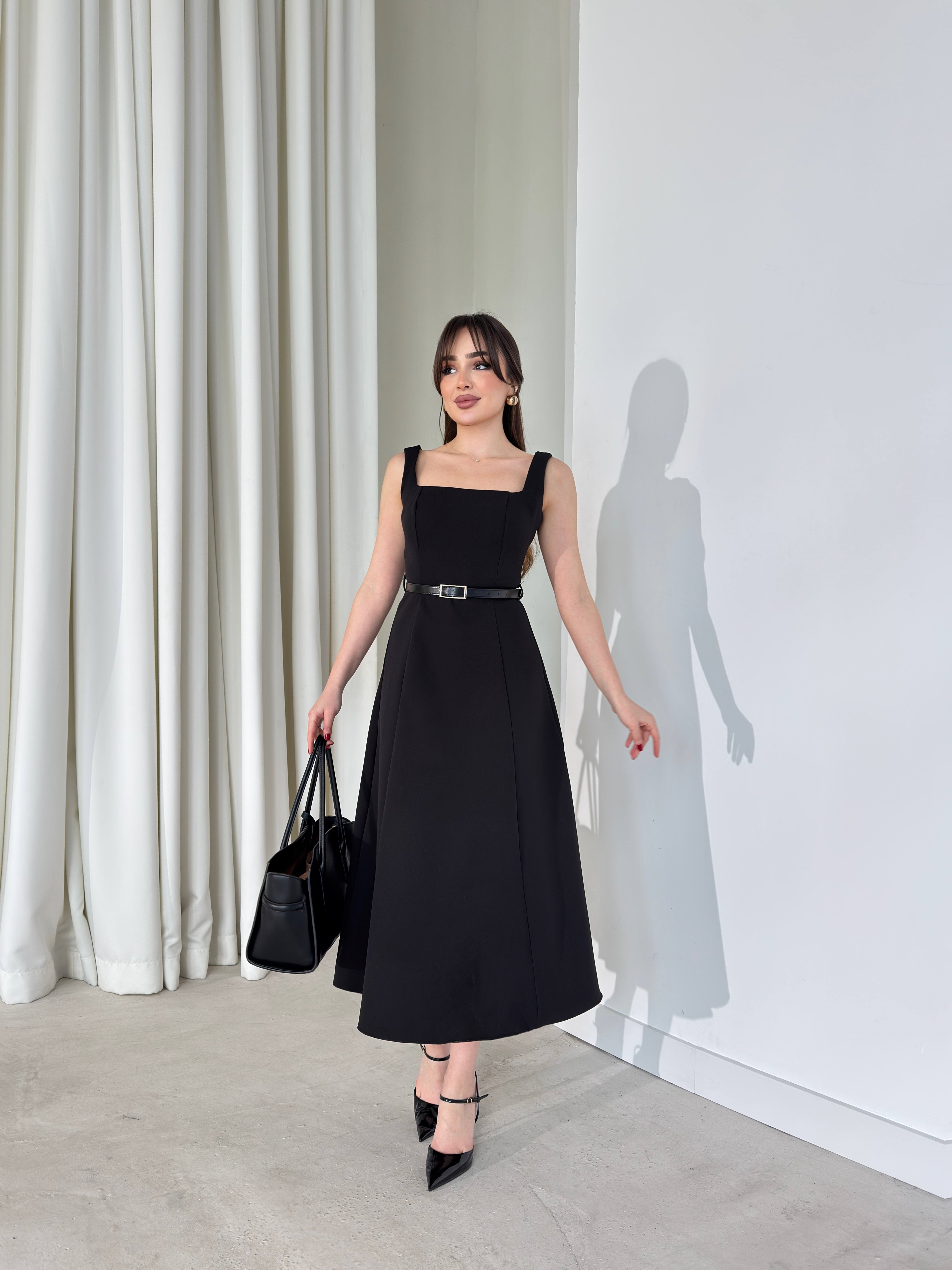 Kare Yaka Kemerli Midi Boy Siyah Esperanza Kadın Elbise 26Y136 (26Y136)