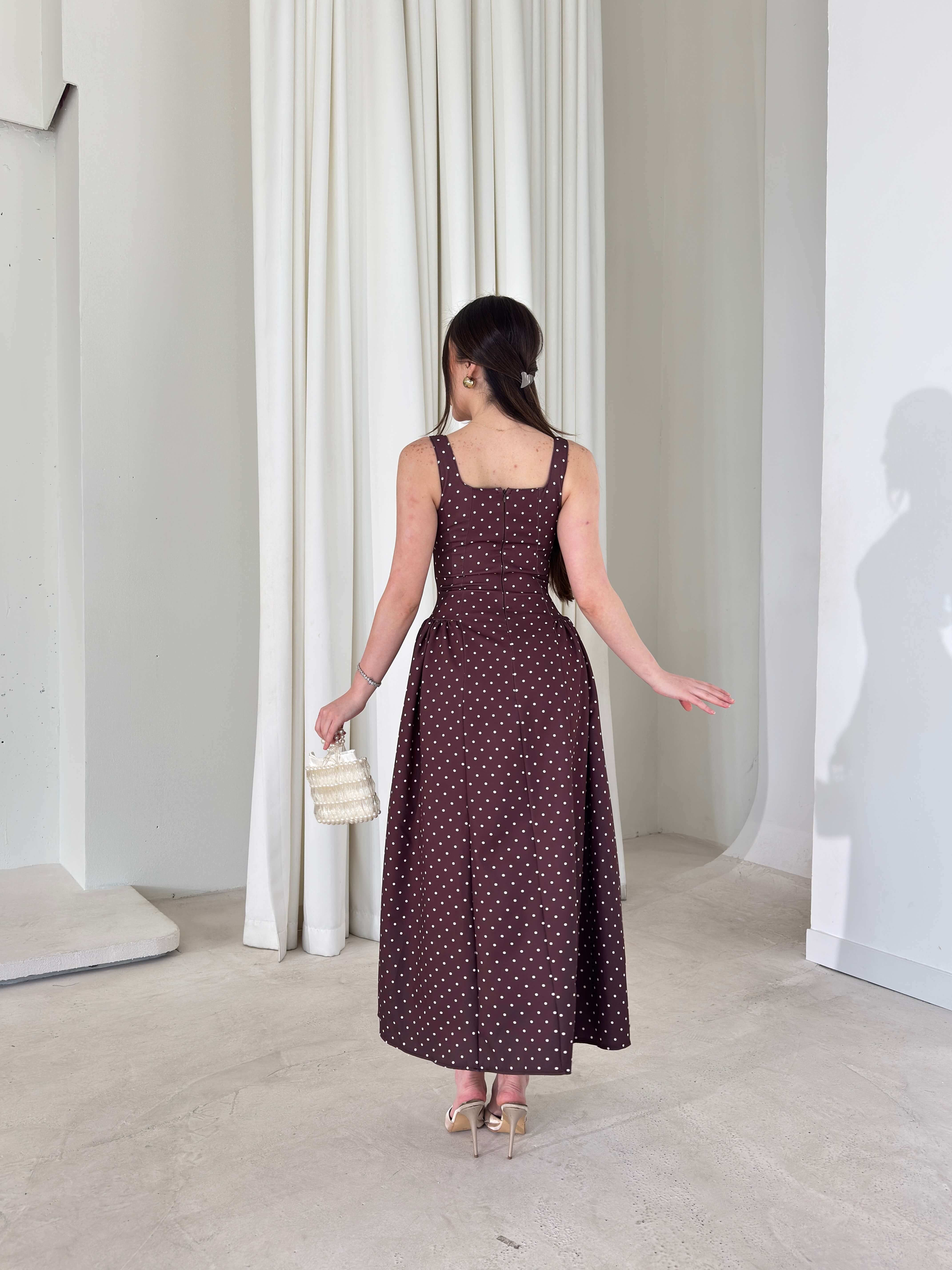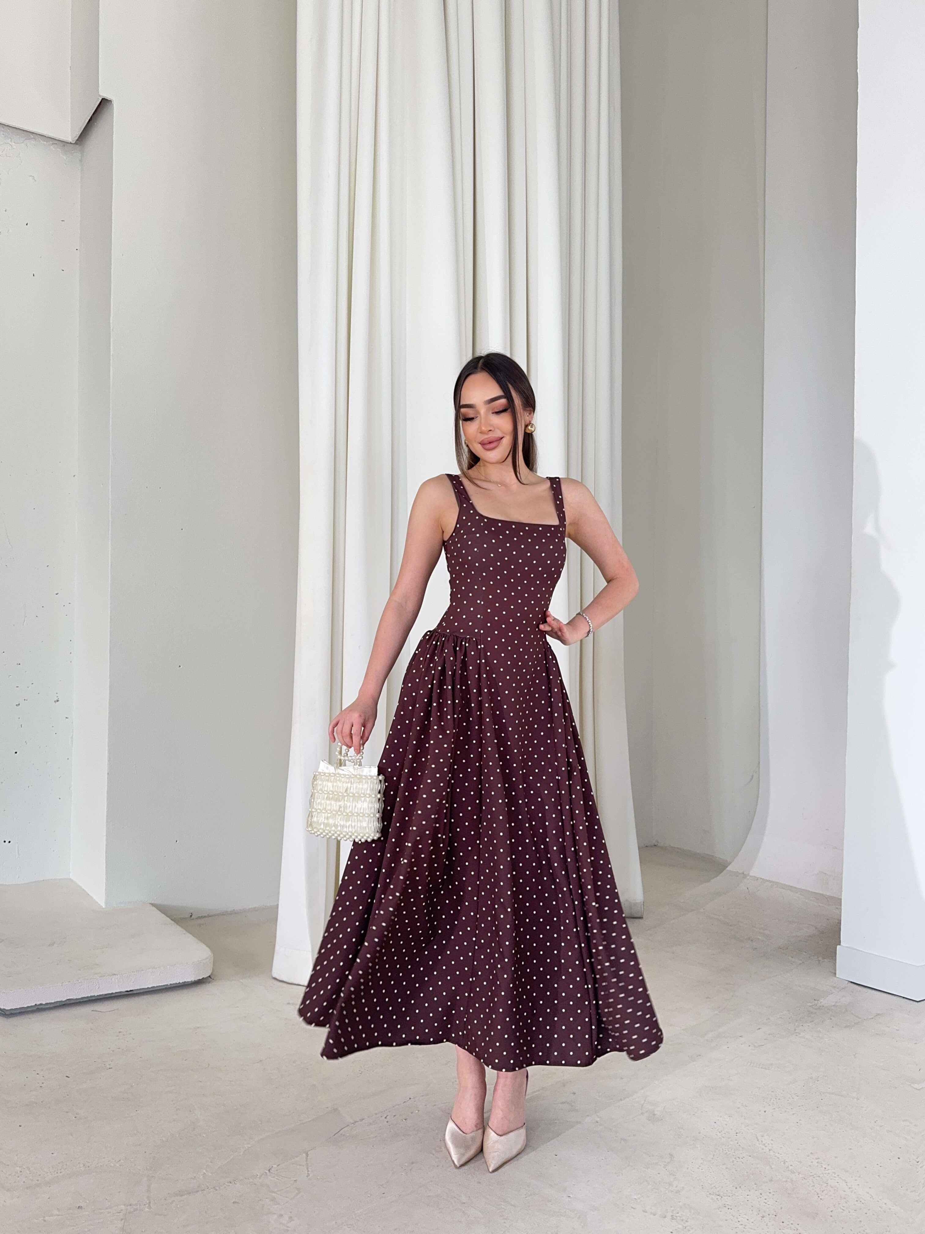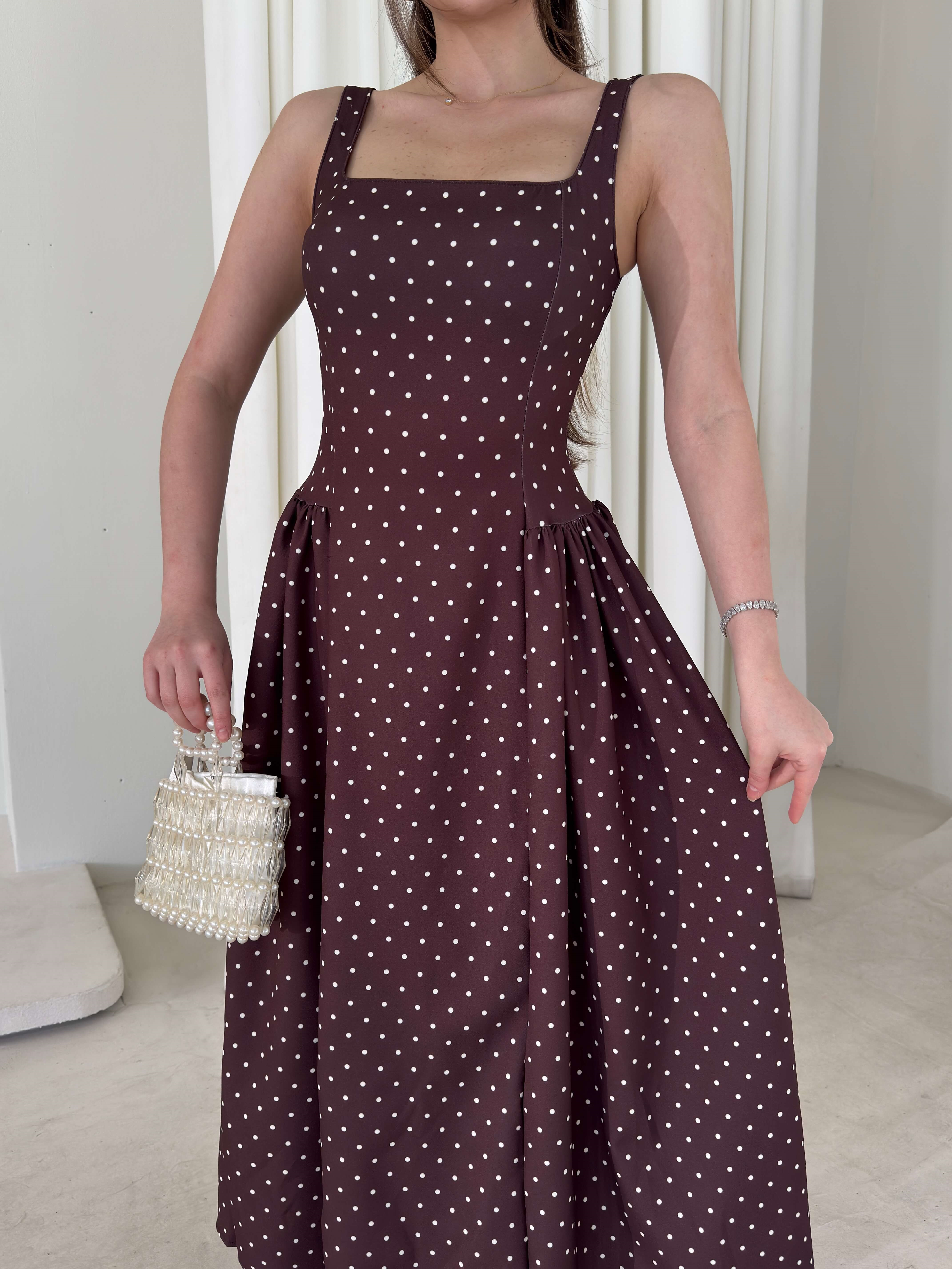 Kare Yaka Puantiyeli Kalın Askılı Yandan Drape Detaylı Kahverengi Midi Violet Kadın Elbise 26Y125 (26Y125)