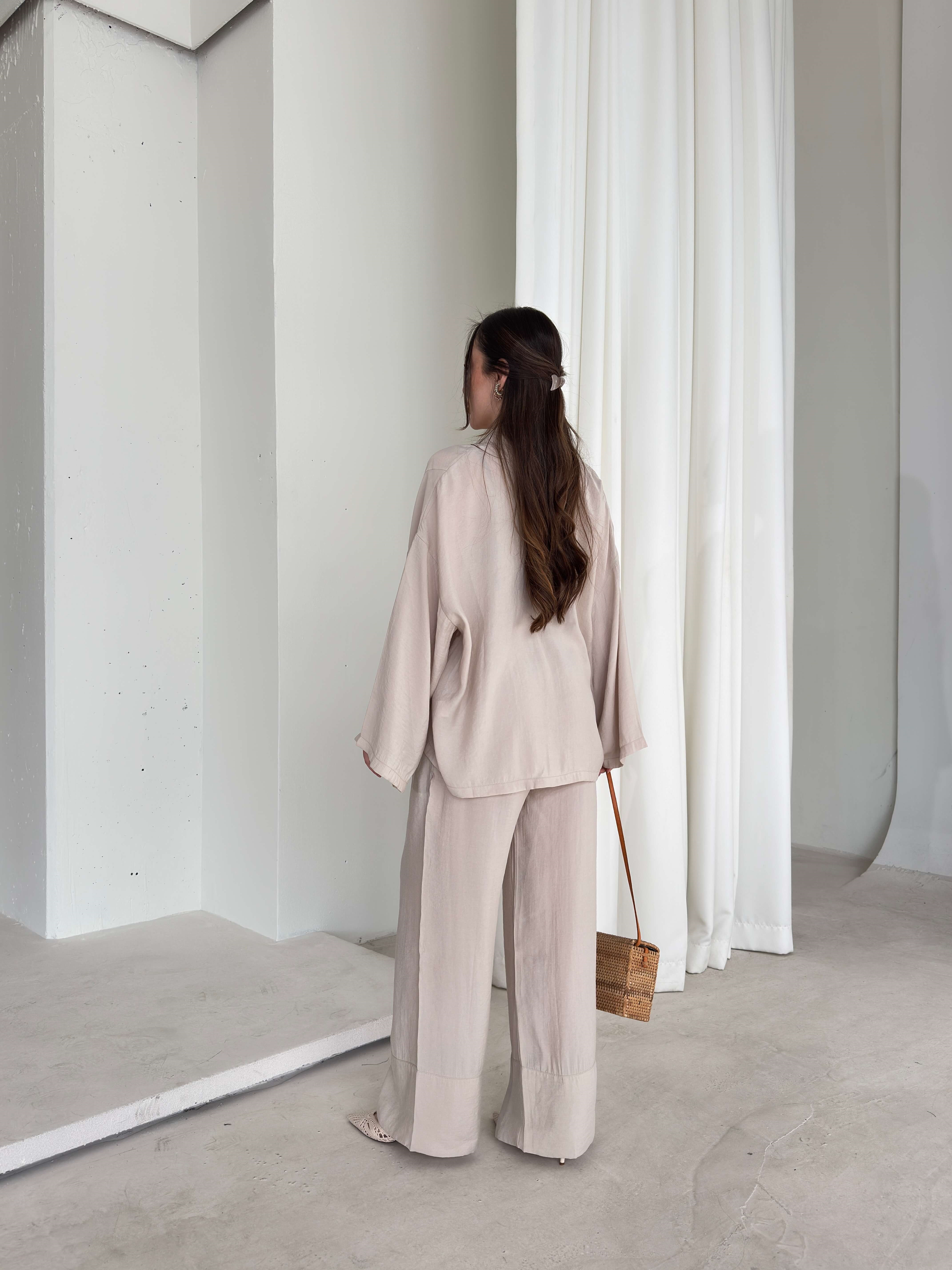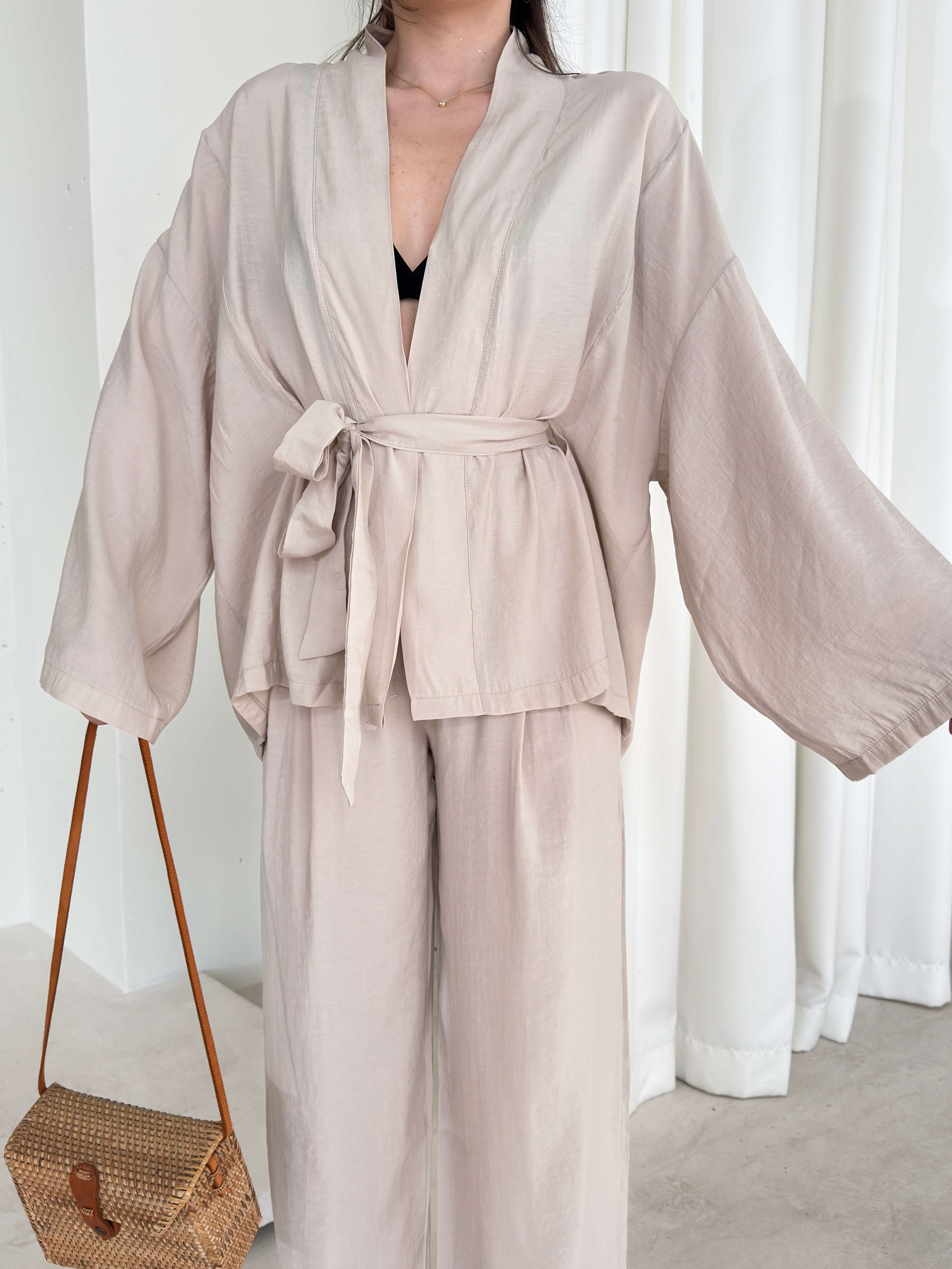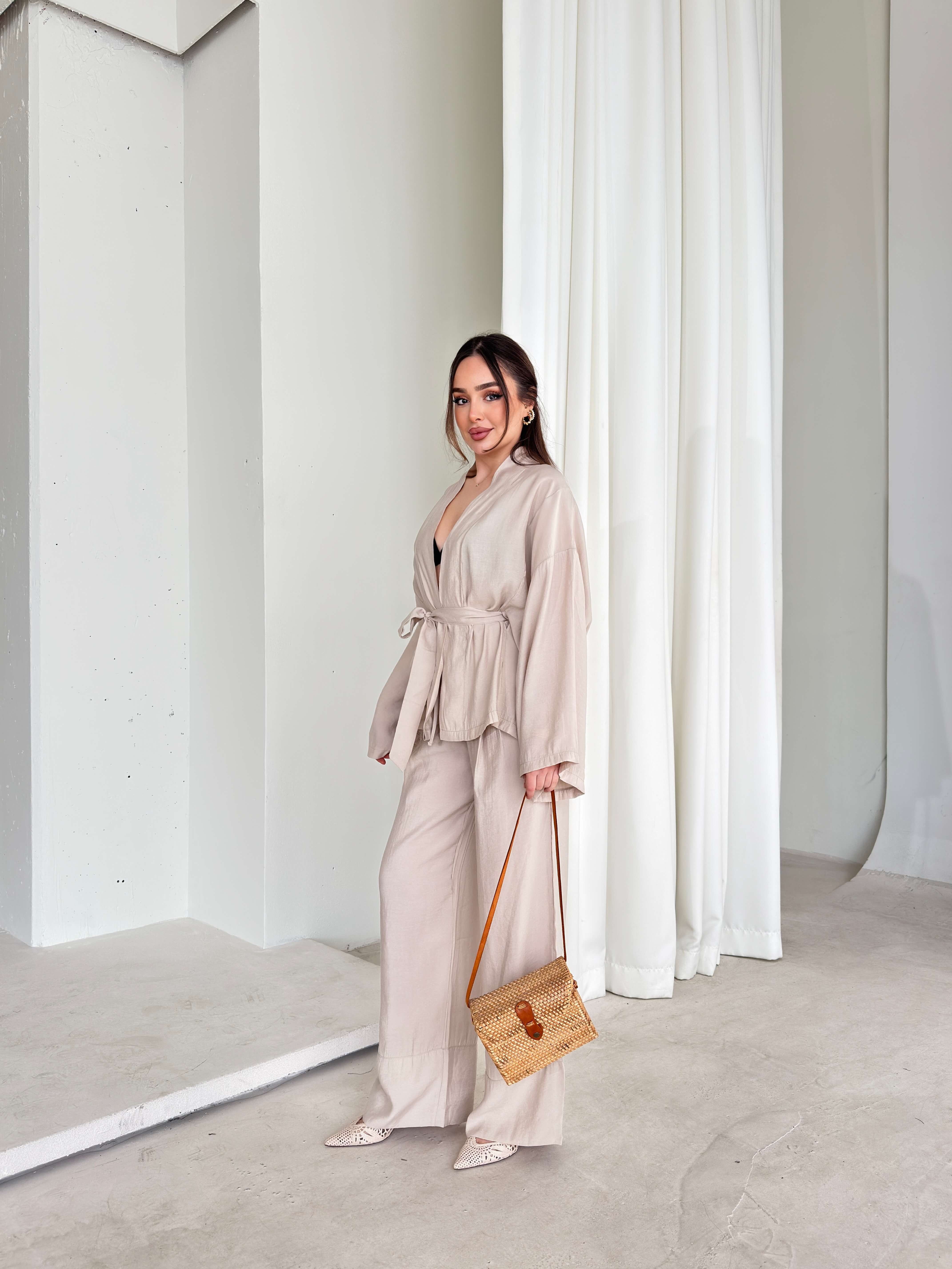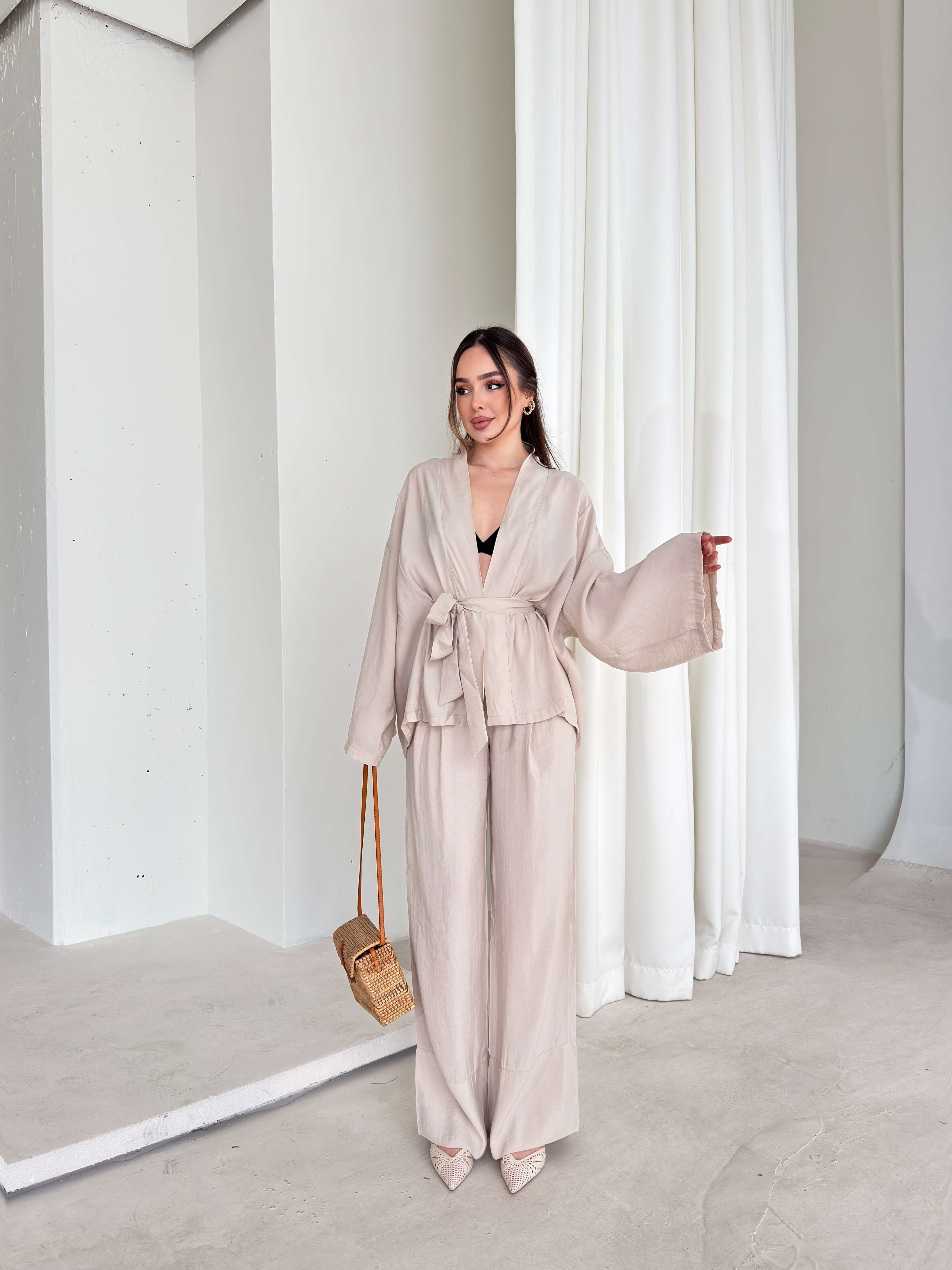 Kemerli Belden Lastikli İkili Kimono Bej Rase Kadın Takım 26Y079 (26Y079)
