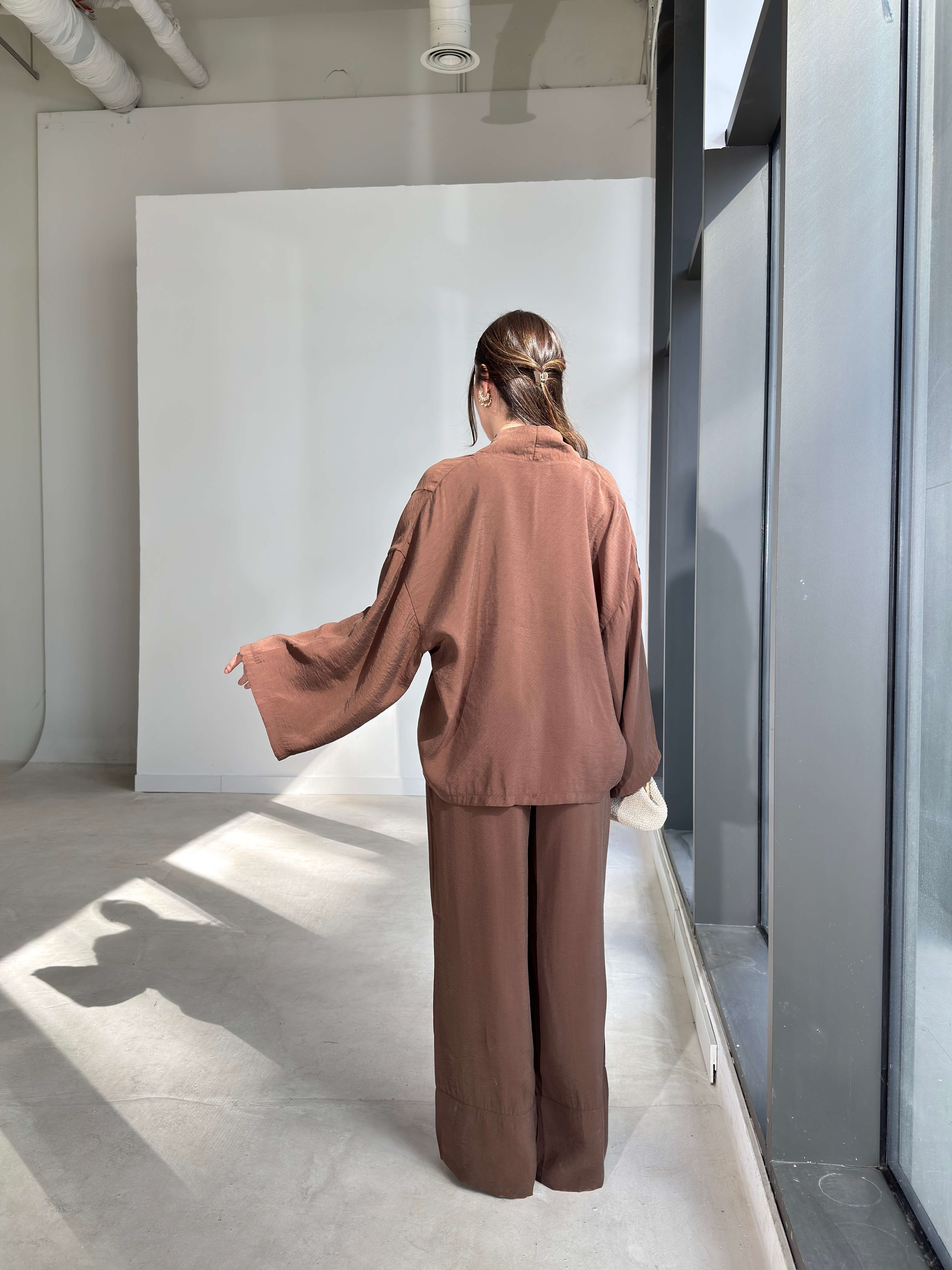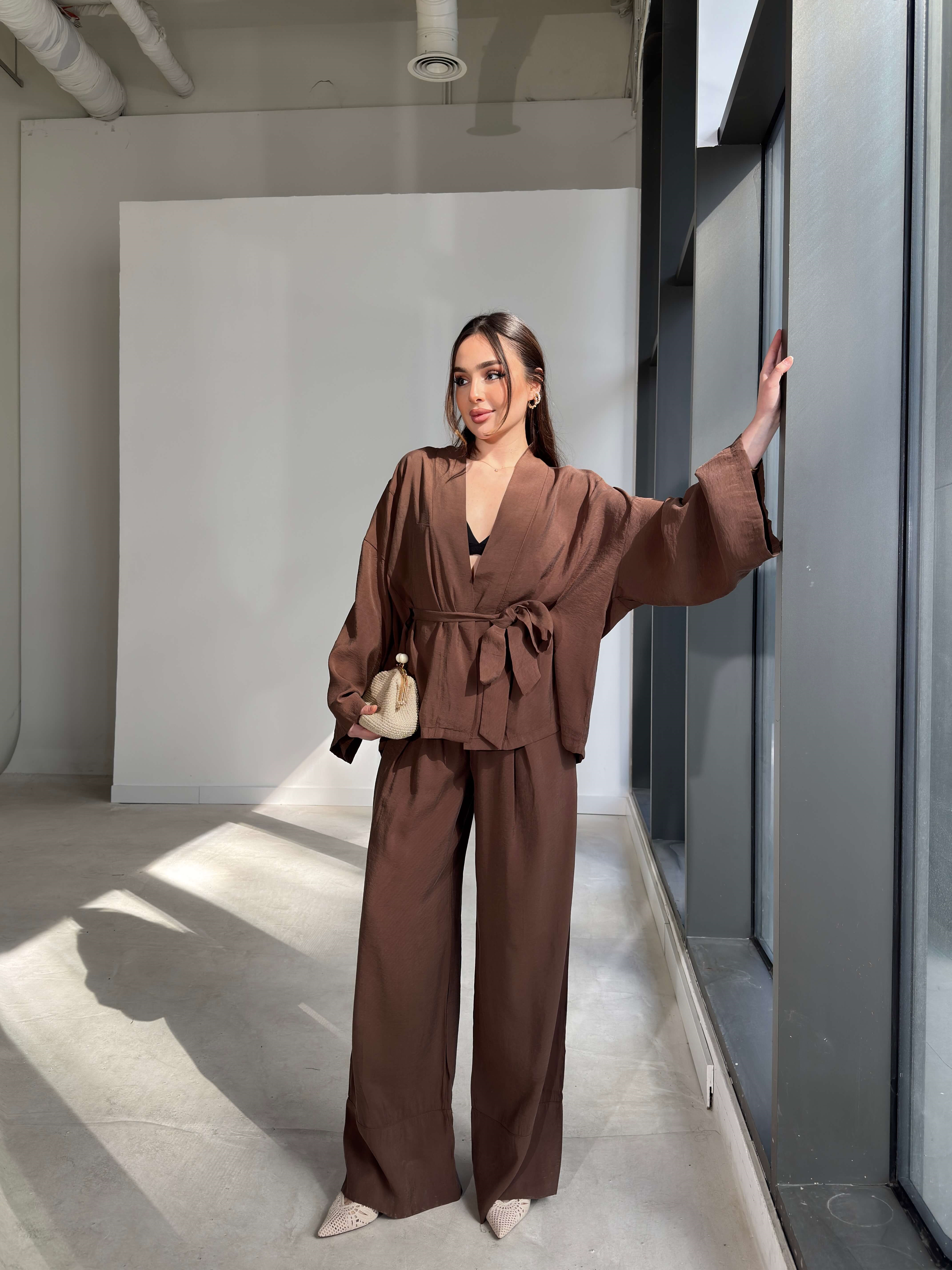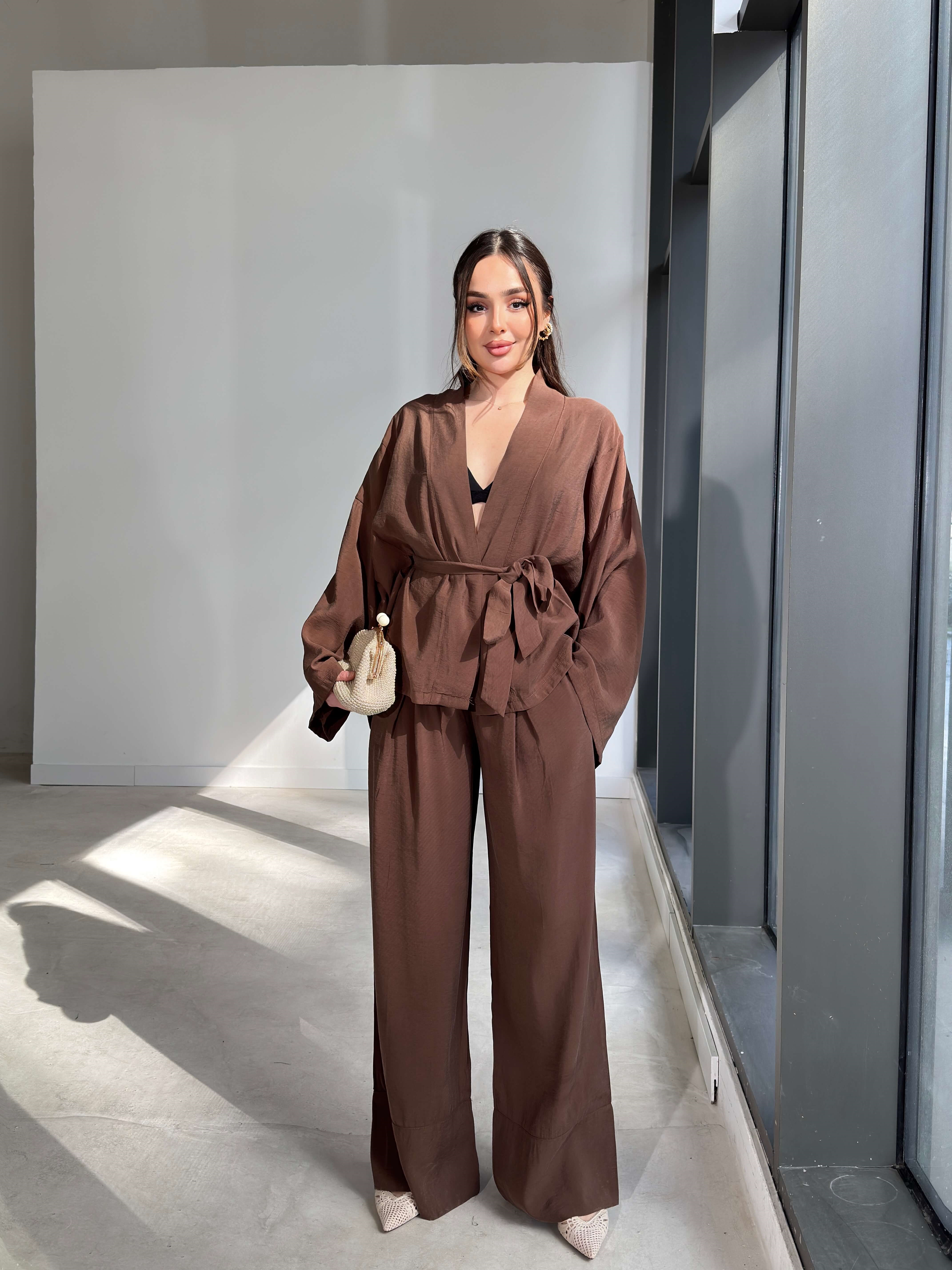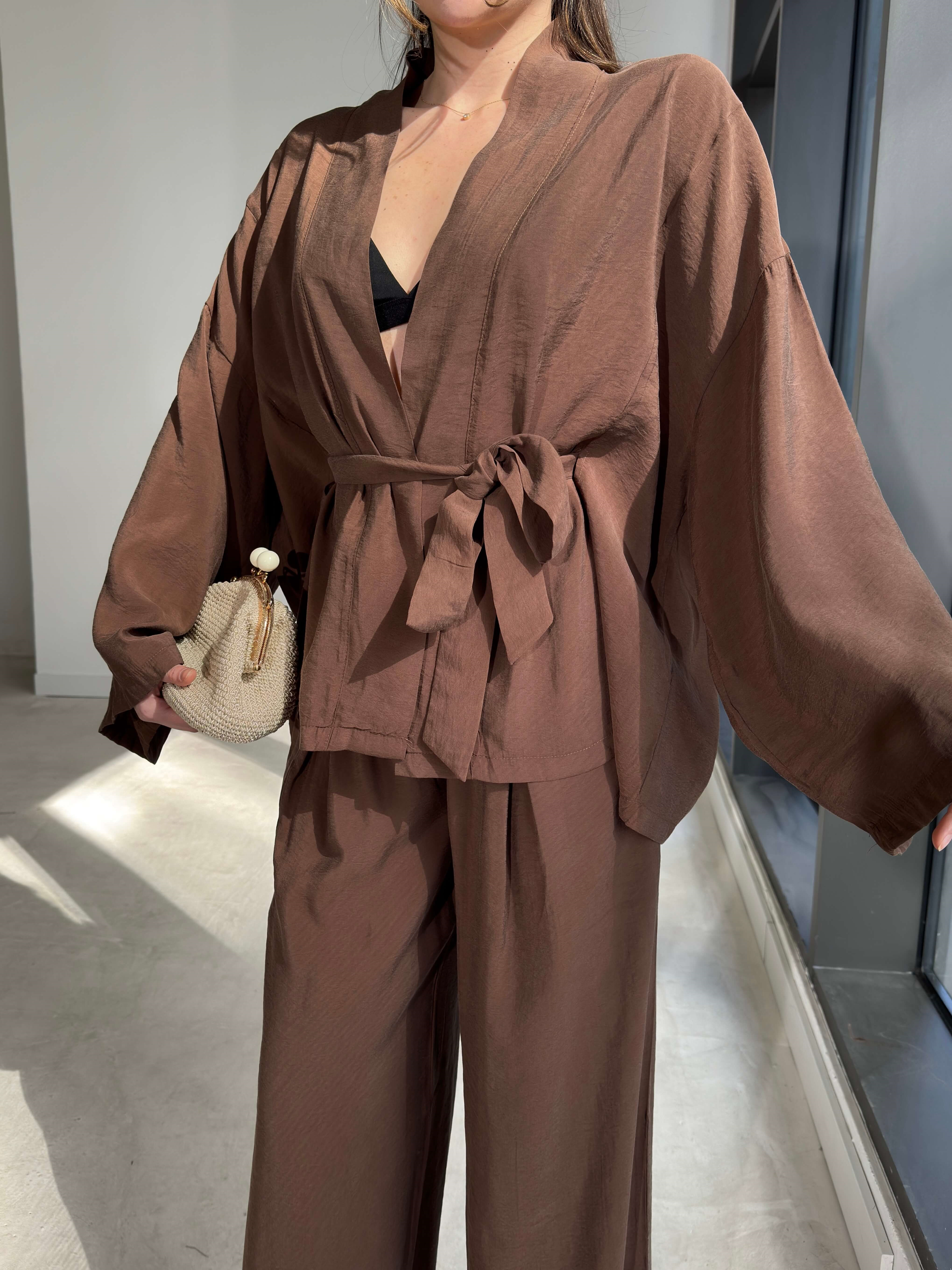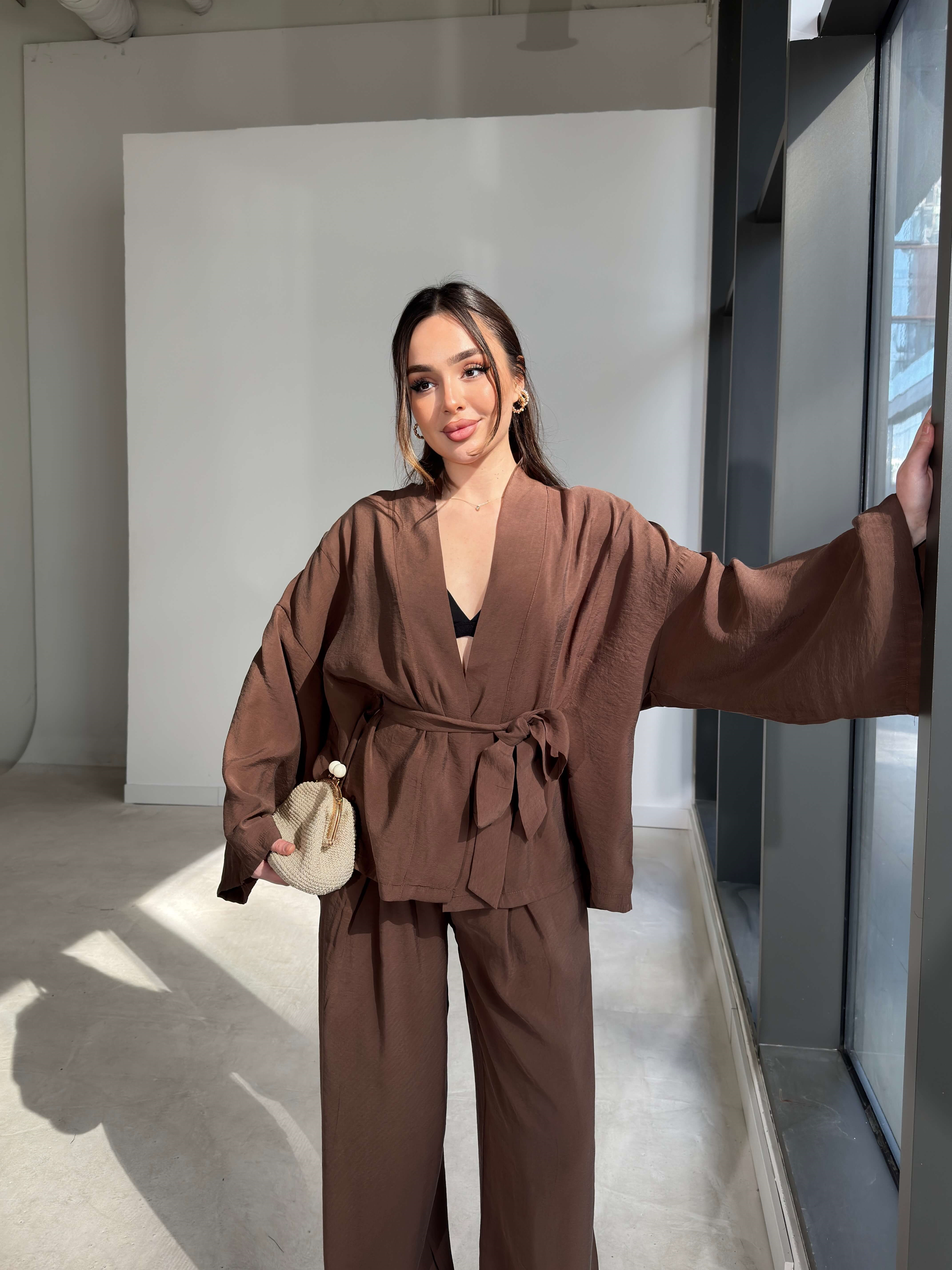Kemerli Belden Lastikli İkili Kimono Kahverengi Rase Kadın Takım 26Y079 (26Y079)
