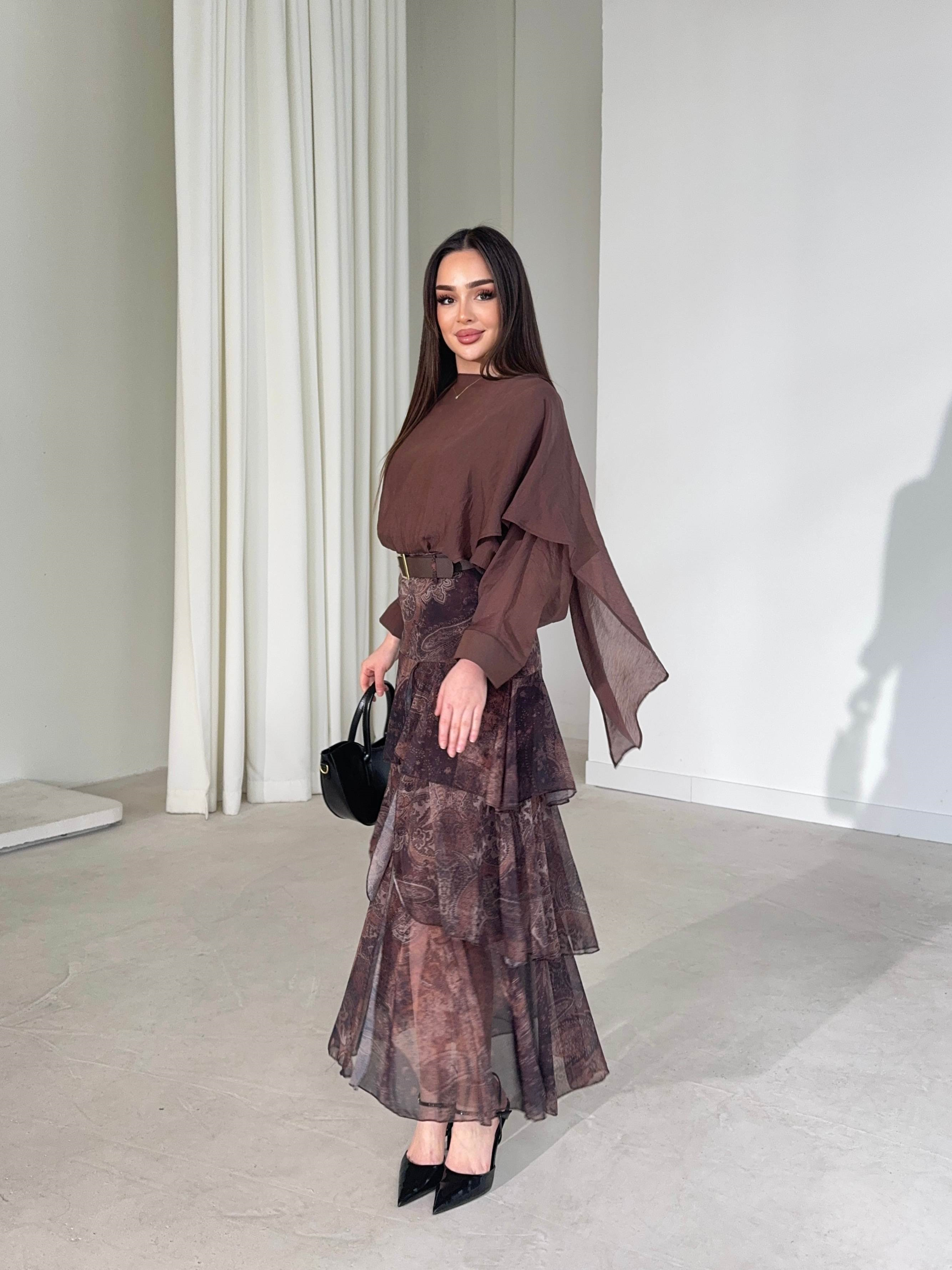 Kemerli Önden Yırtmaçlı Katlı Uzun Kahverengi Chicago Kadın Etek 26Y160 (26Y160)