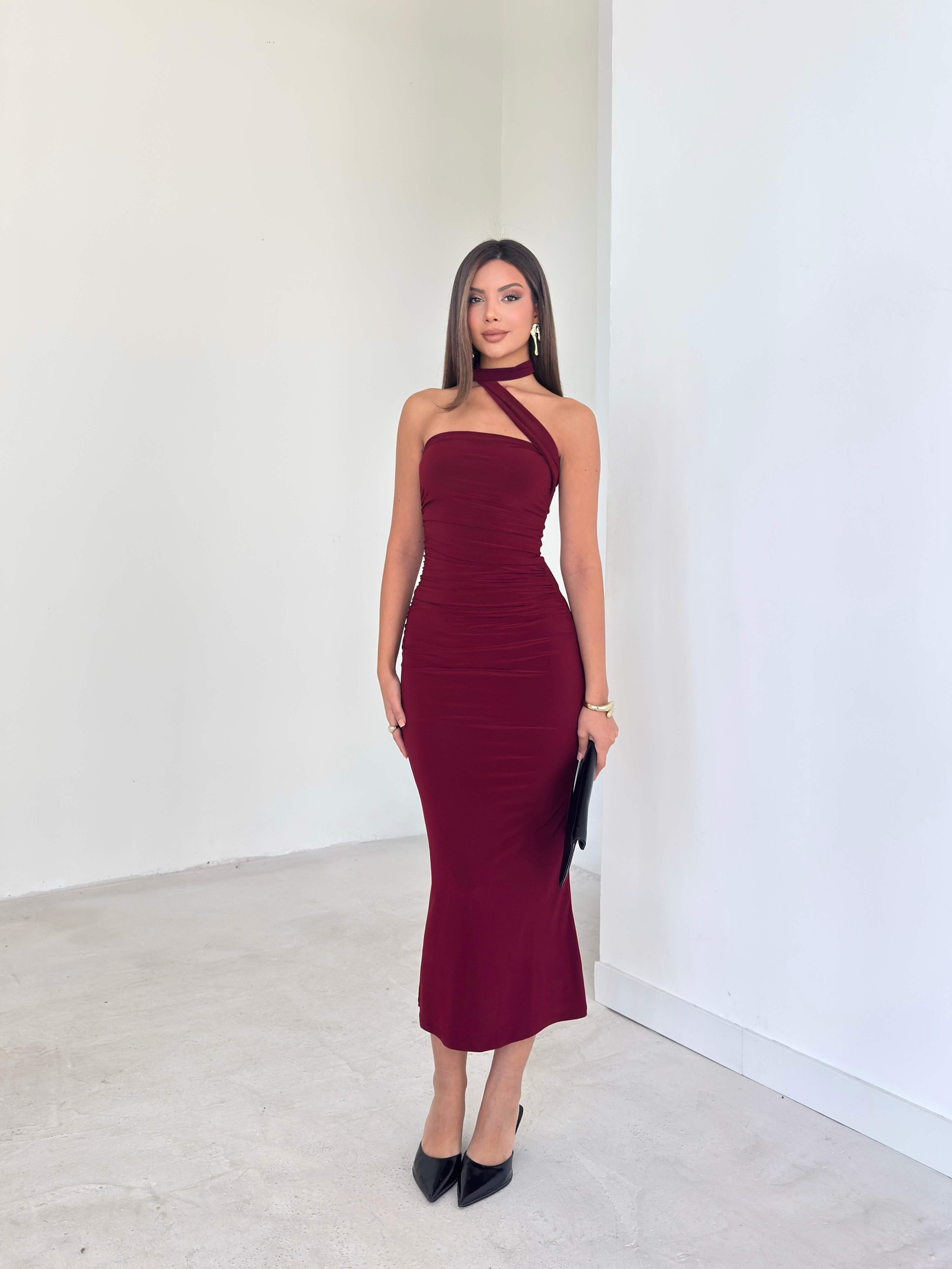 Kendinden Kuşaklı Drape Detaylı Arkası Yırtmaçlı Emrick Bordo Kadın Elbise 26K228 (26K228)