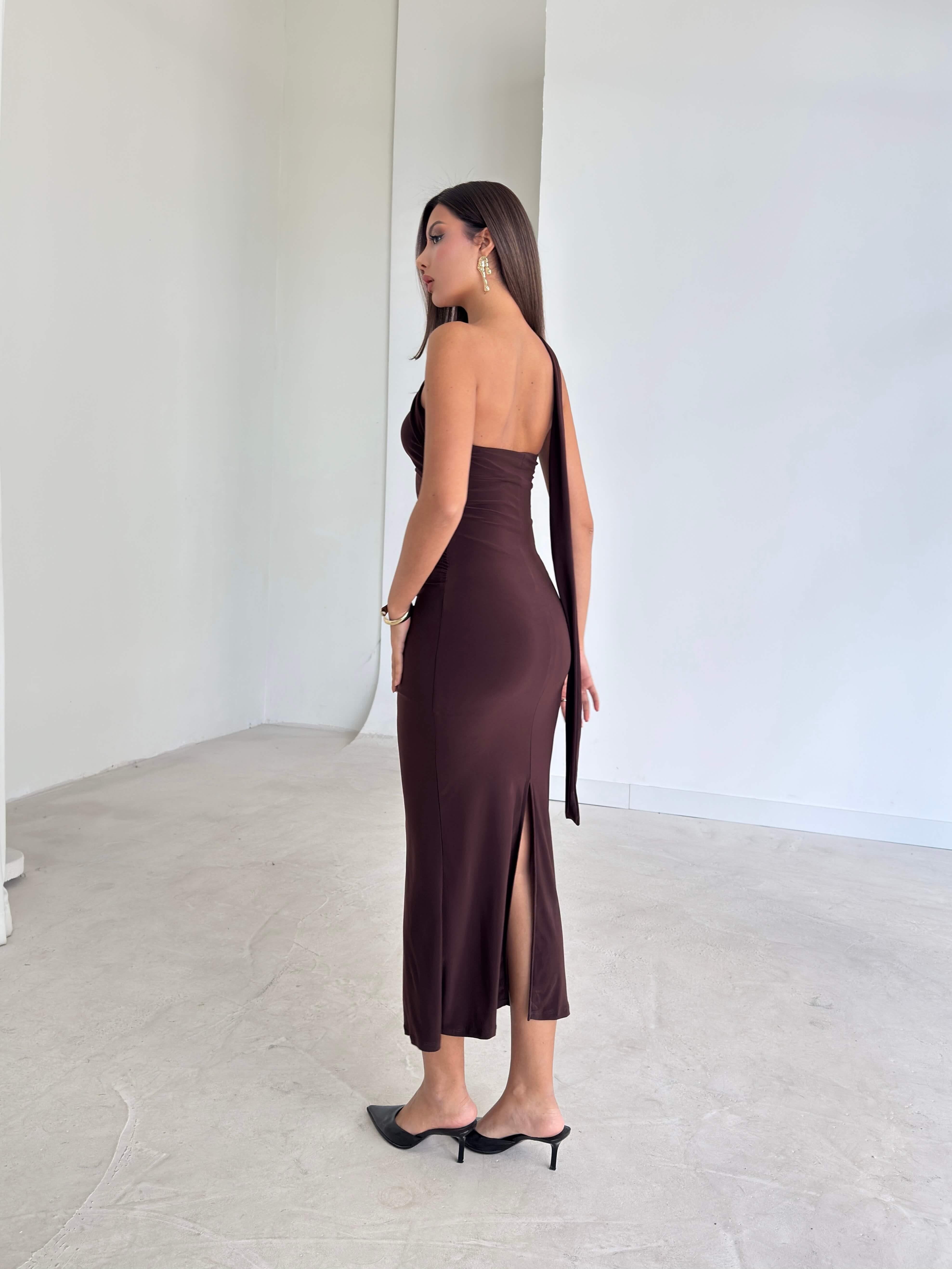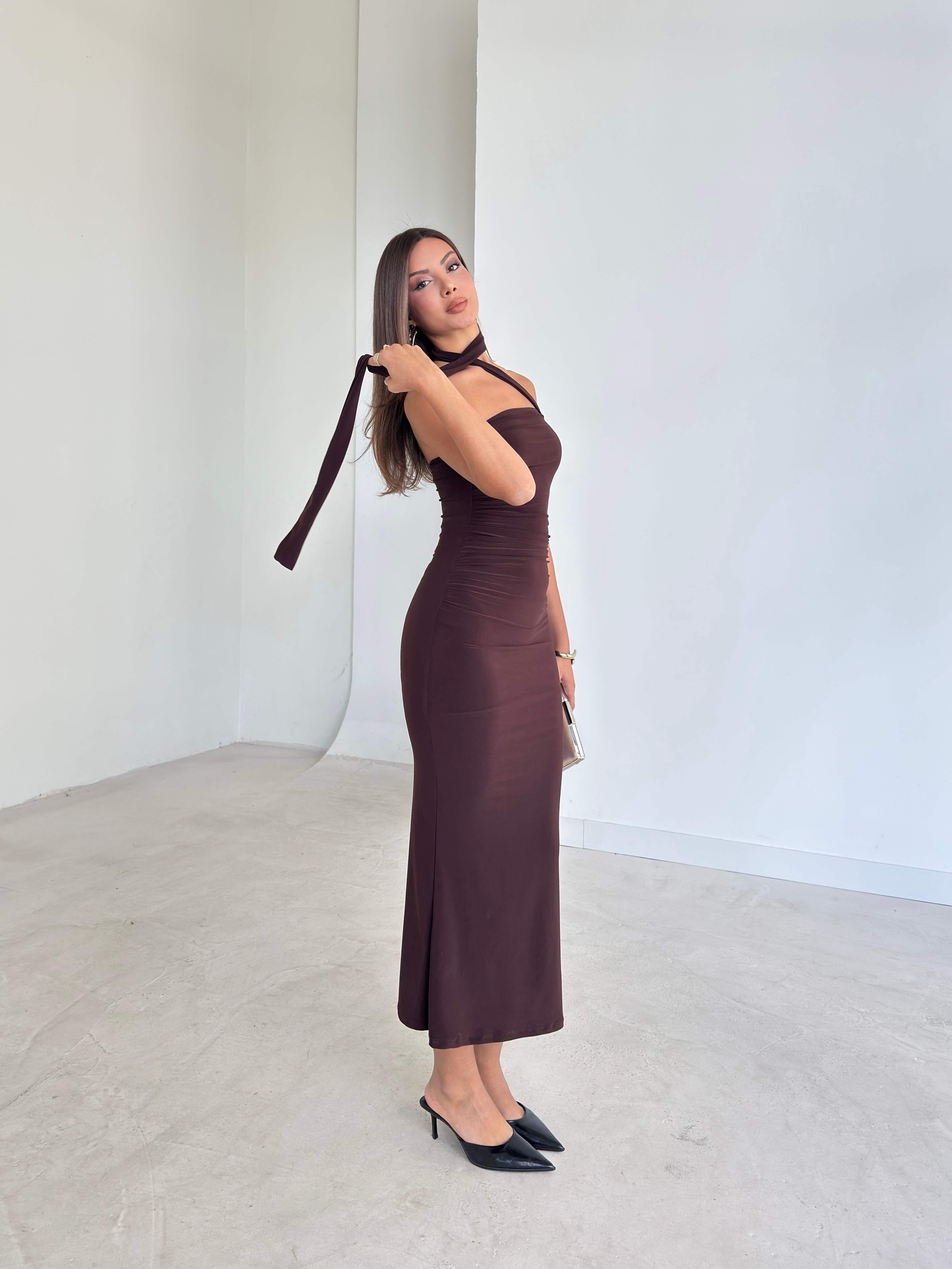 Kendinden Kuşaklı Drape Detaylı Arkası Yırtmaçlı Emrick Kahve Kadın Elbise 26K228 (26K228)