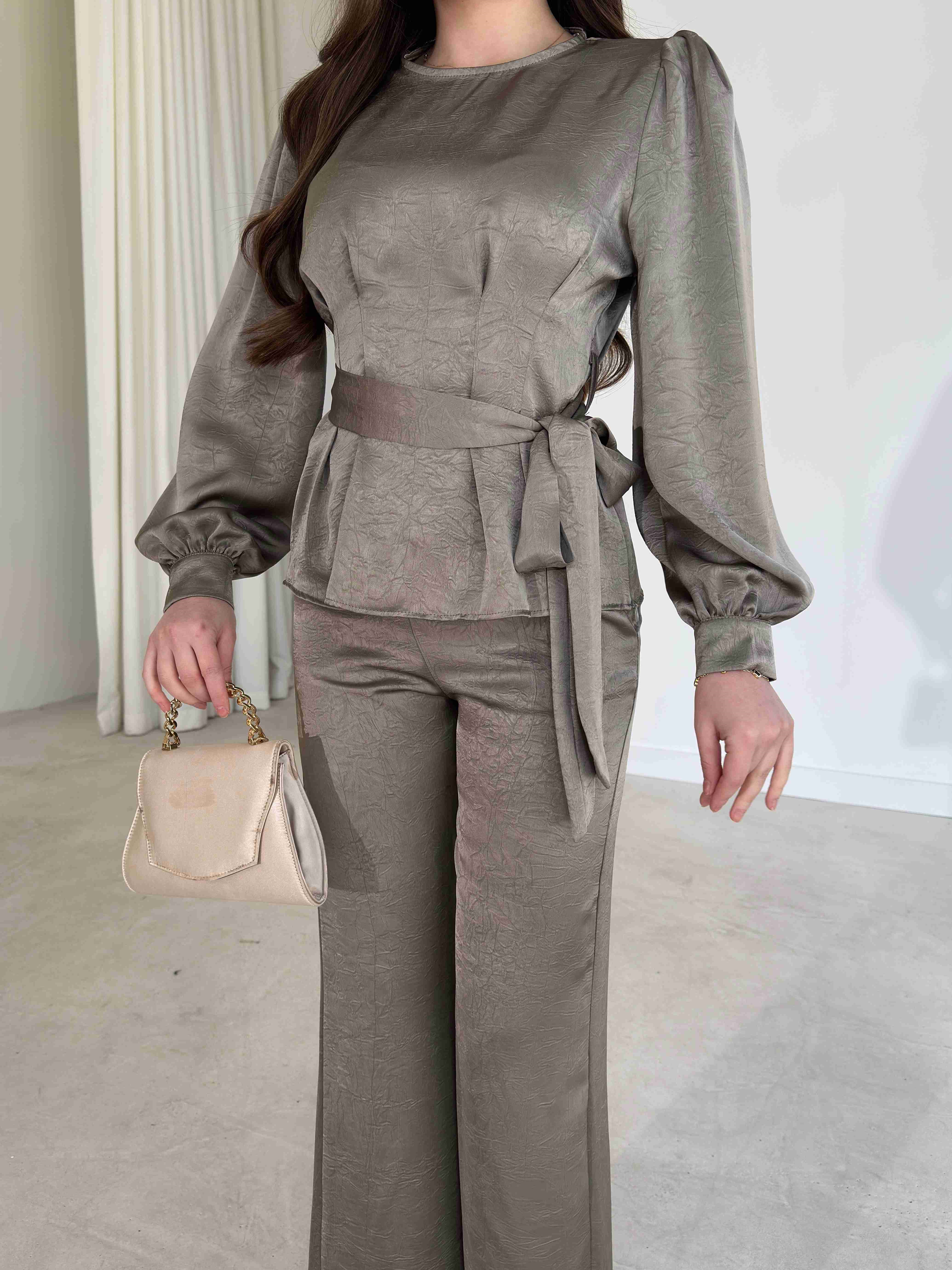 Kuşaklı Belden Oturtmalı Kolları Düğmeli Lirven Haki Kadın İkili Takım 26Y053 (26Y053)