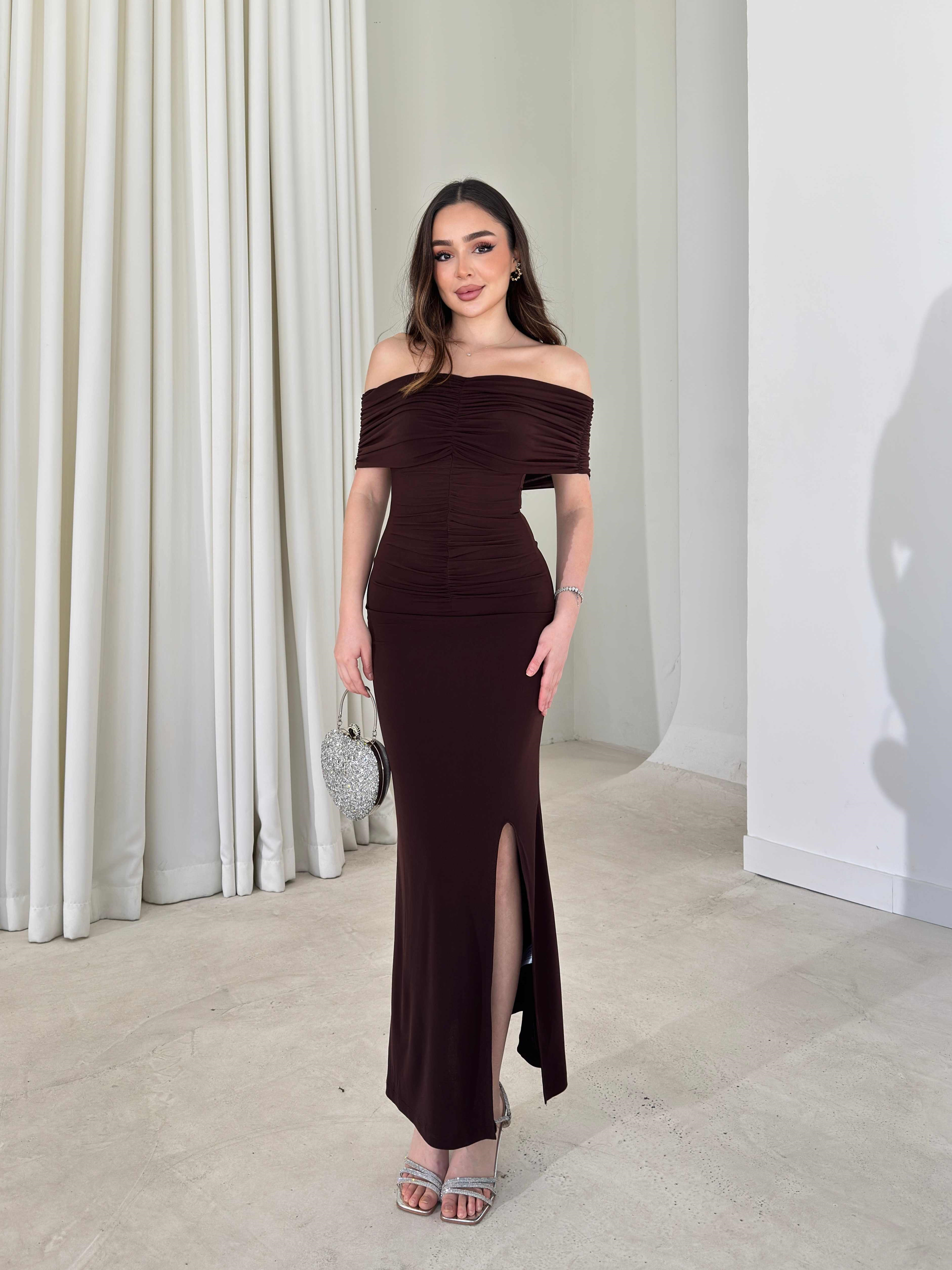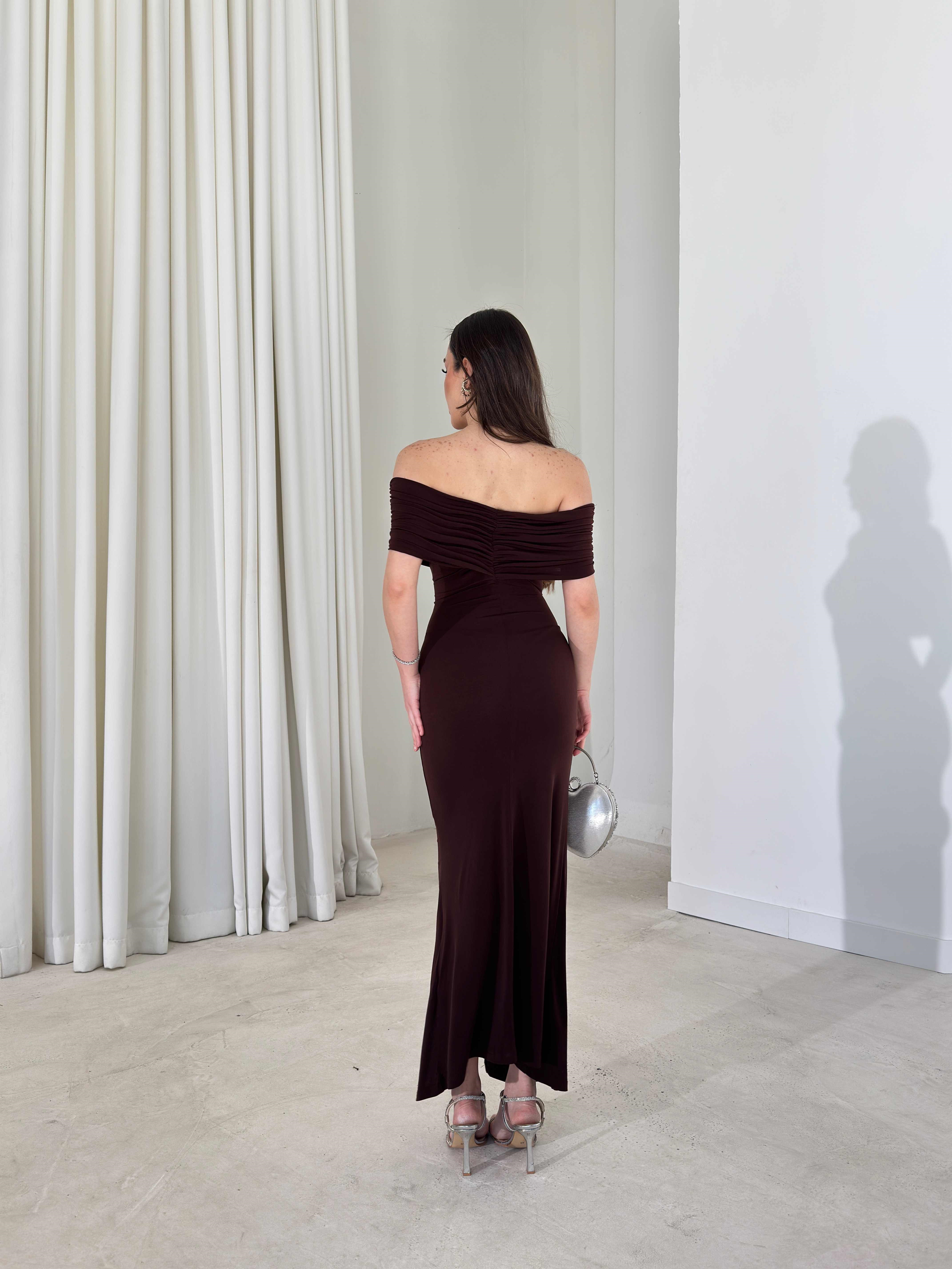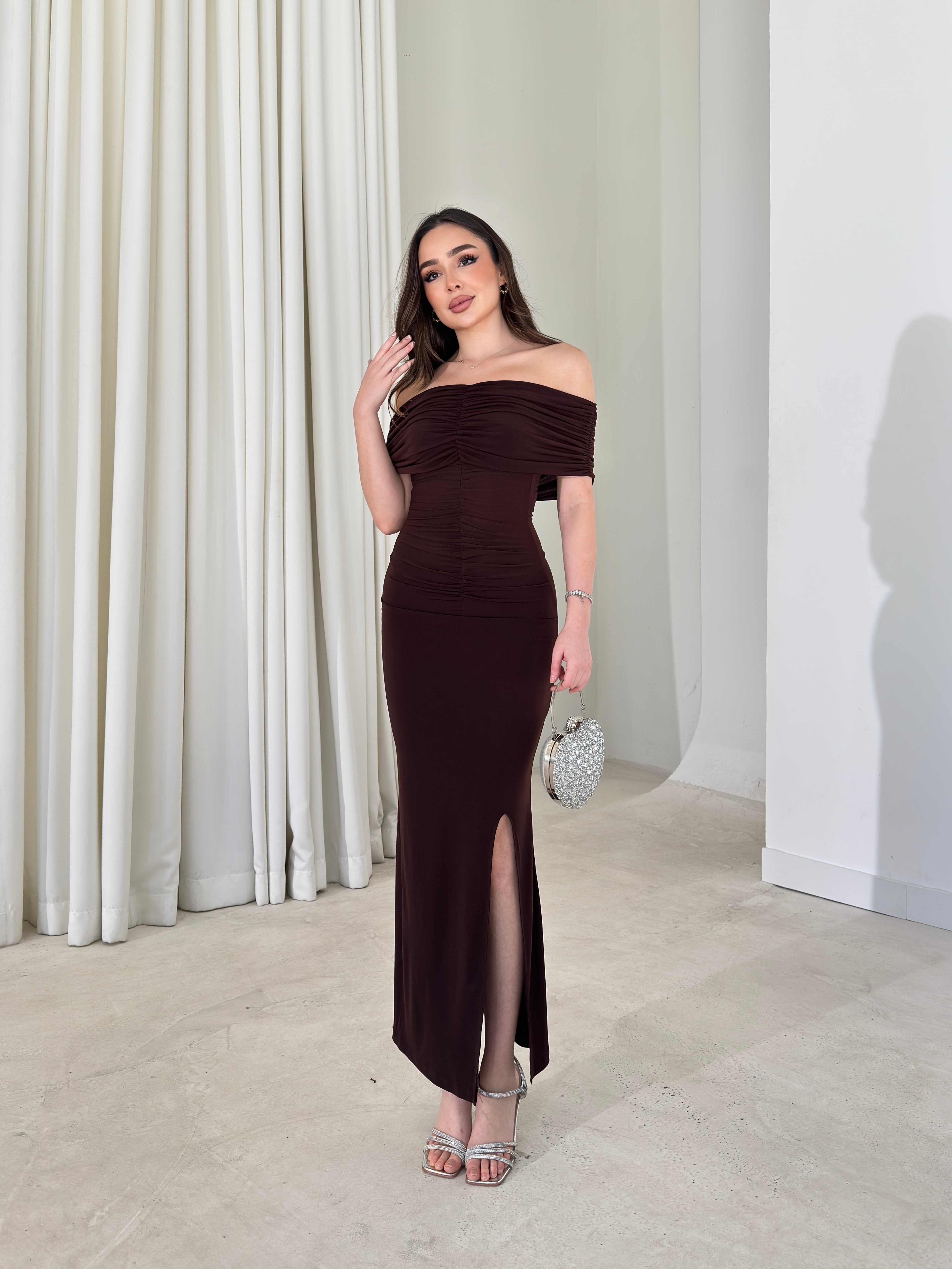 Madonna Yaka Drape Detaylı Yırtmaçlı Midi Kahverengi Onlim Kadın Elbise 26Y083 (26Y083)