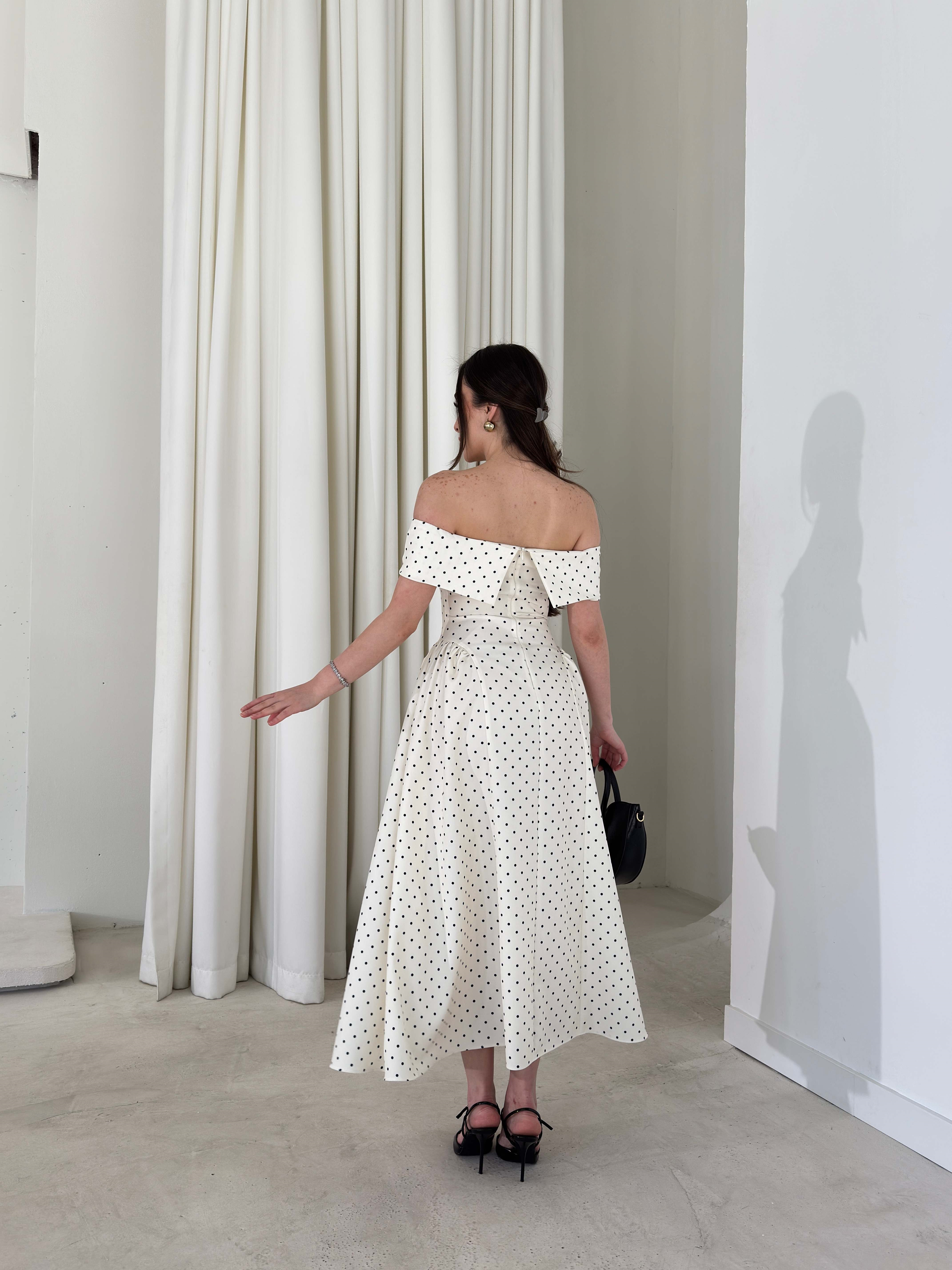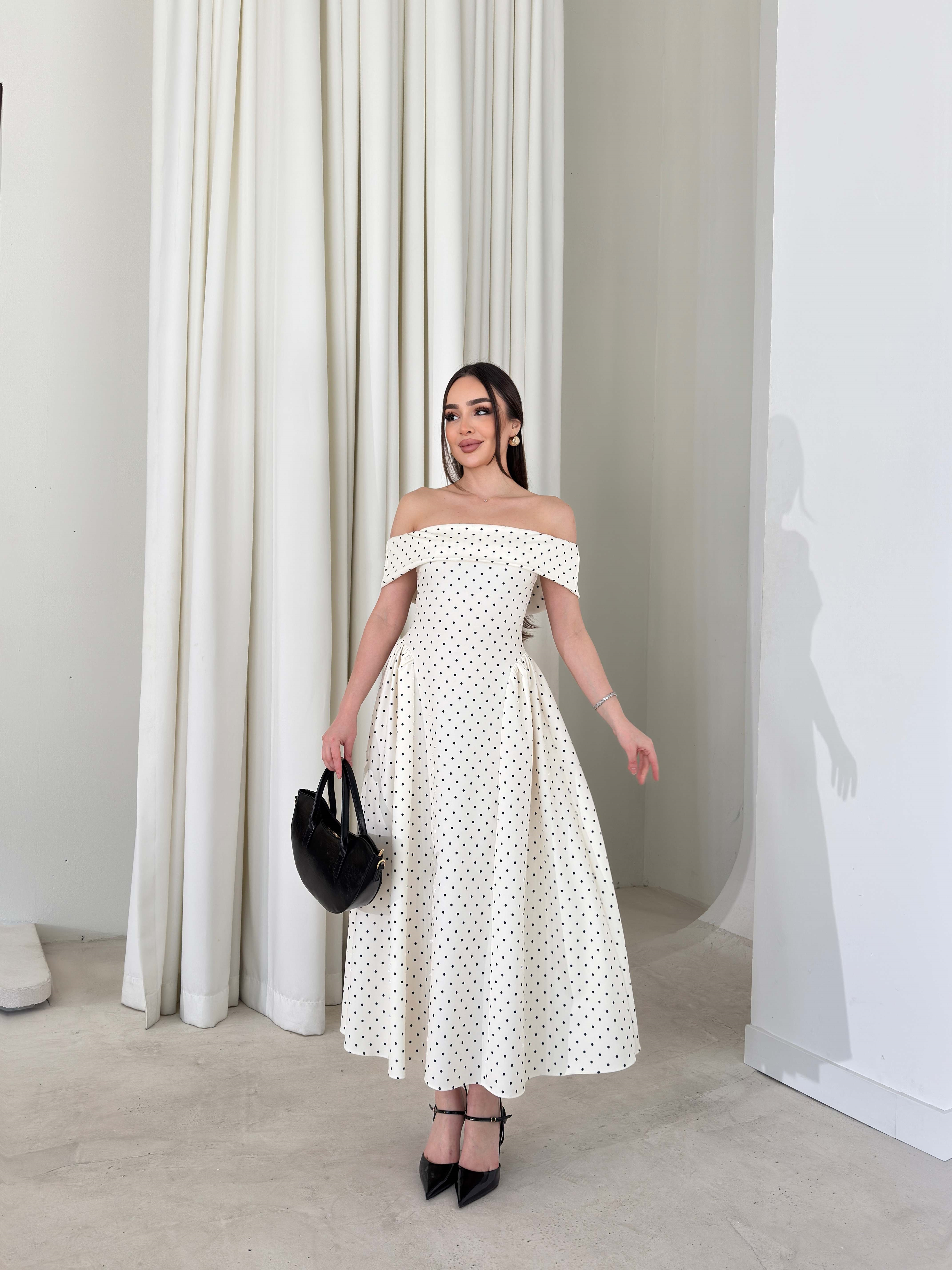 Madonna Yaka Puantiyeli Yandan Pileli Midi Boy Krem Helena Kadın Elbise 26Y137 (26Y137)