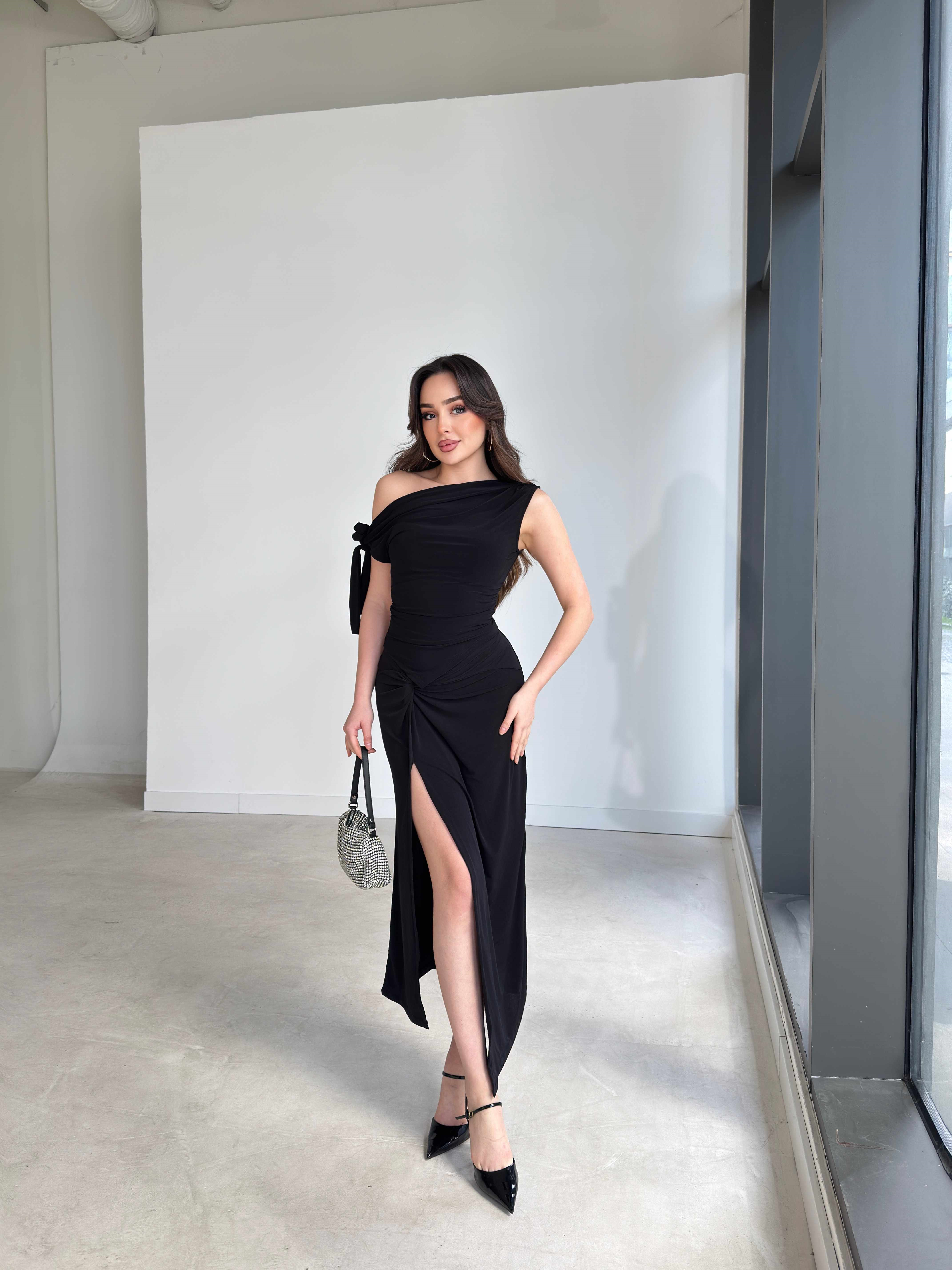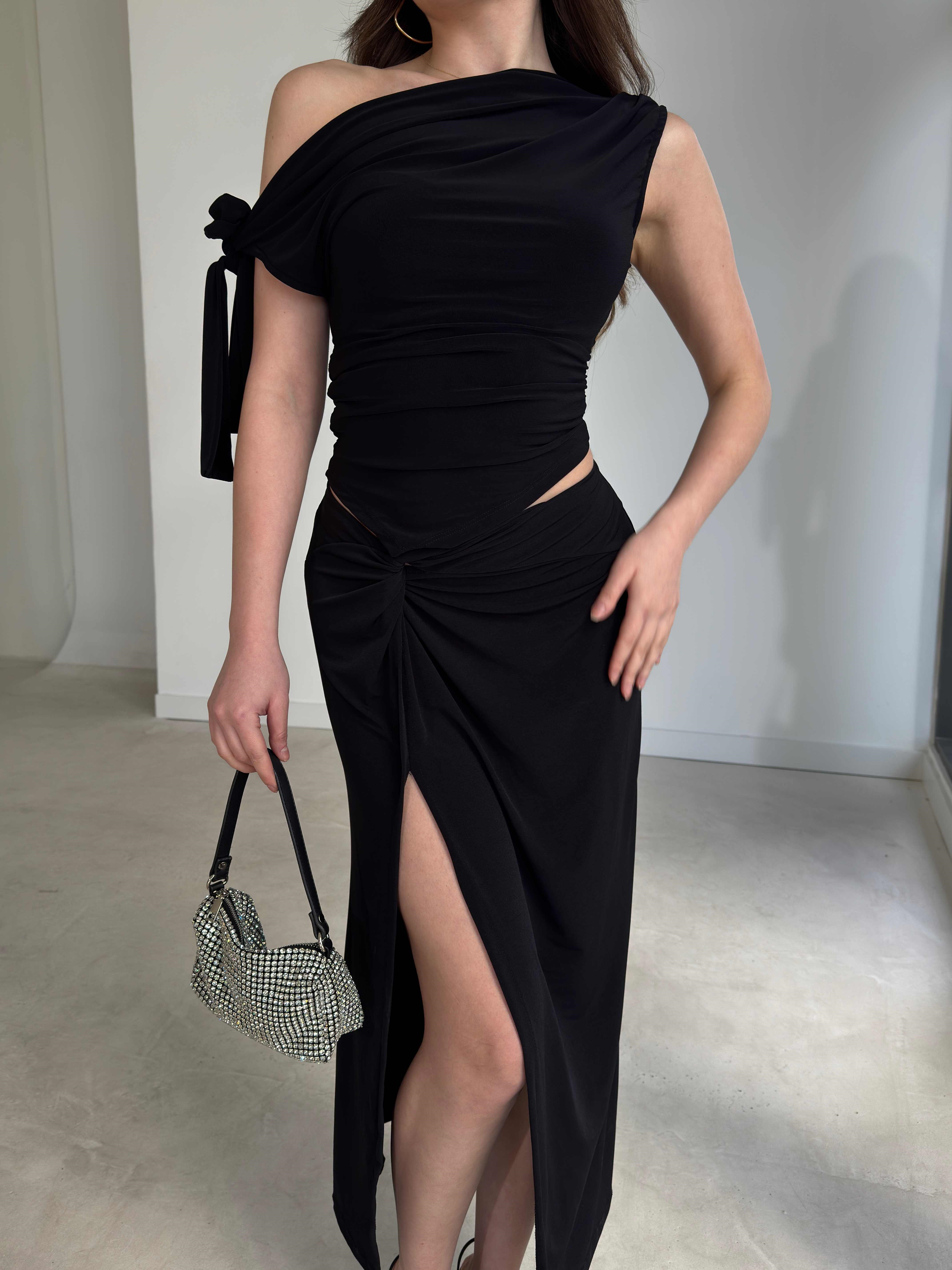Omuzdan Bağlamalı Eteği Yırtmaçlı Midi Boy Siyah Kenna Kadın İkili Takım 26Y166 (26Y166)