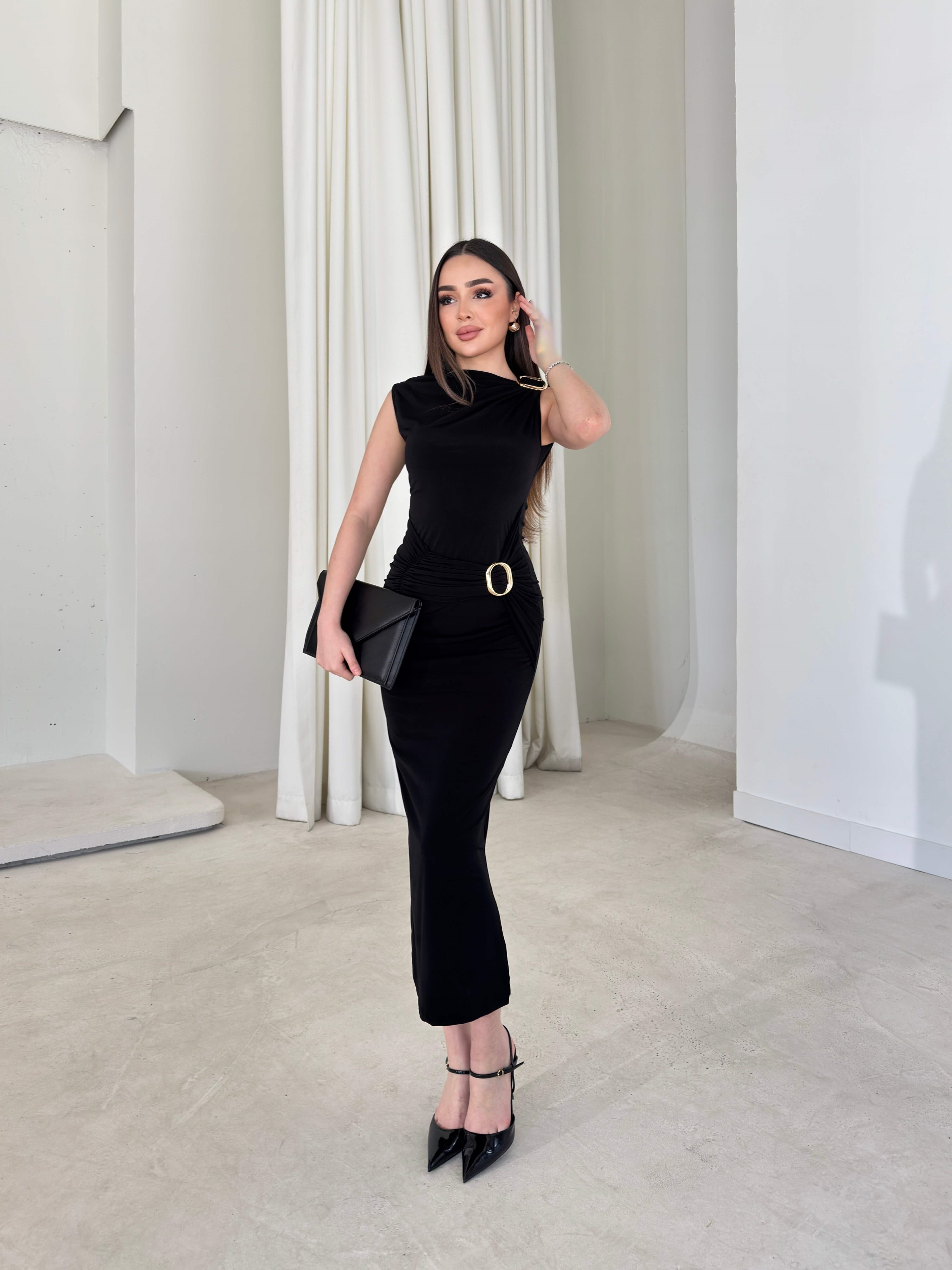 Ön Ve Omuz Aksesuar Detaylı Yandan Yırtmaçlı Siyah Mevren Kadın Elbise 26Y111 (26Y111)