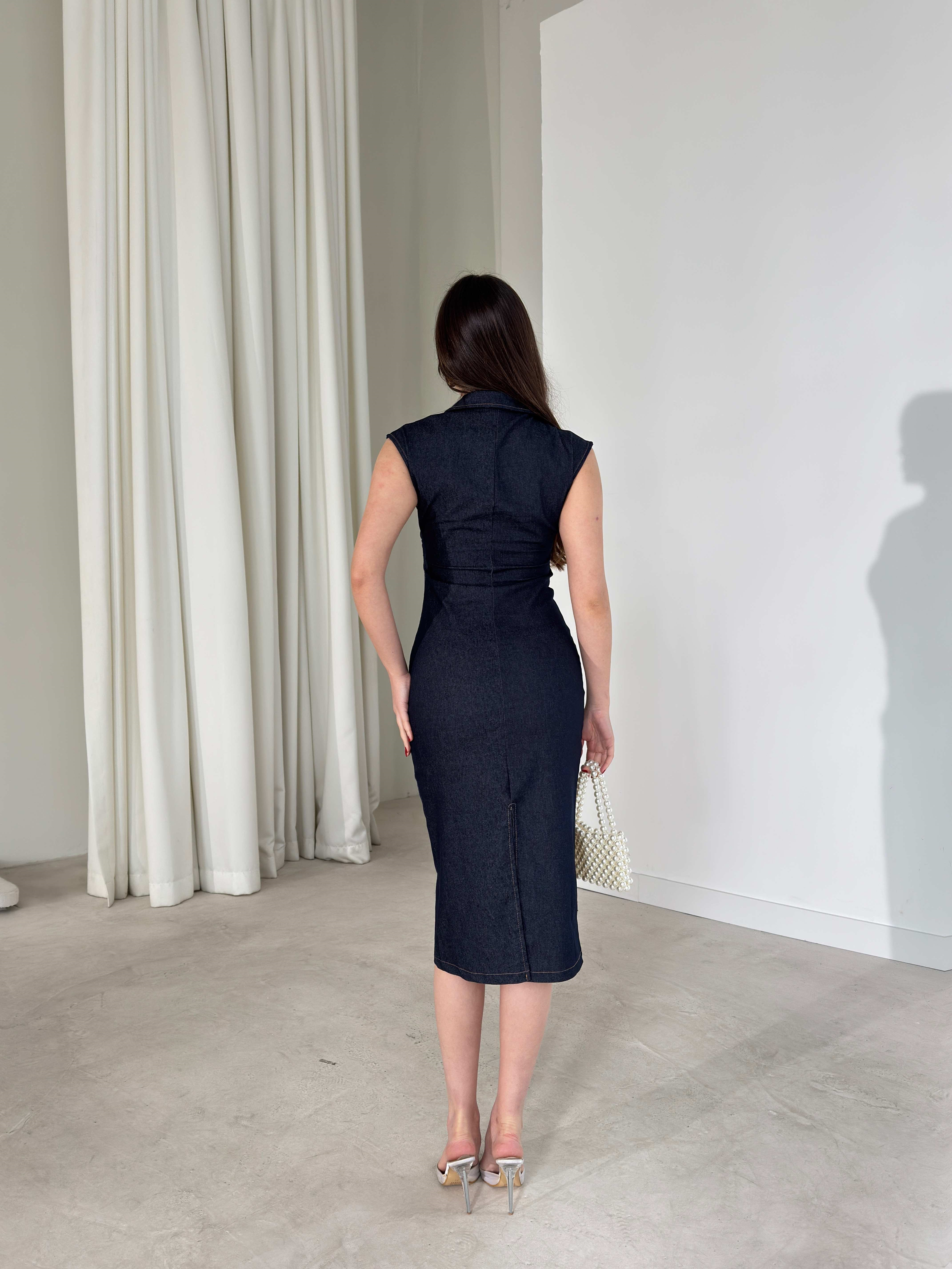 Önü Düğmeli Orta Boy Belden Oturtmalı Denim Lacivert Amara Kadın Elbise 26Y132 (26Y132)