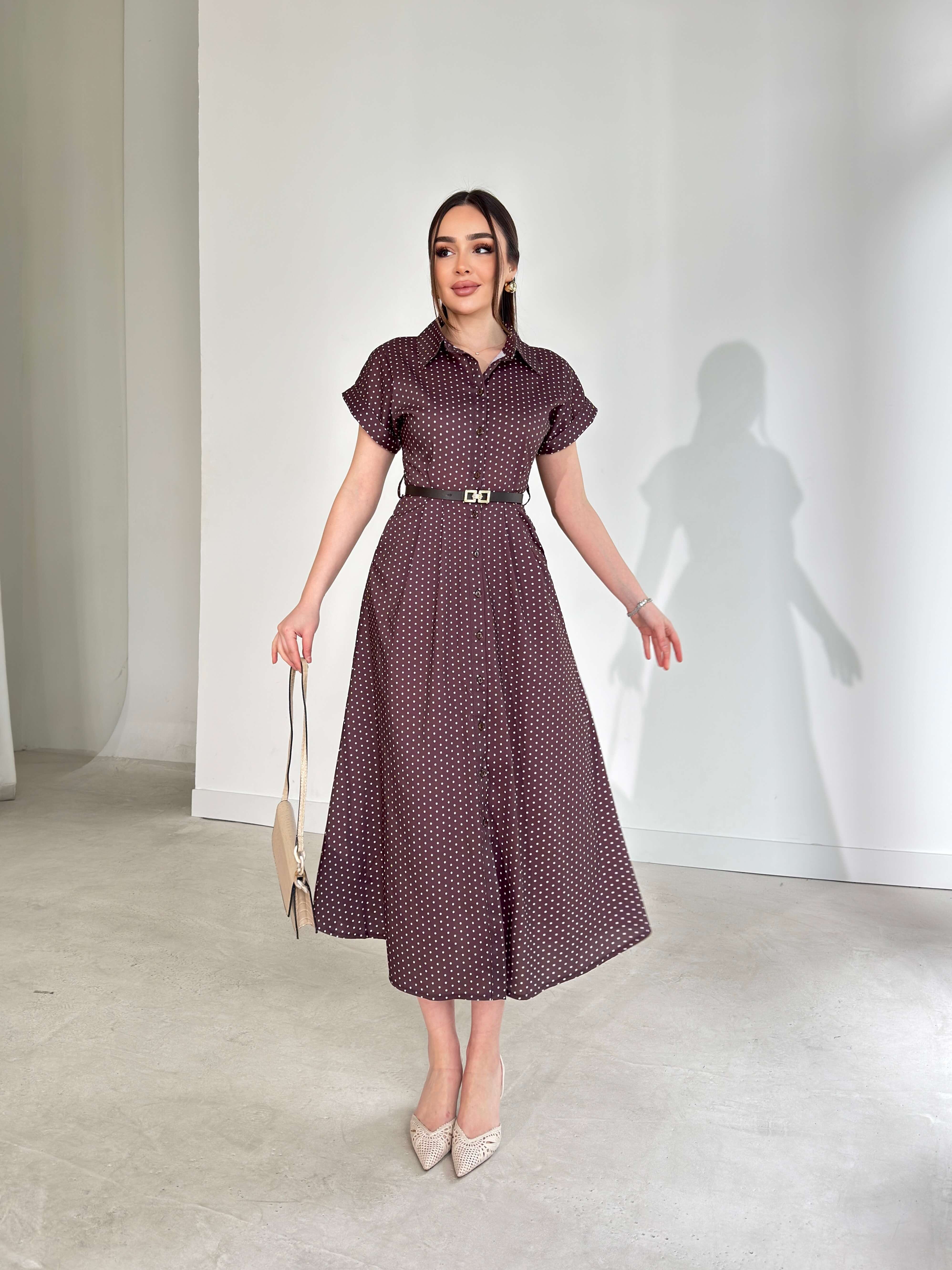 Puantiyeli Kemerli Cep Detaylı Önden Düğmeli Kahverengi Lovri Kadın Elbise 26Y109 (26Y109)