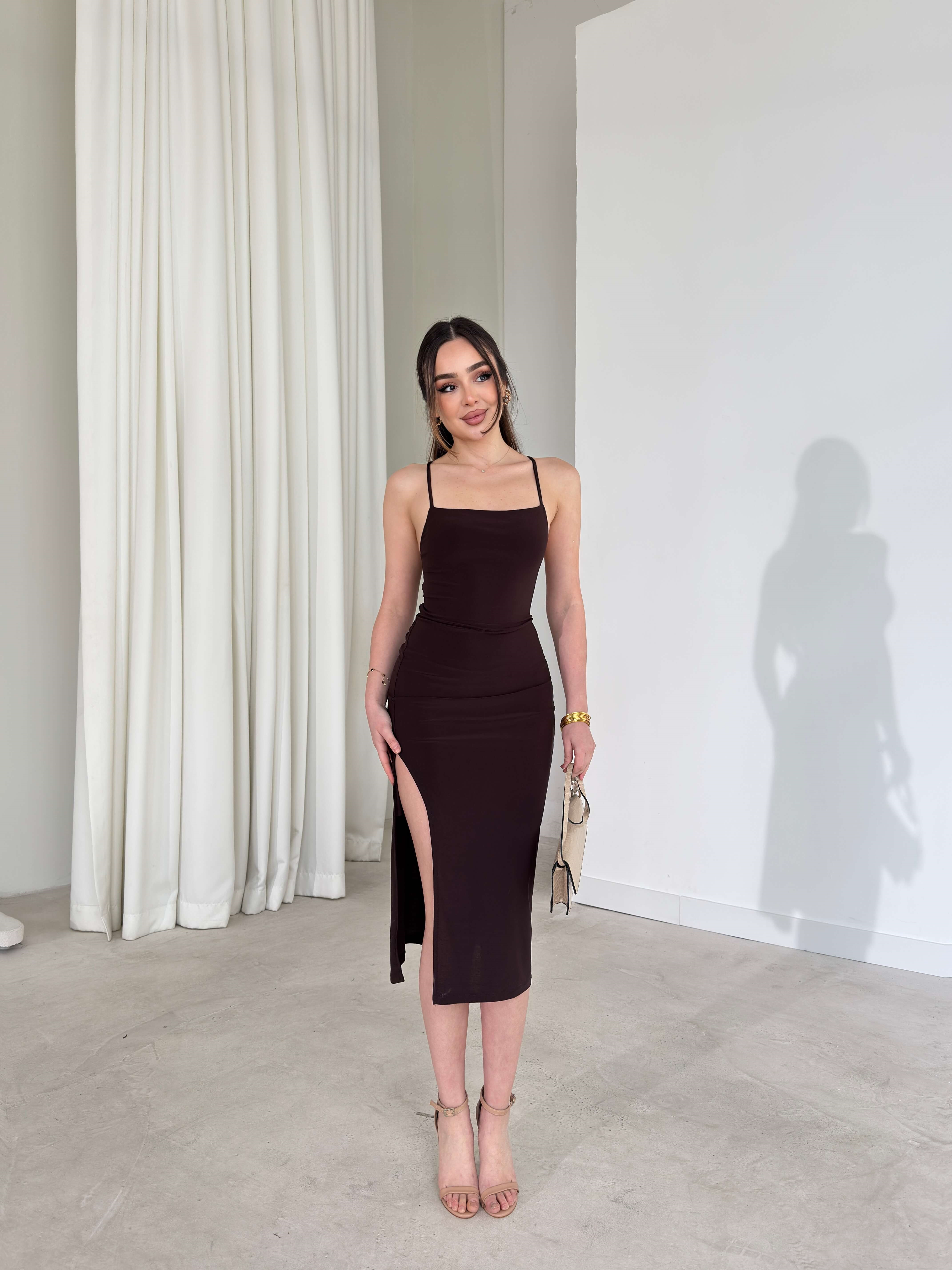 Sırtı İp Bağlamalı Arkası Drapeli Yırtmaçlı Dafi Kahve Kadın Elbise 26Y100 (26Y100)