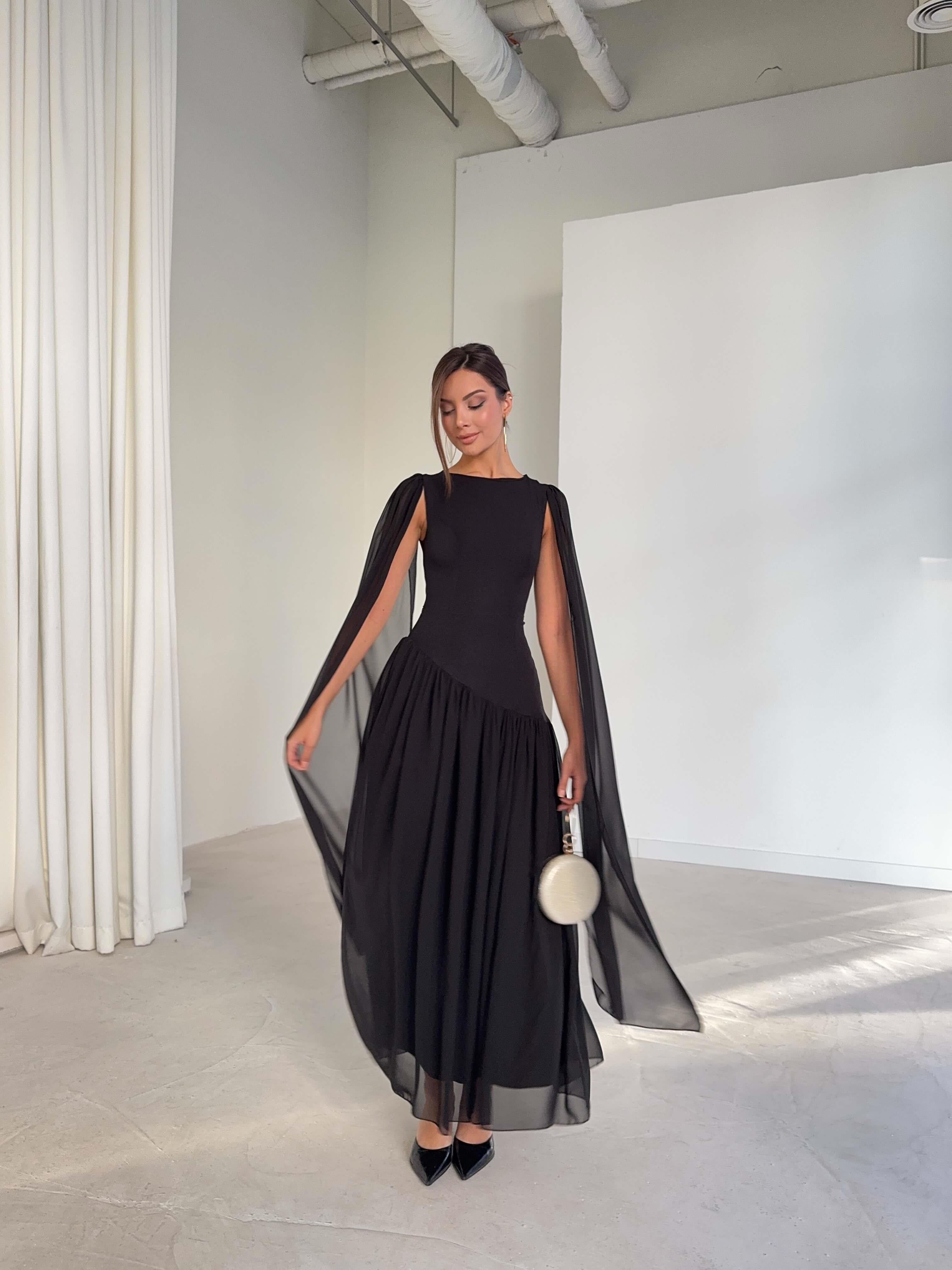 Sırtı İpli Kolları Tül Detaylı Gale Siyah Kadın Elbise 26K240 (26K240)