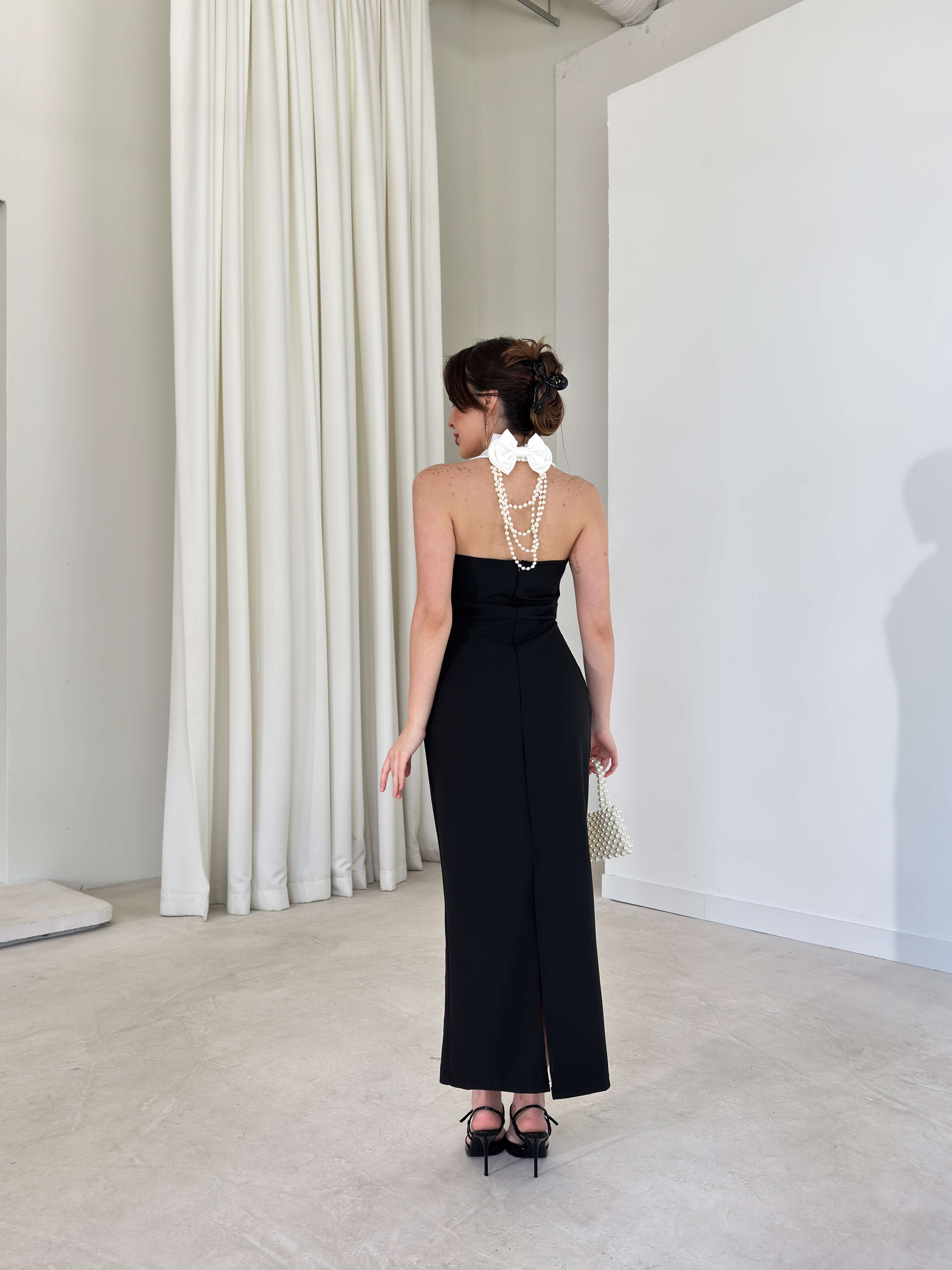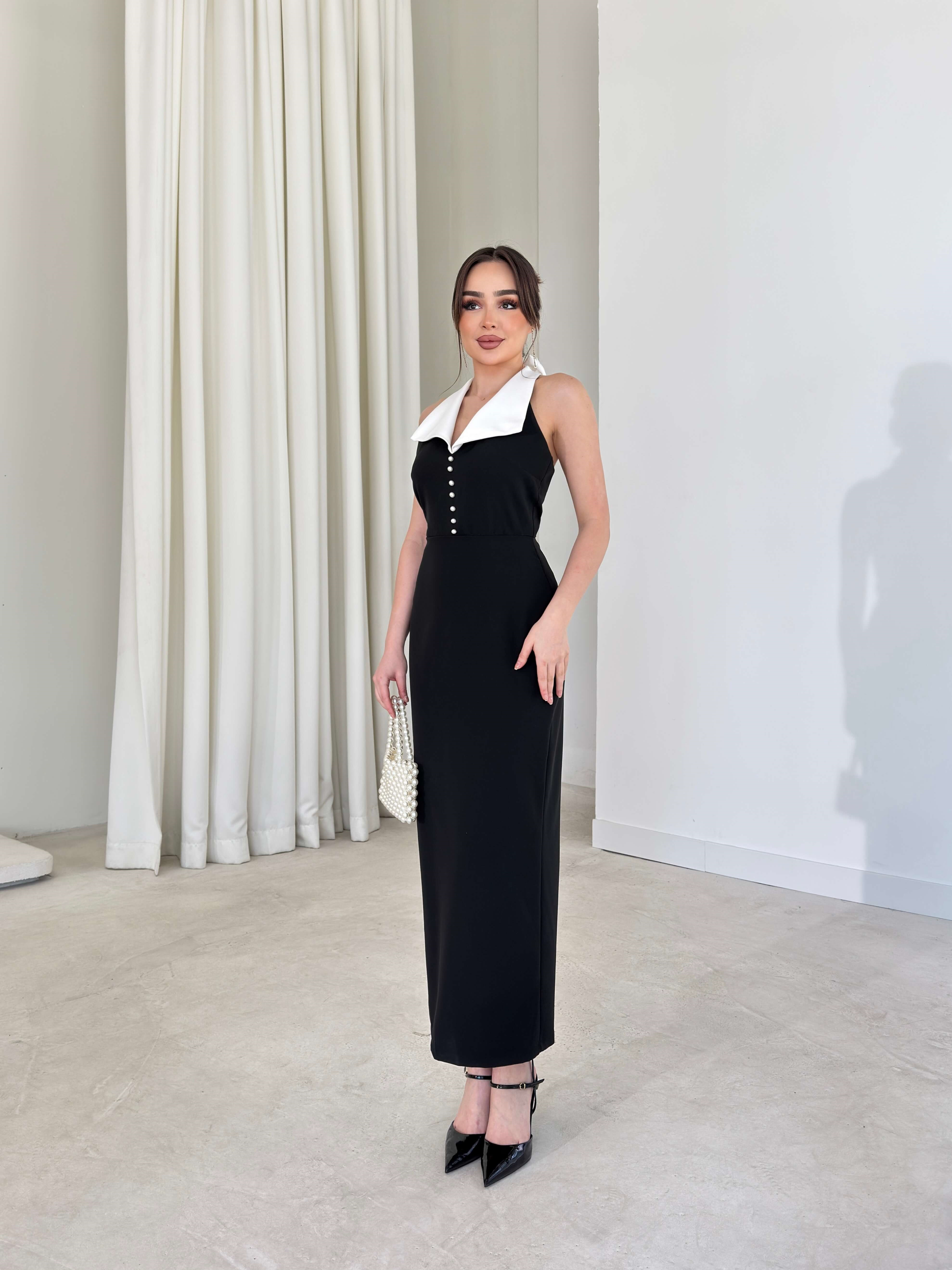 V Yaka Boynu Aksesuarlı Düğme Detaylı William Siyah Kadın Elbise 26Y145 (26Y145)