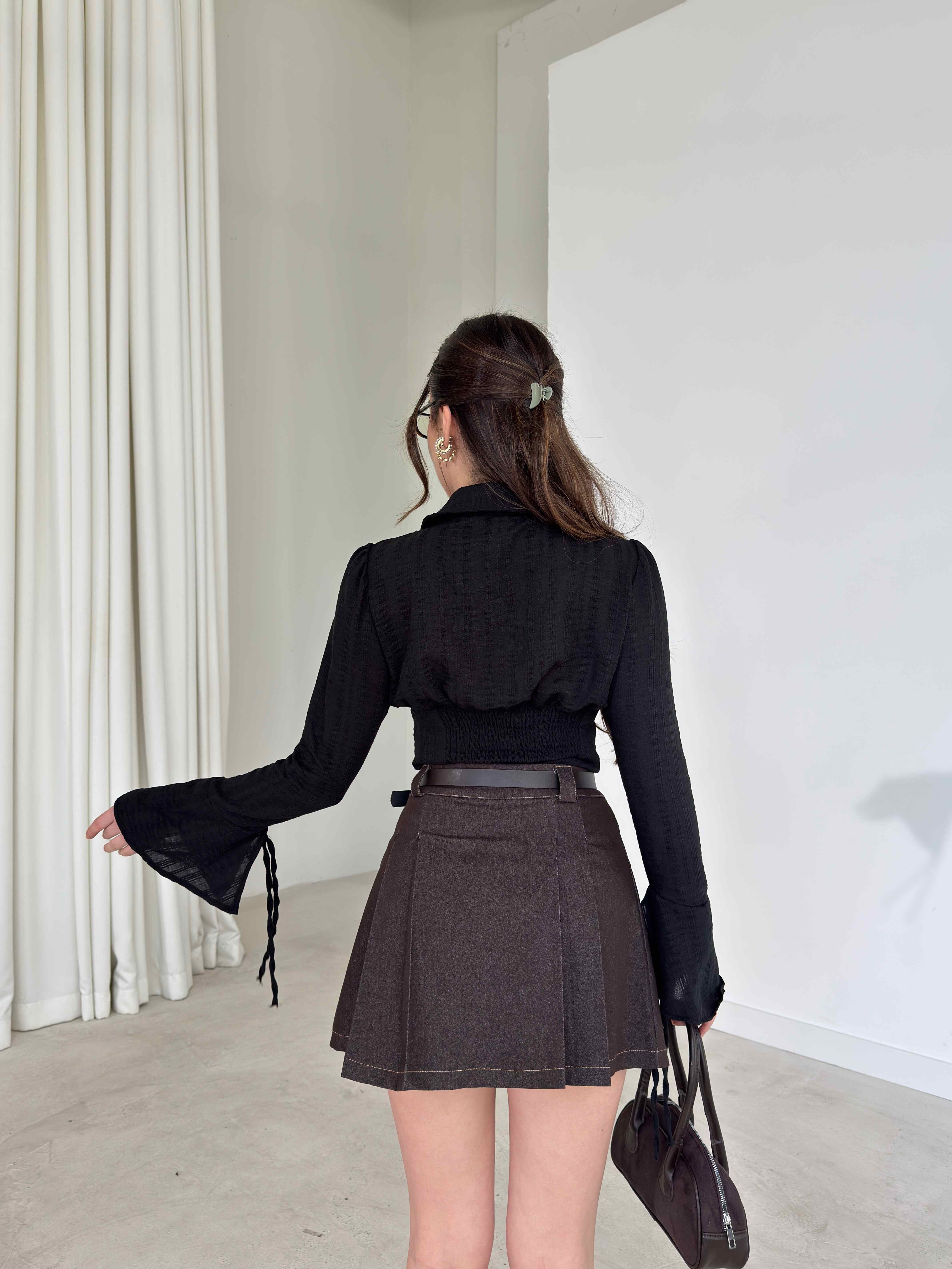 Yakası Fırfırlı V Yaka Kolları İpli Belden Oturtmalı Fermone Siyah Kadın Bluz 26Y089 (26Y089)