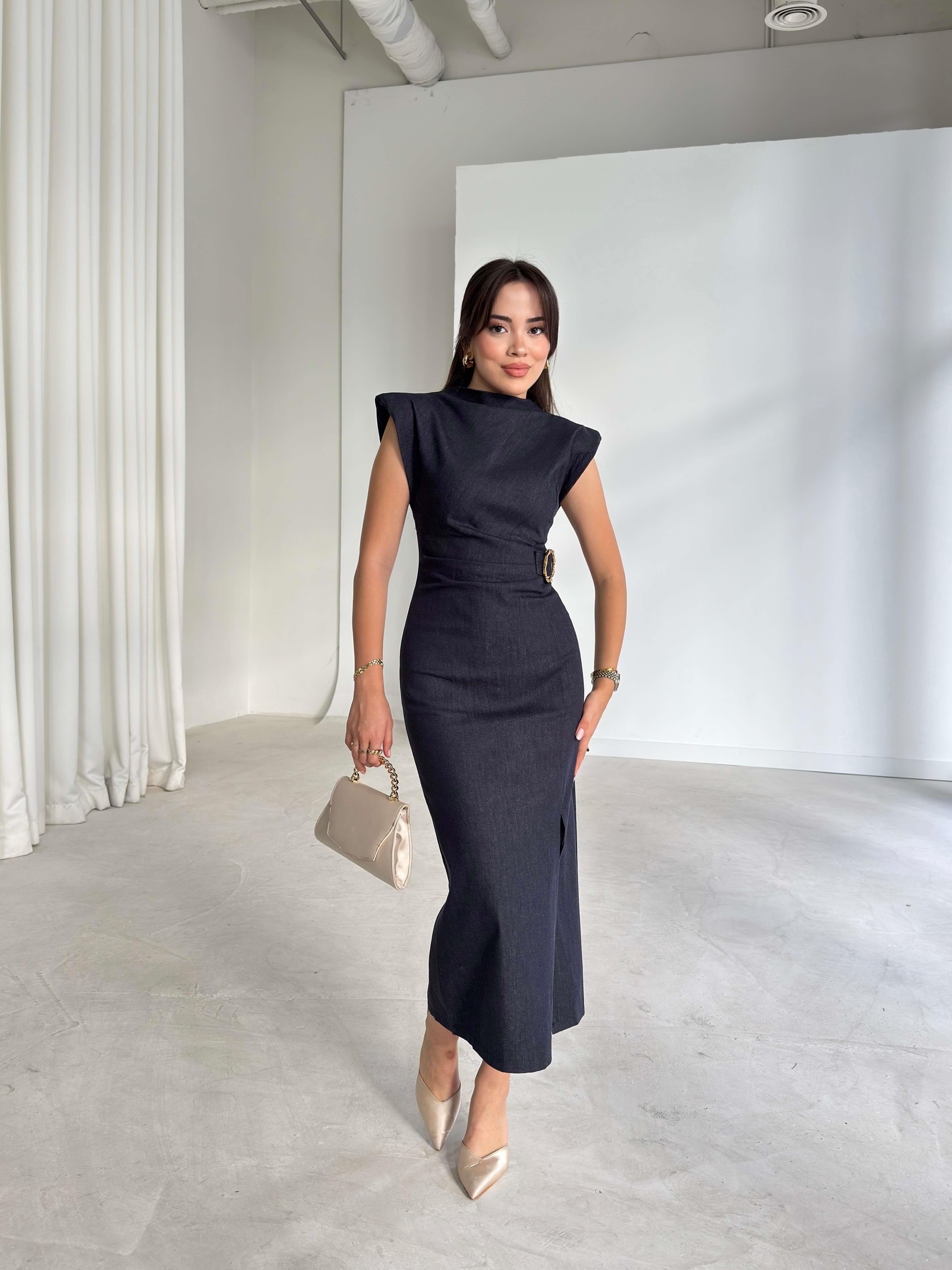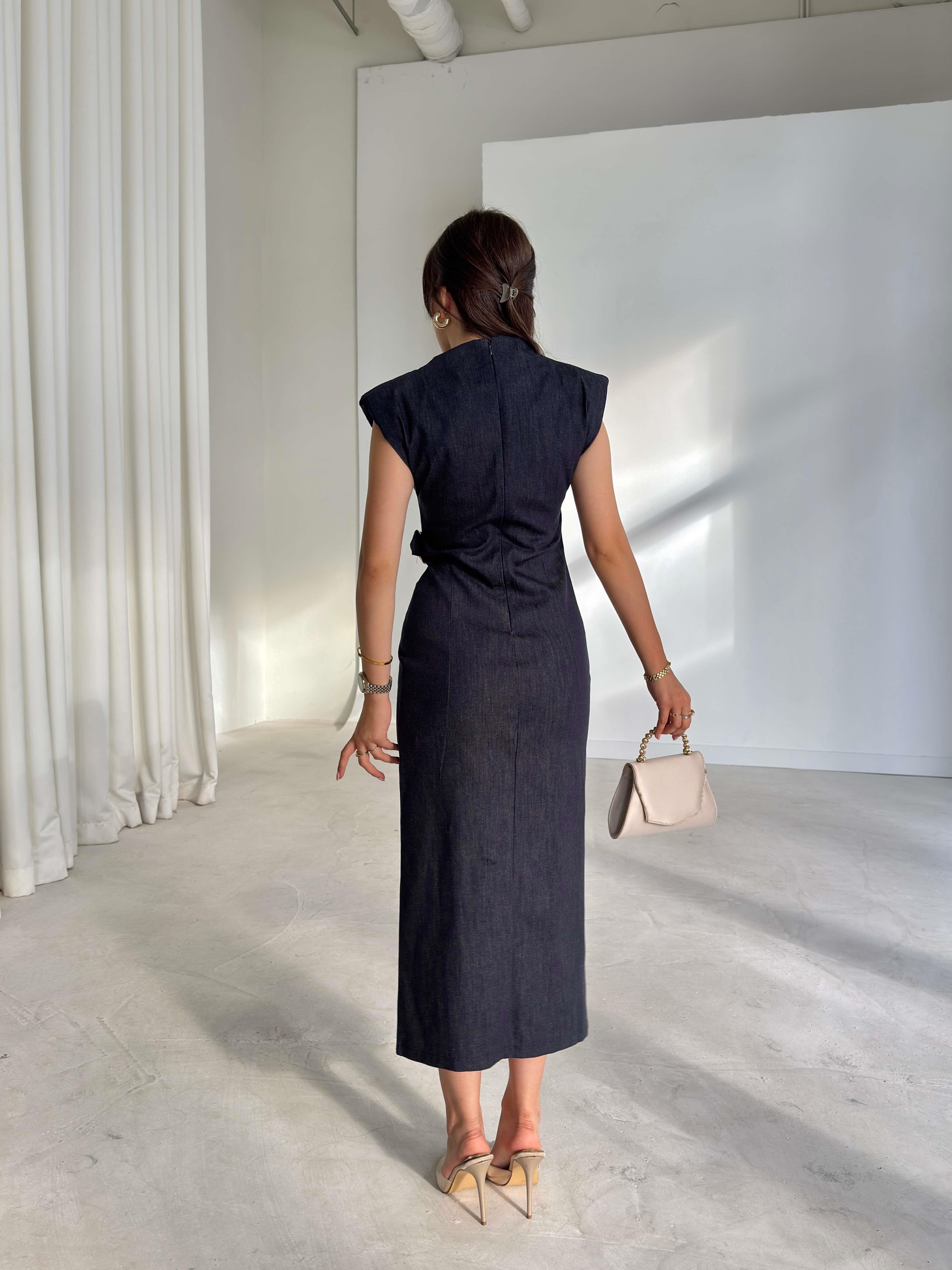 Yanı Yırtmaçlı Drape Detaylı Aksesuarlı Adrian Lacivert Kadın Kot Elbise 26K204 (26K204)
