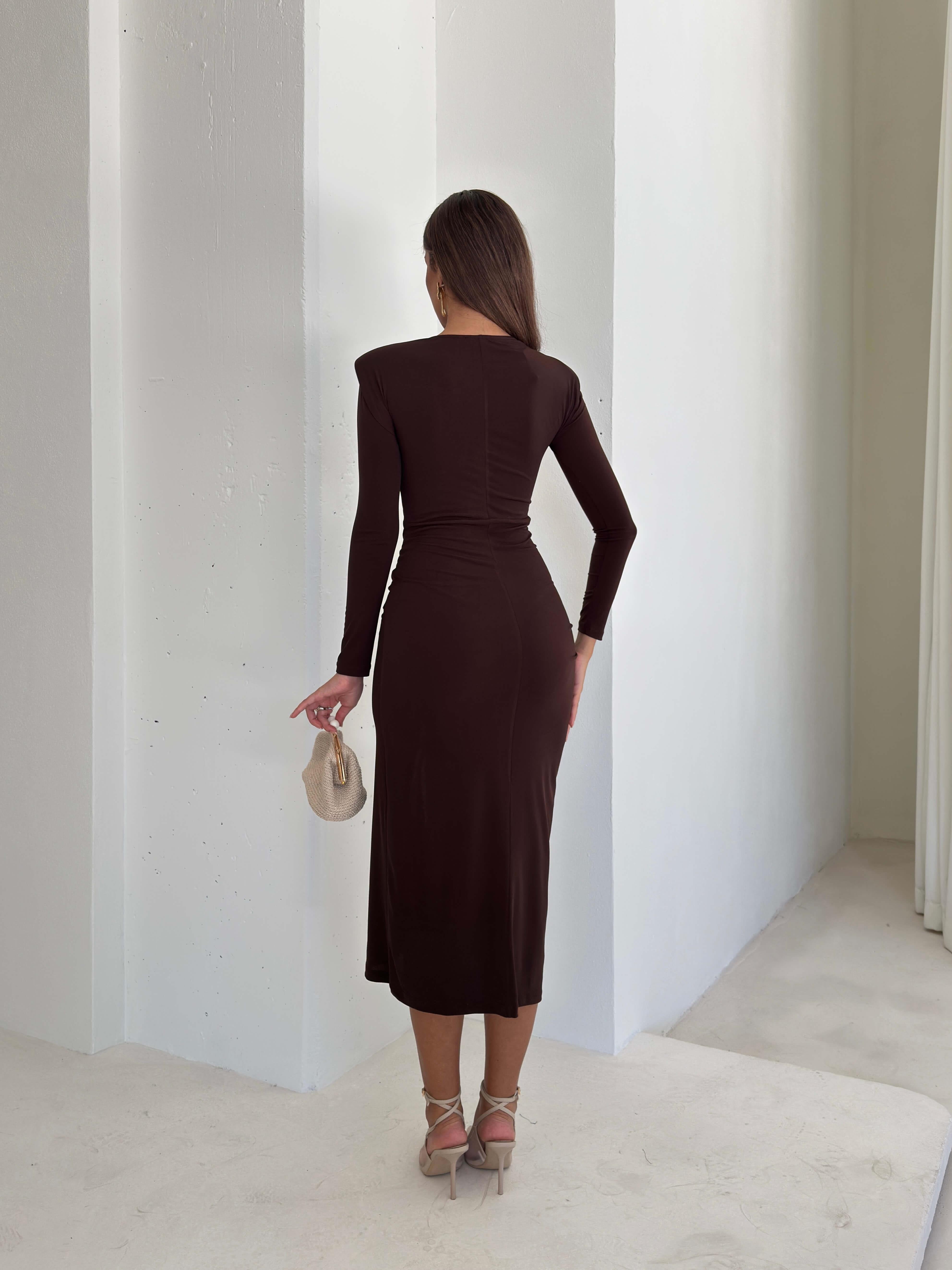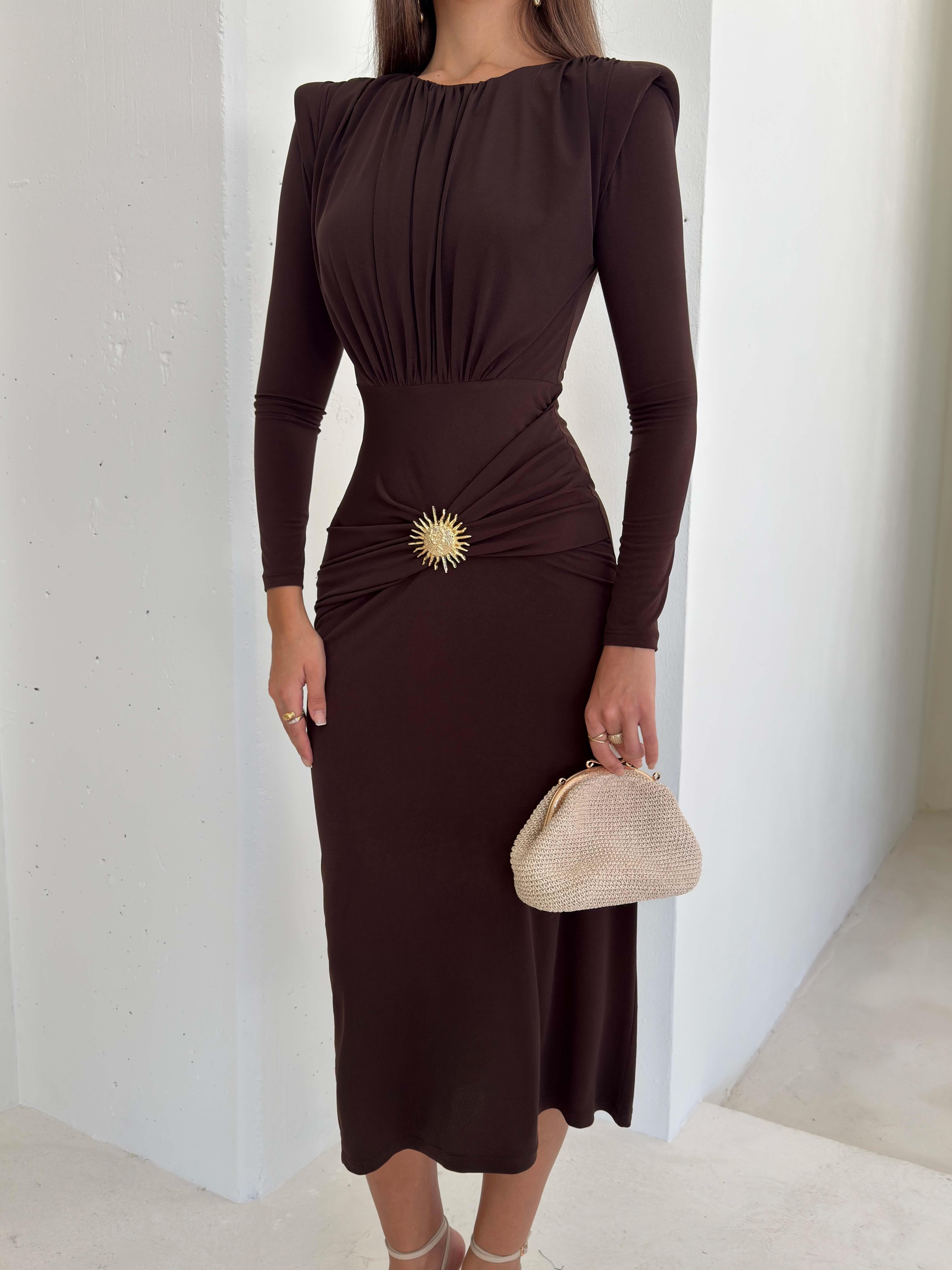 Aksesuarlı Omzu Vatkalı Drape Detaylı Gineş Kahve Kadın Elbise 26K100 (26K100)
