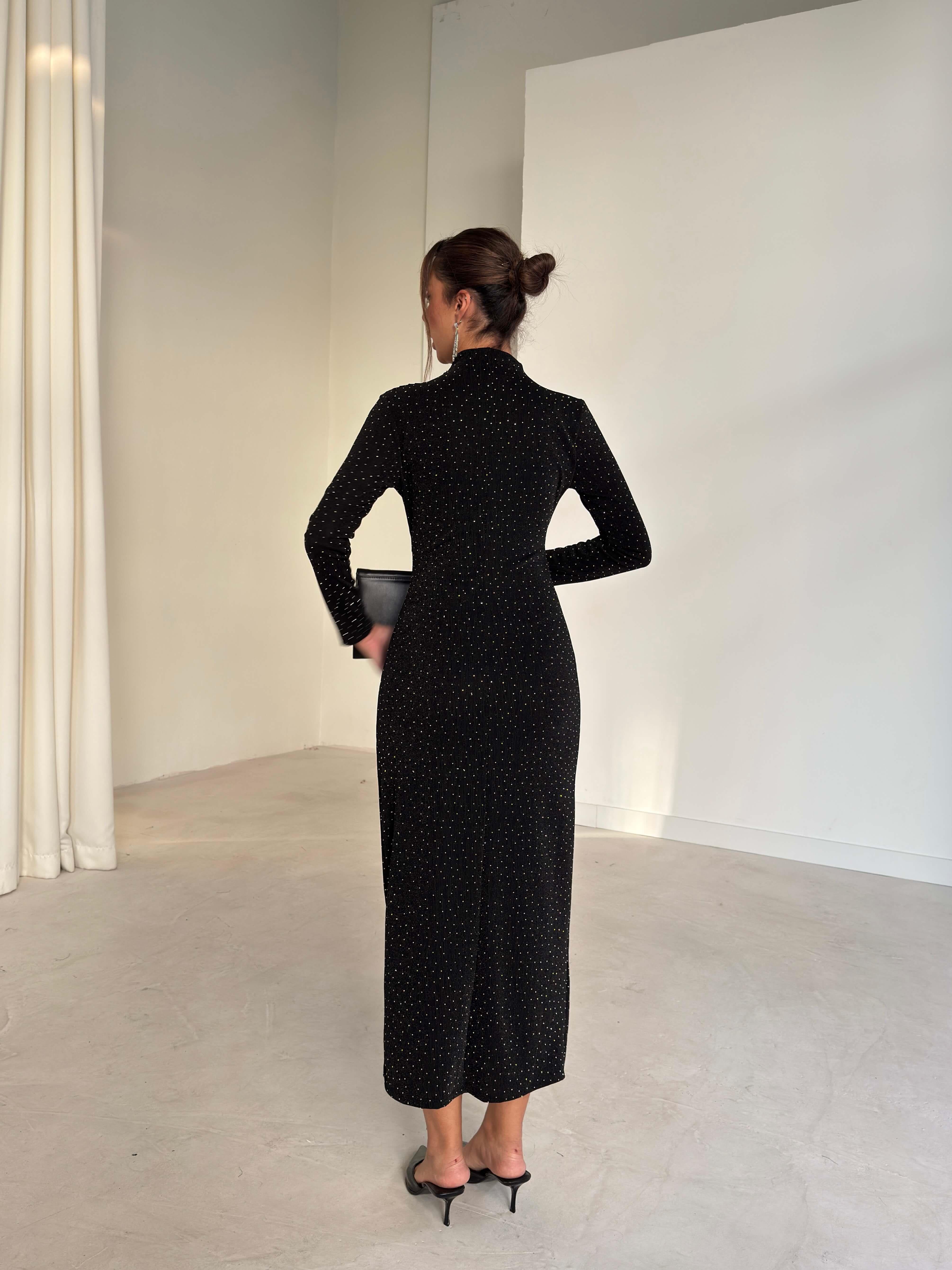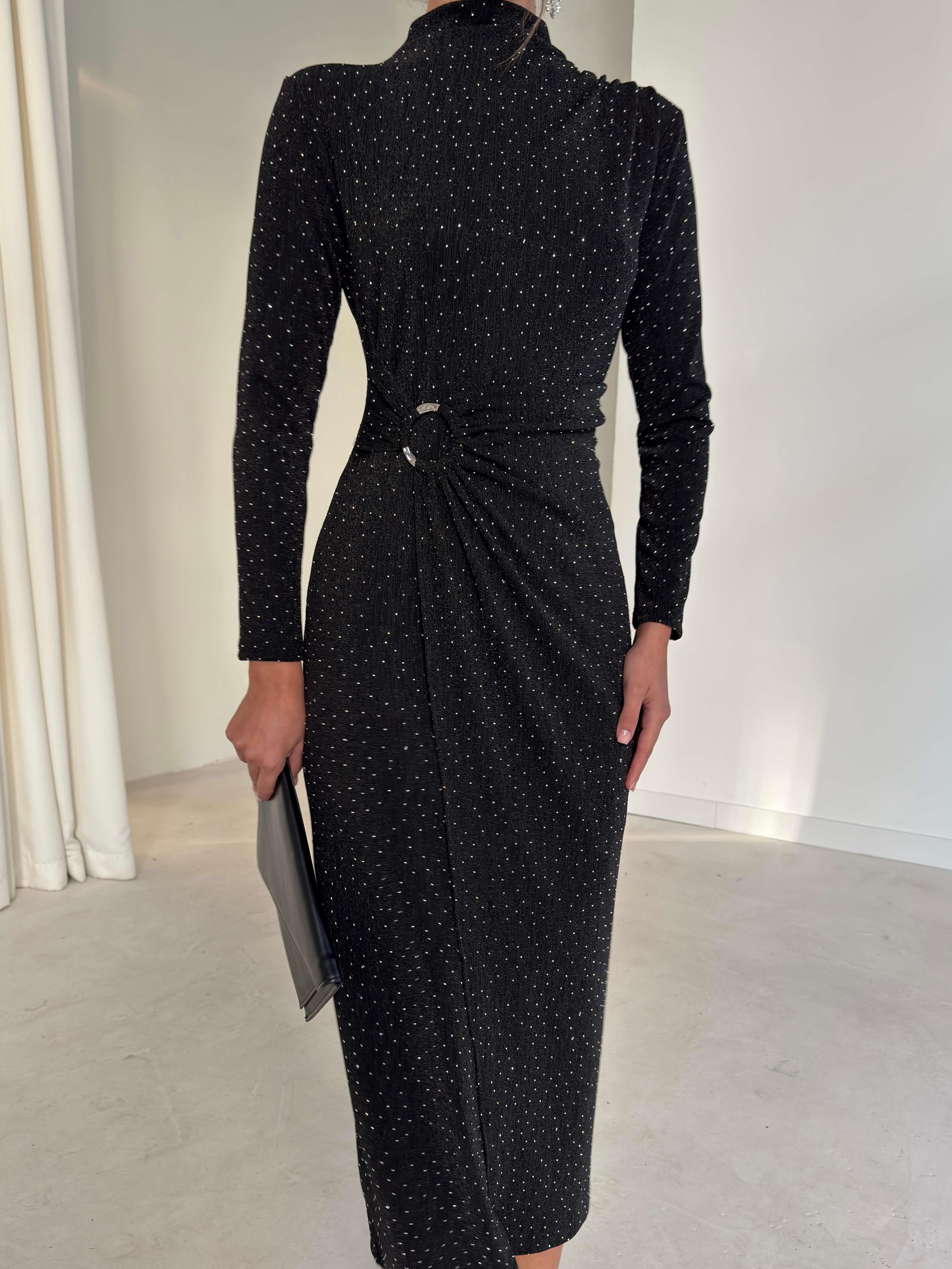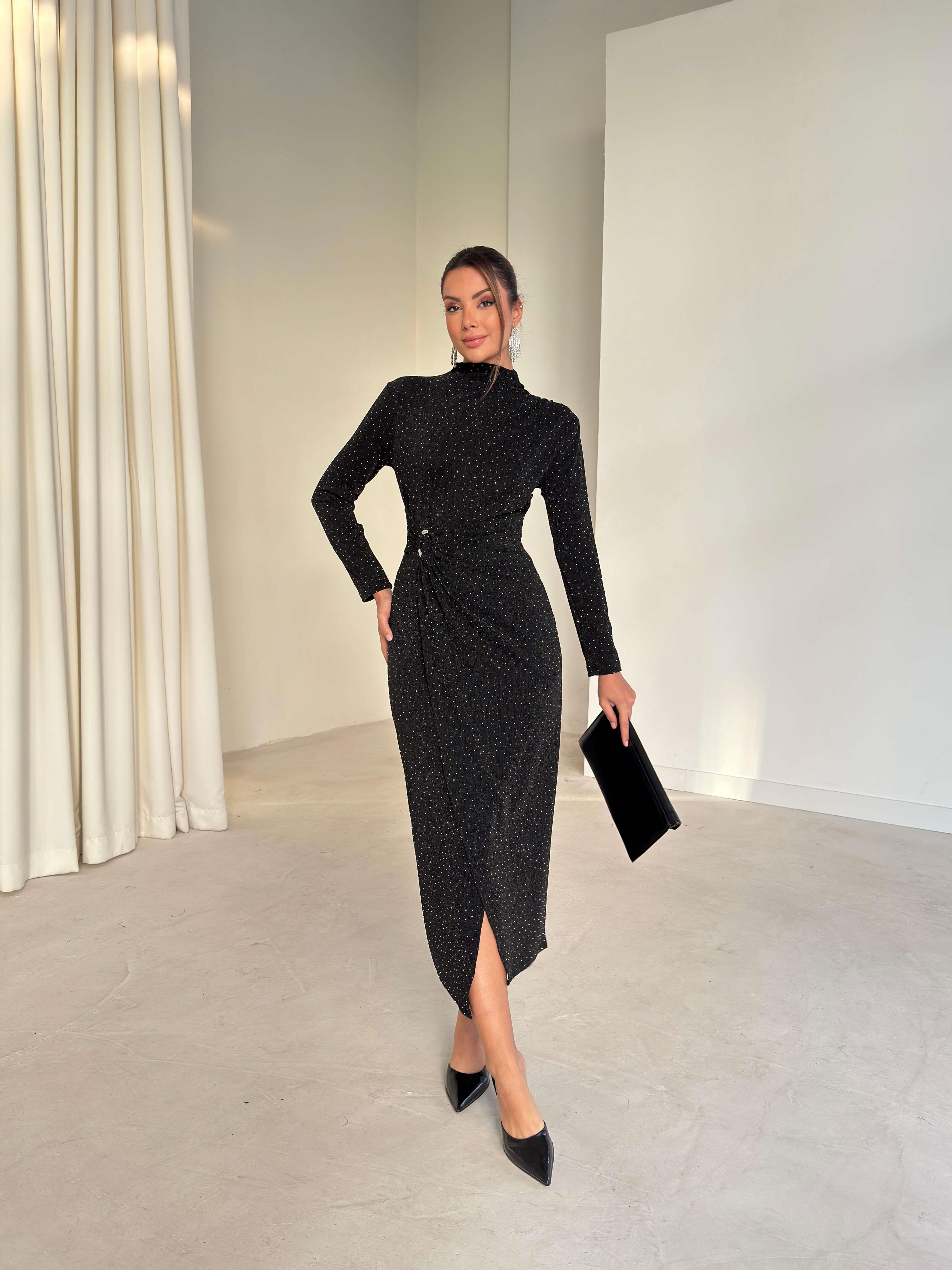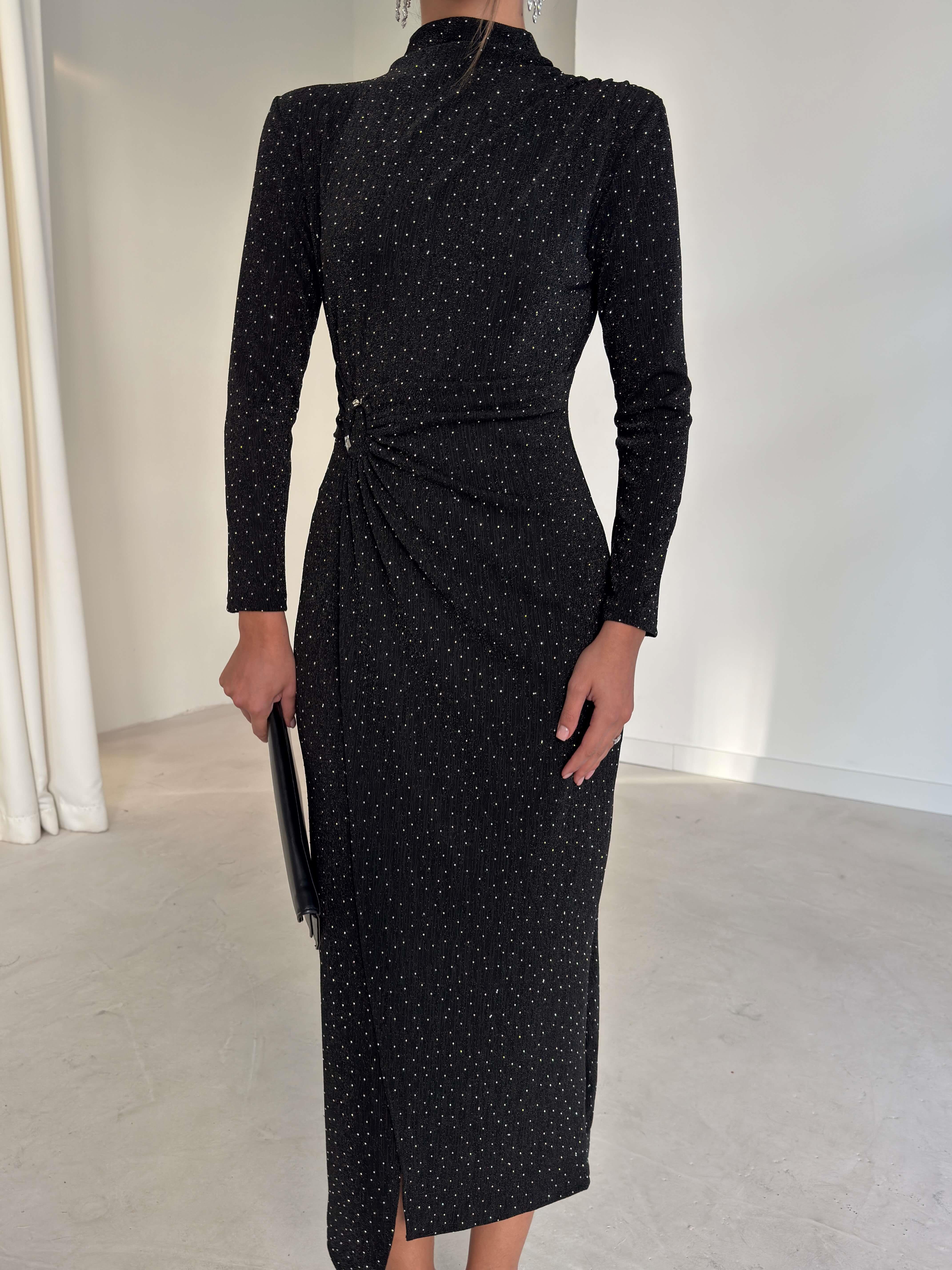 Aksesuarlı Parlak Kruvaze Kesim Drape Detaylı Jasper Siyah Kadın Elbise 26K280 (26K280)