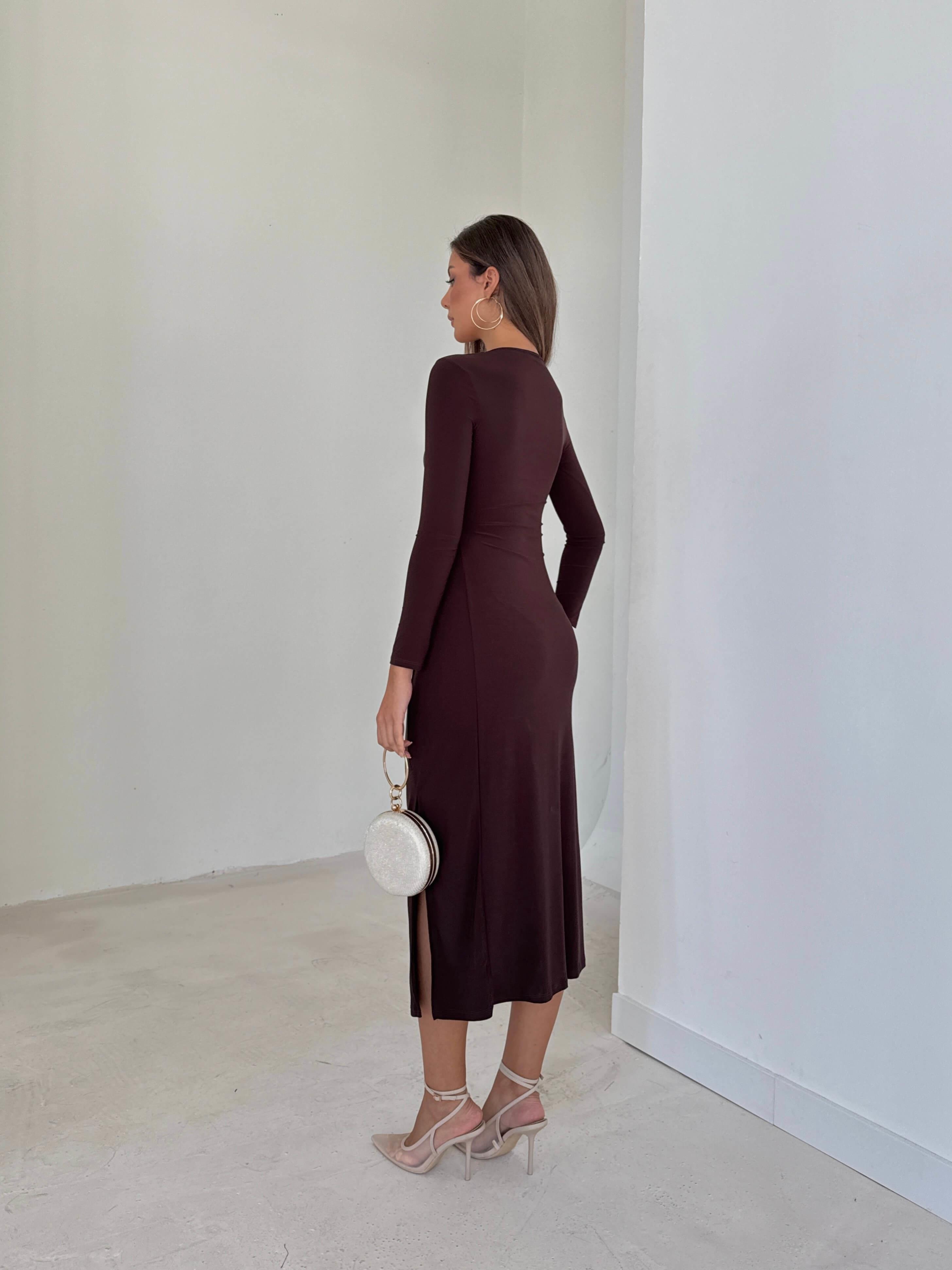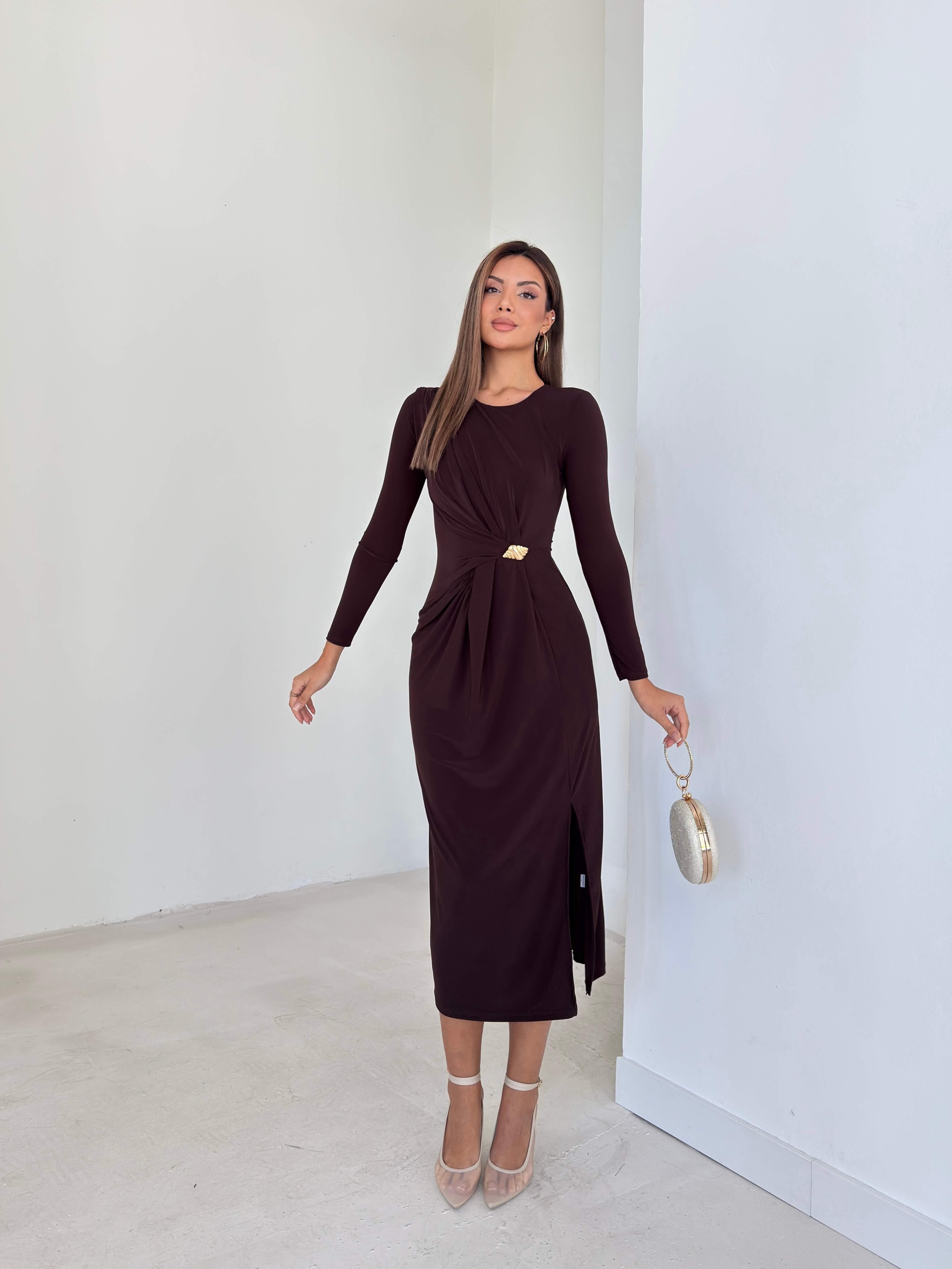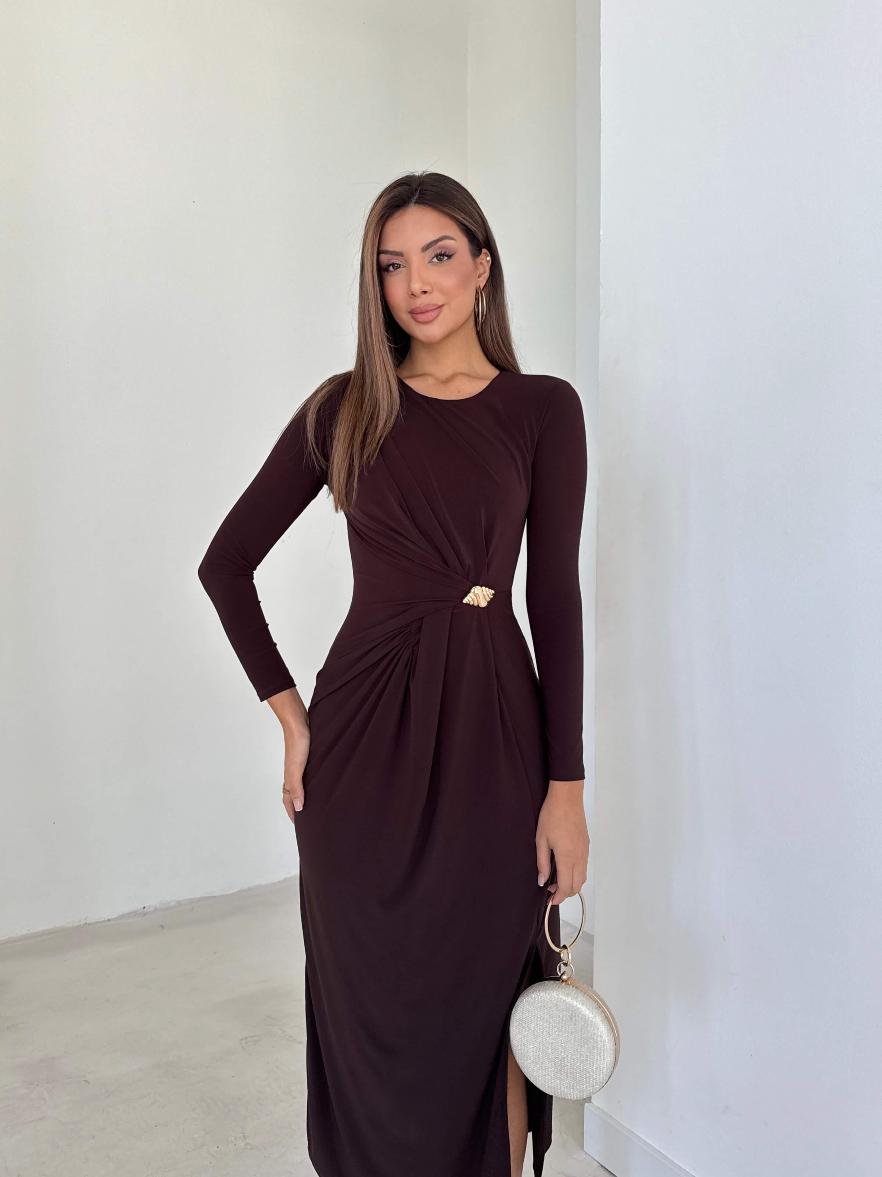 Aksesuarlı Yanı Yırtmaçlı Yekar Kahve Kadın Elbise 26K115 (26K115)