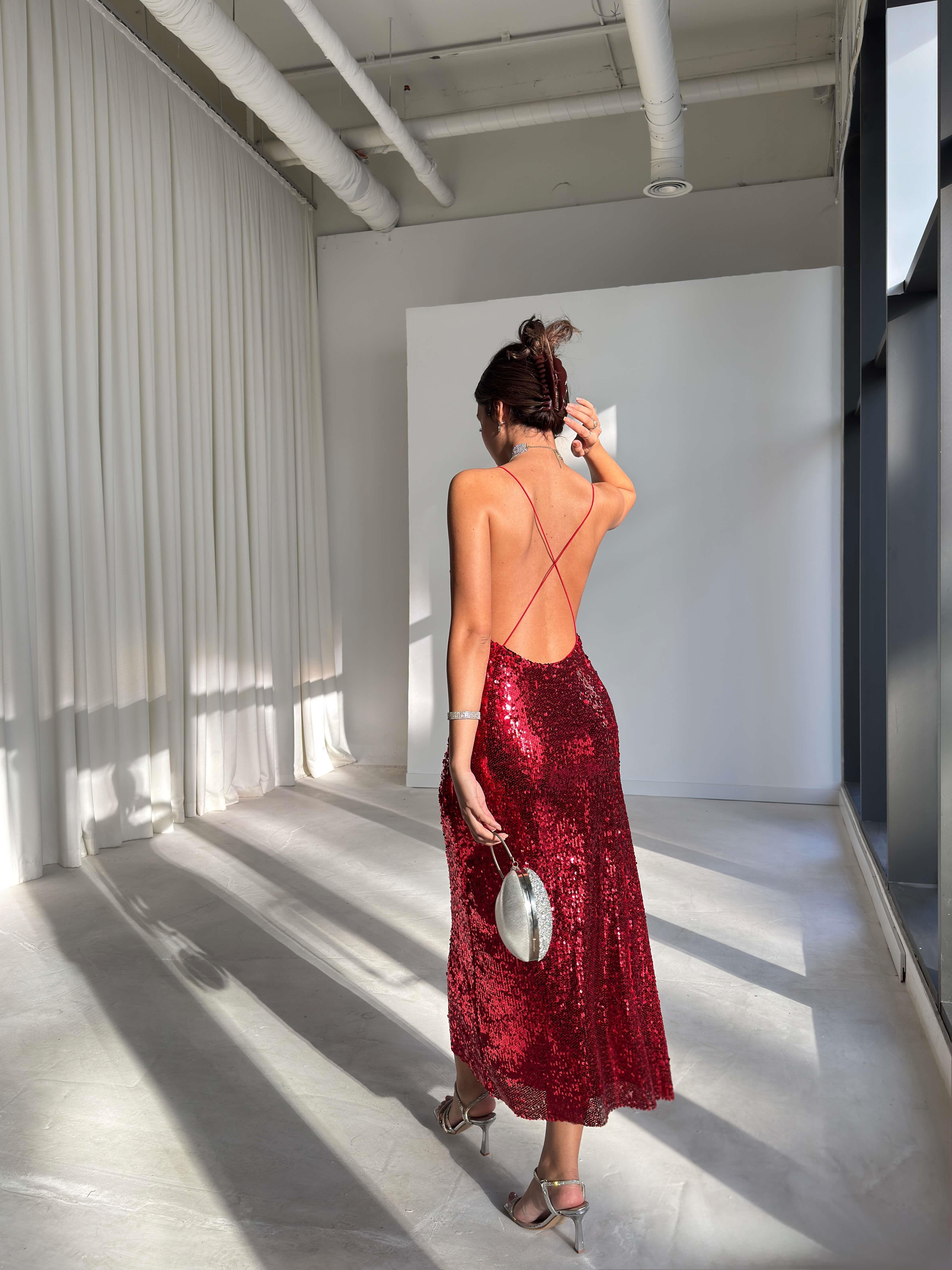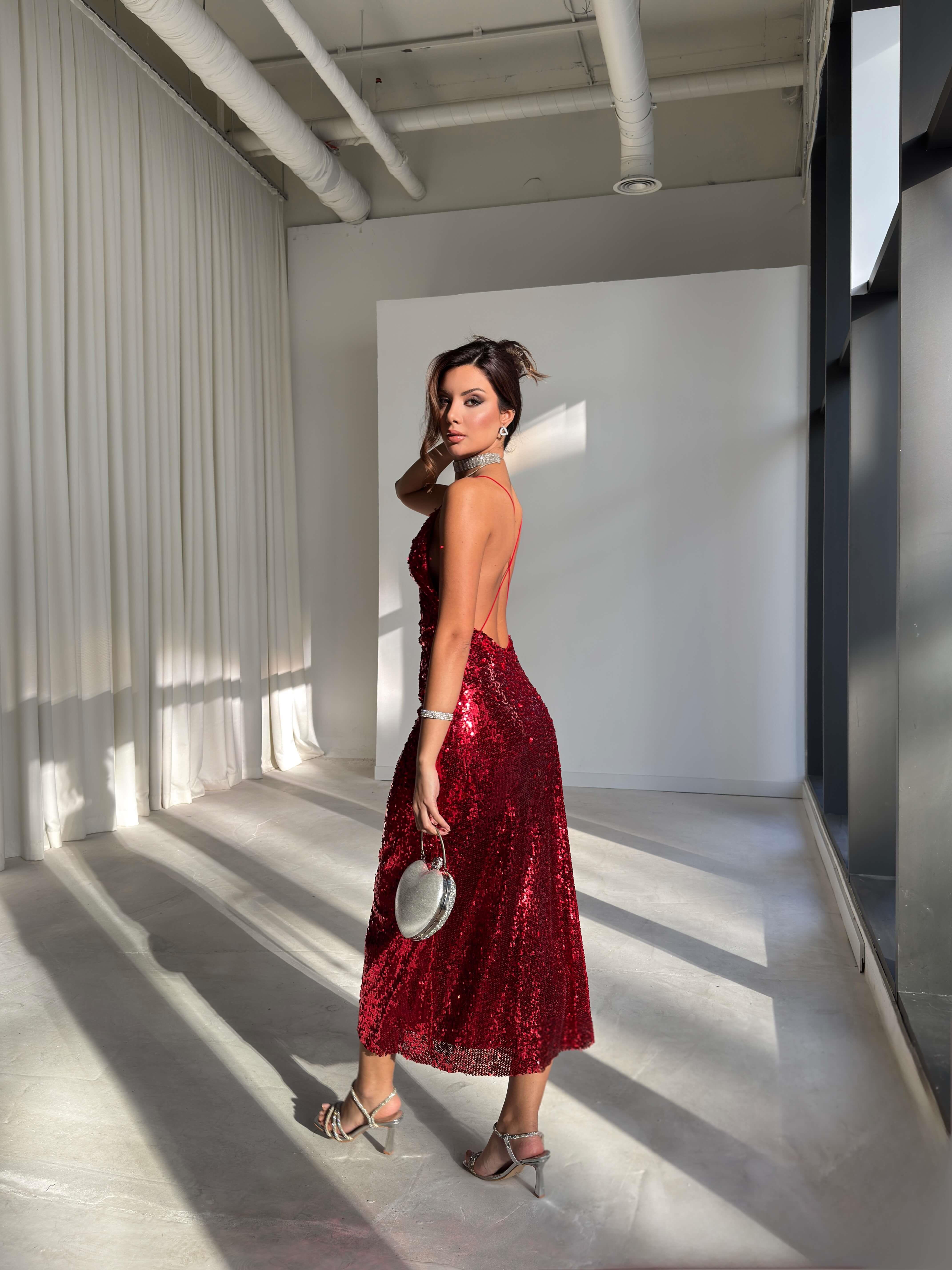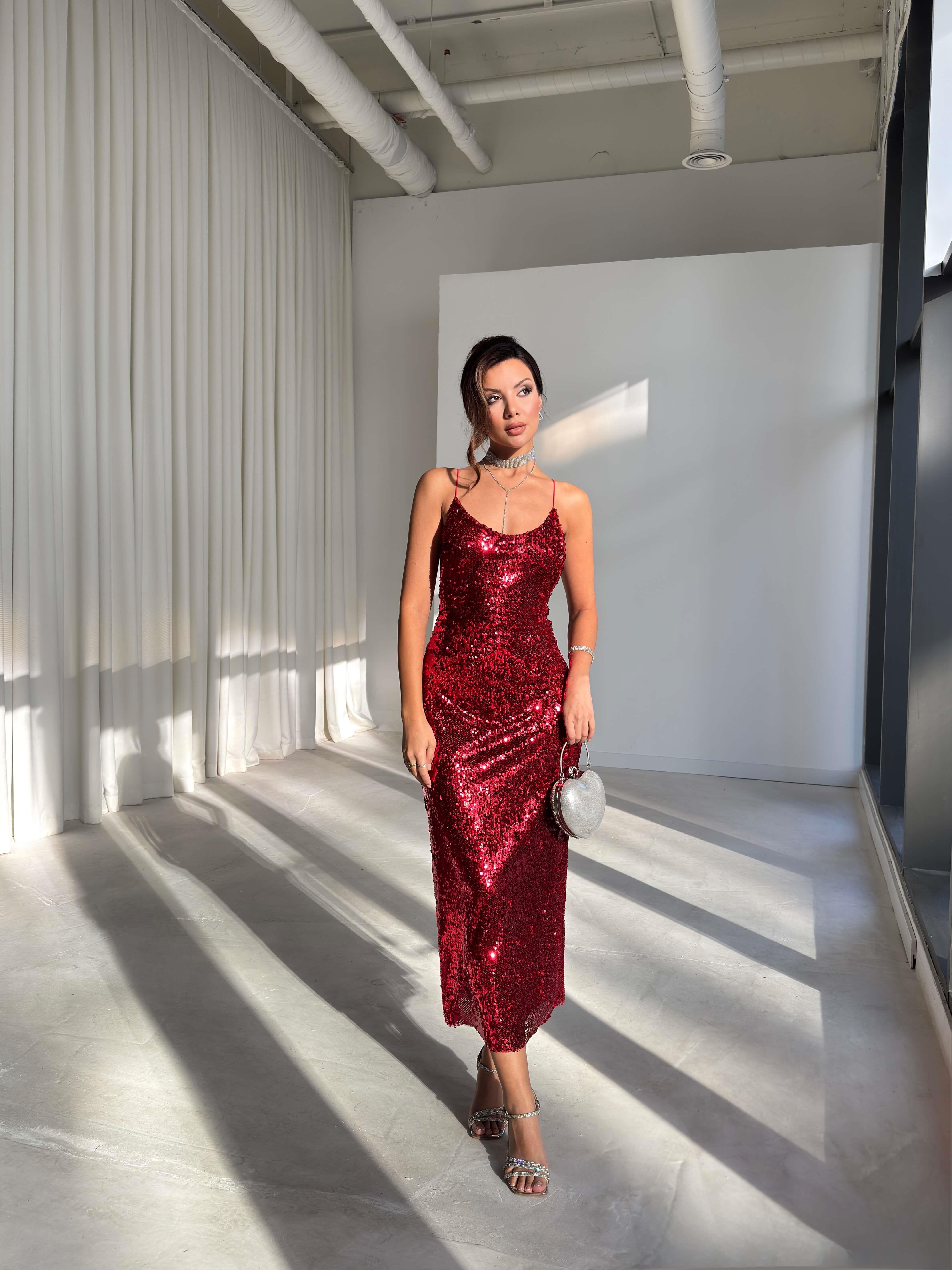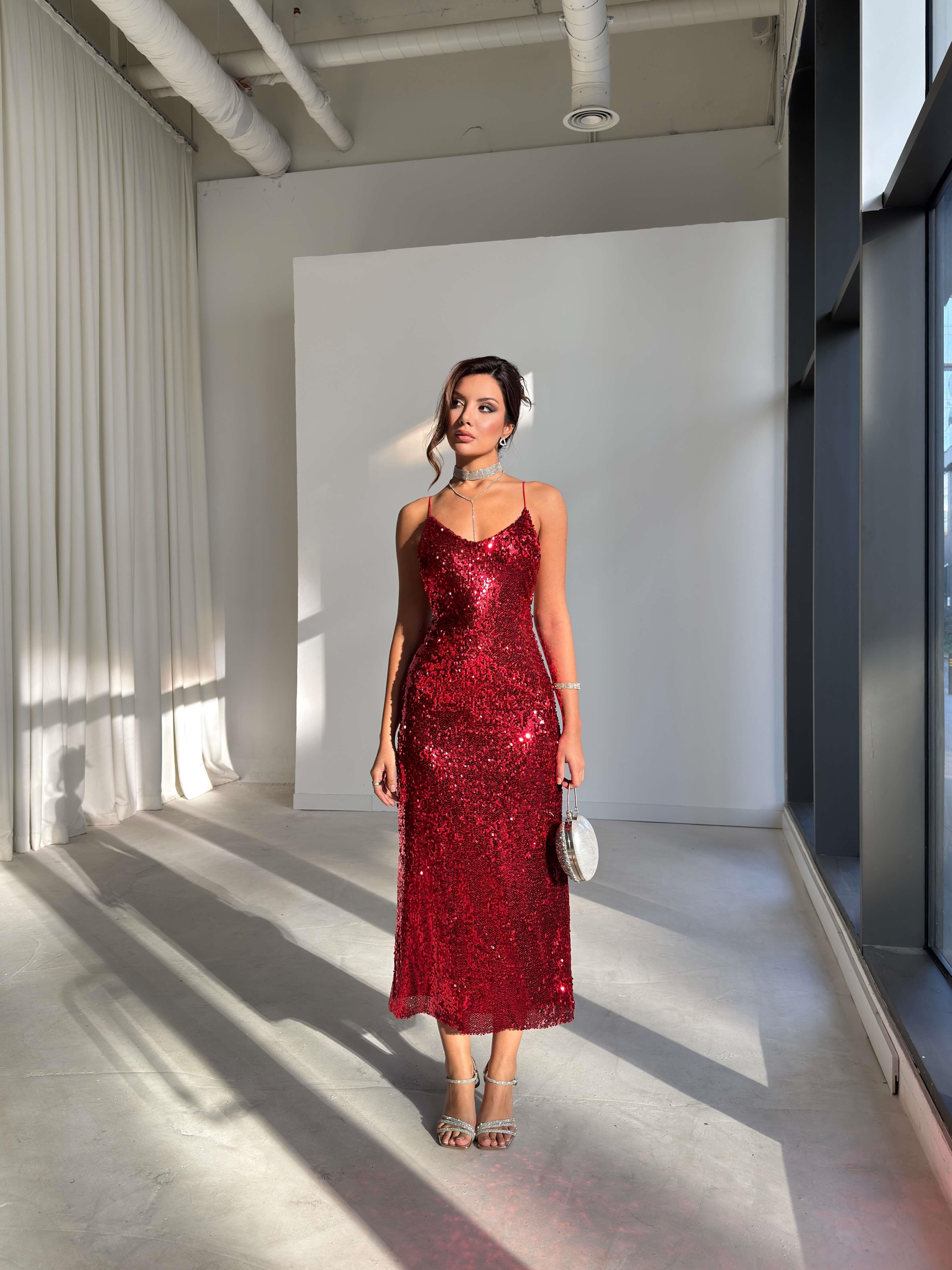 Askılı Sırtı Çapraz Earle Kırmızı Kadın Pullu Elbise 26K229 (26K229)