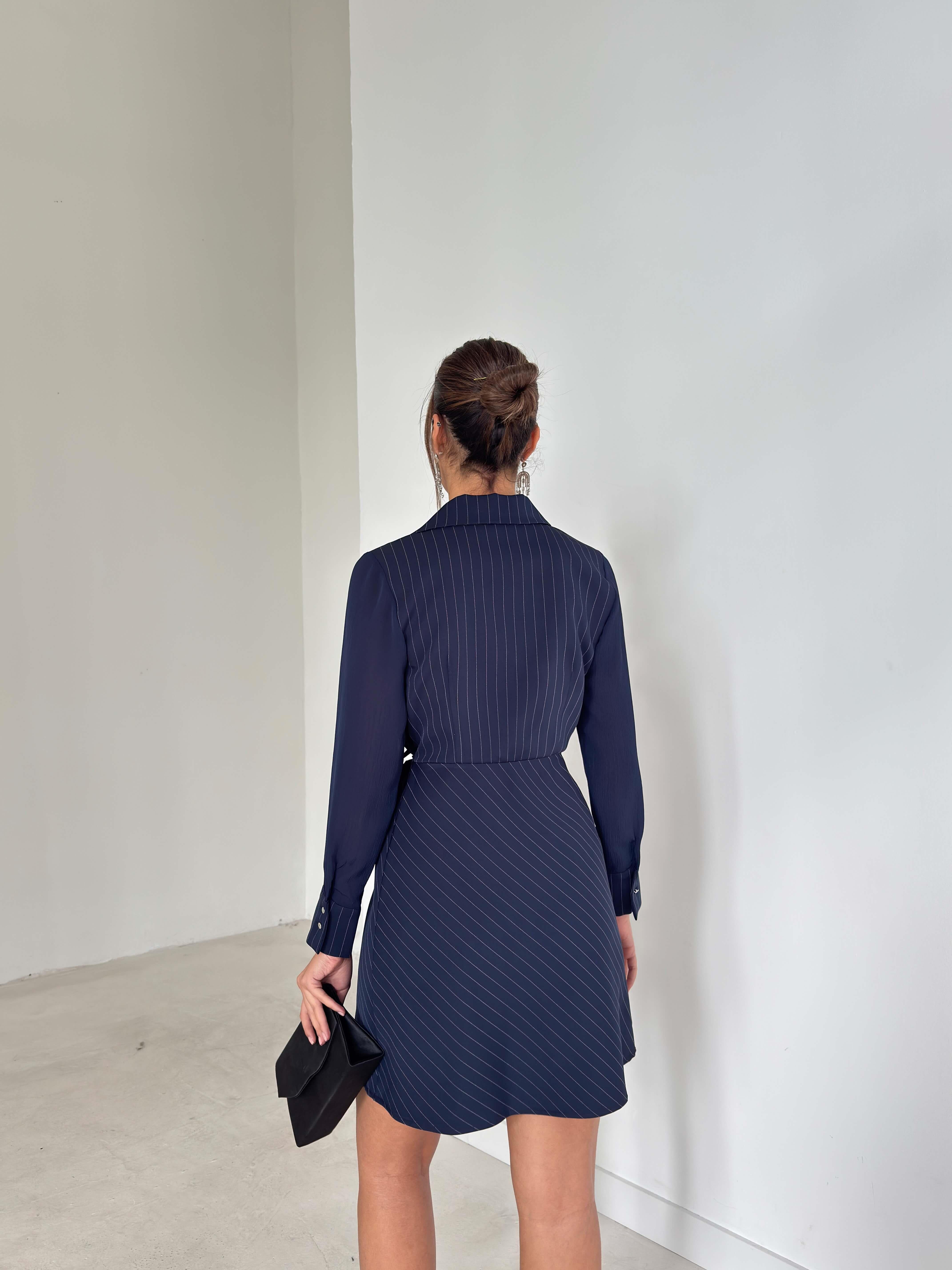 Çizgili Yandan Bağlamalı Kruvaze Kesim Willy Lacivert Kadın Elbise 26K286 (26K286)