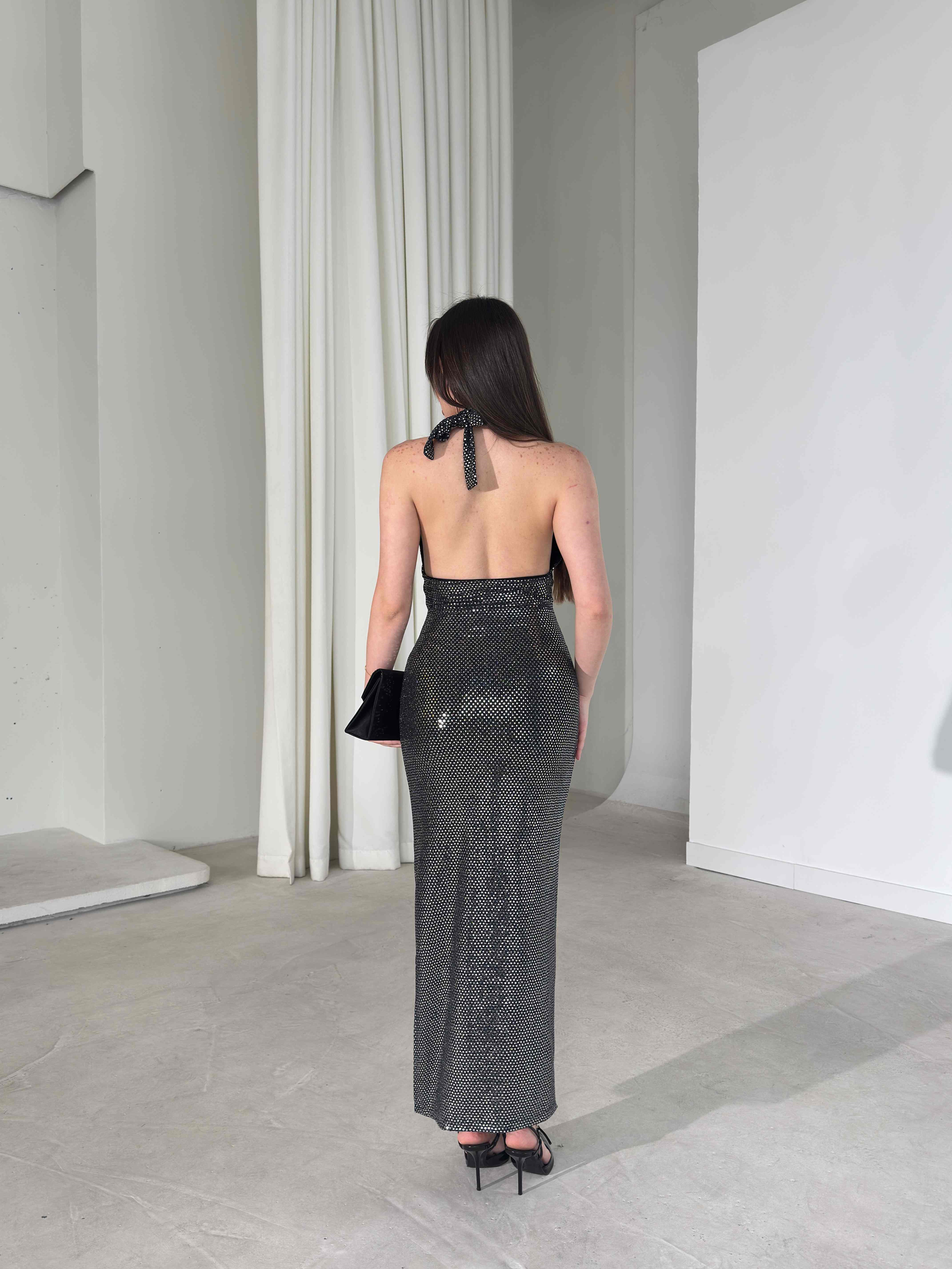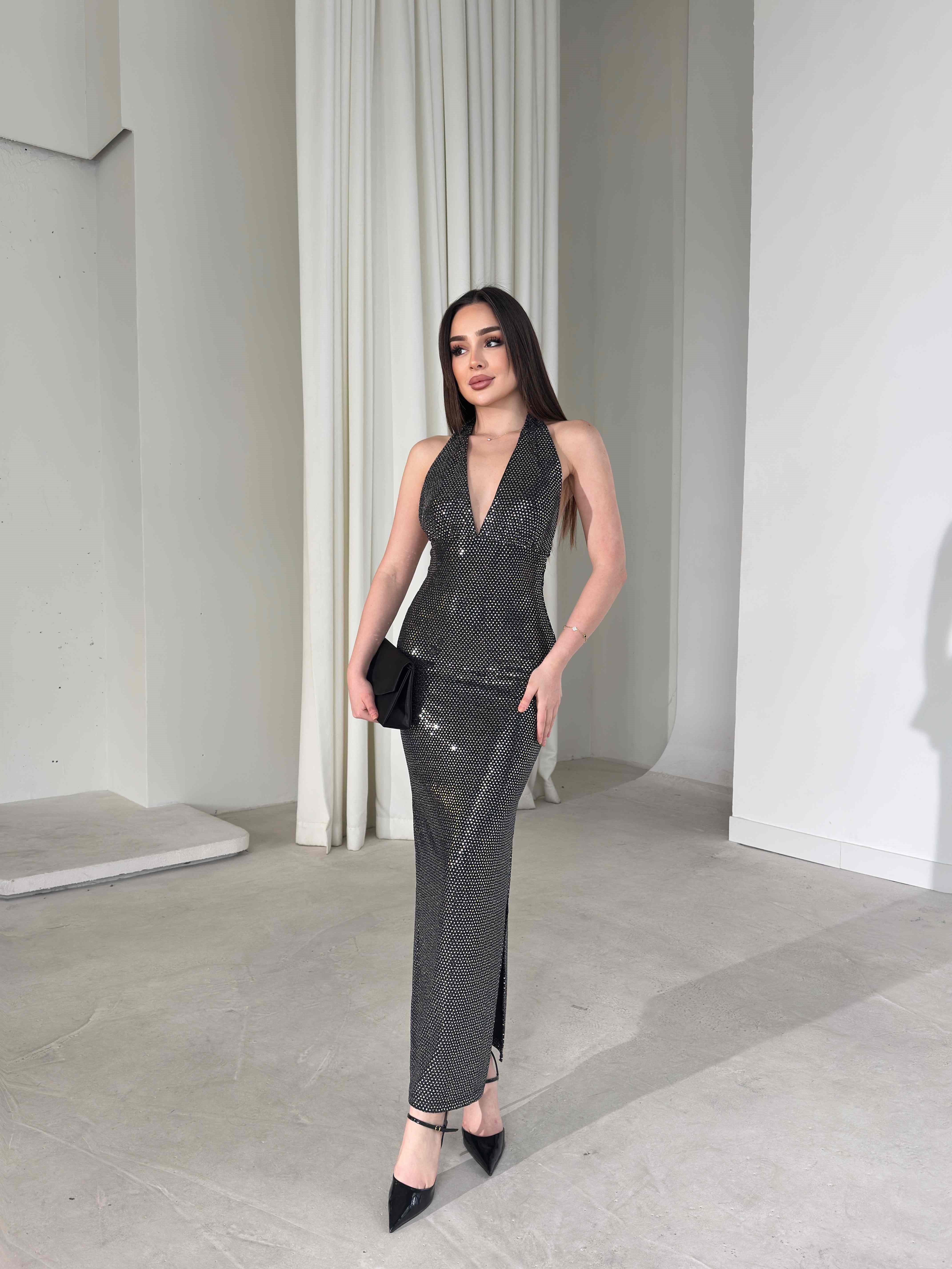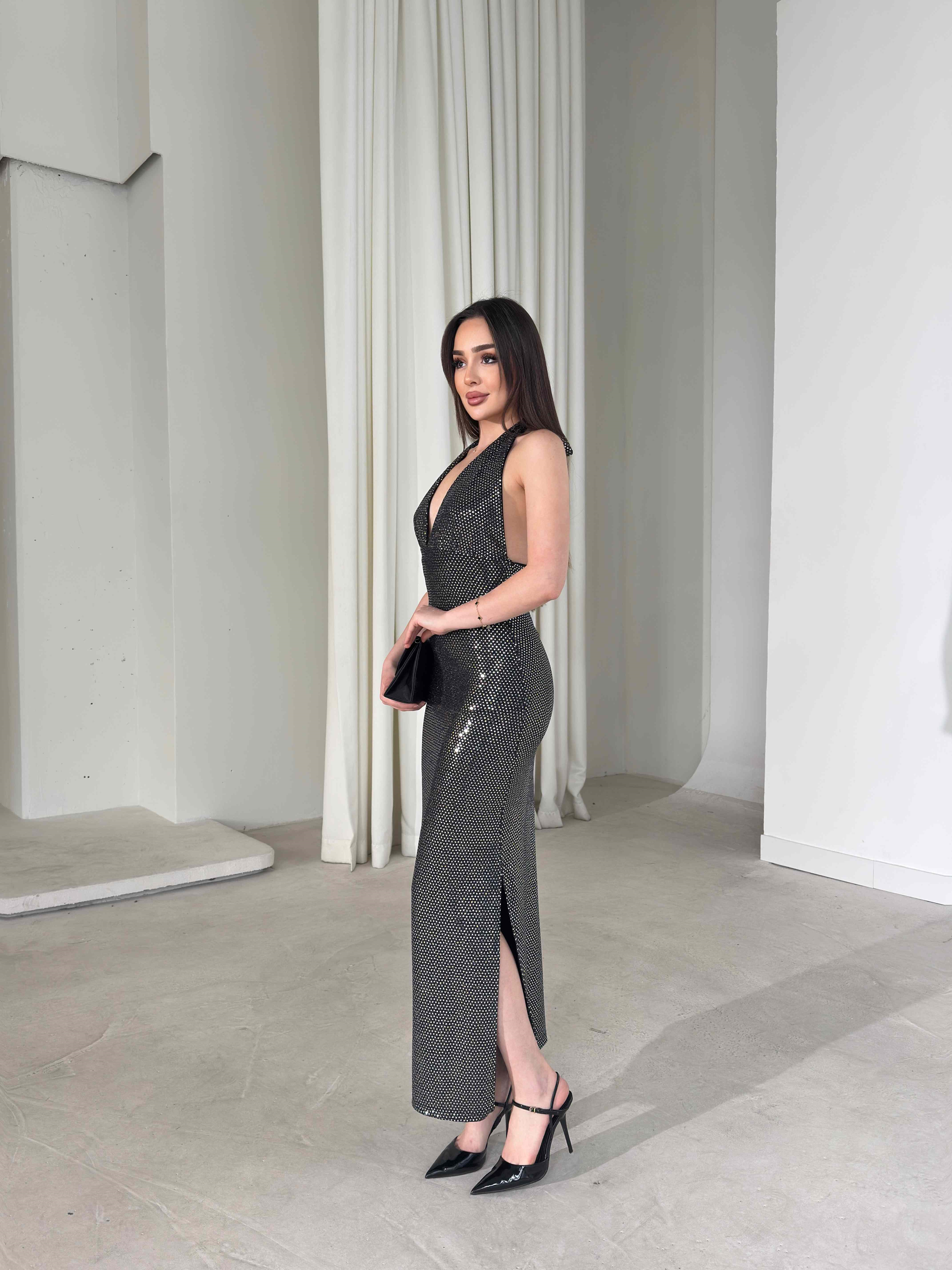 Derin V Yaka Boyundan Bağlamalı Parlak Yandan Yırtmaçlı Siyah Bridget Kadın Elbise 26Y185 (26Y185)