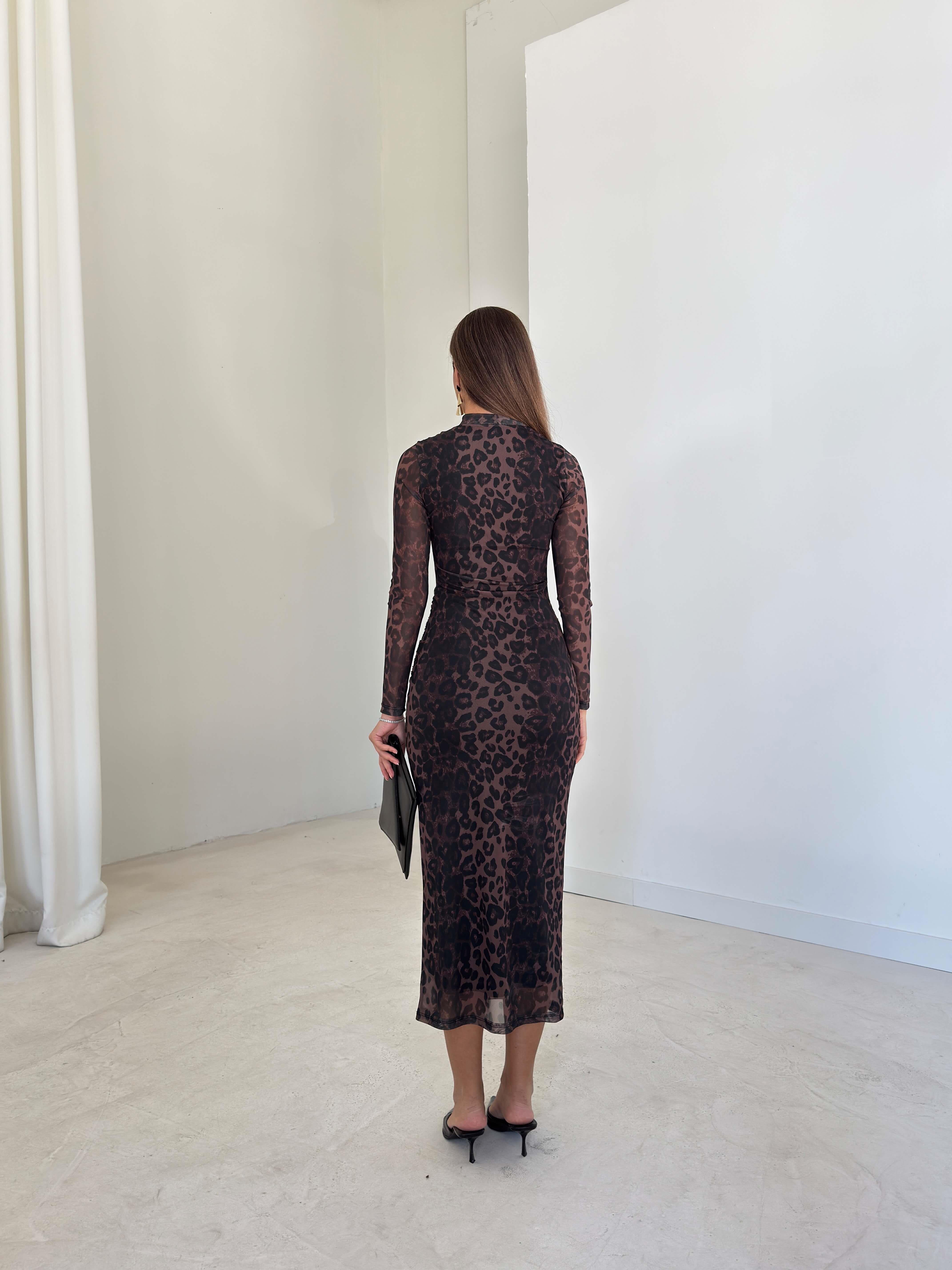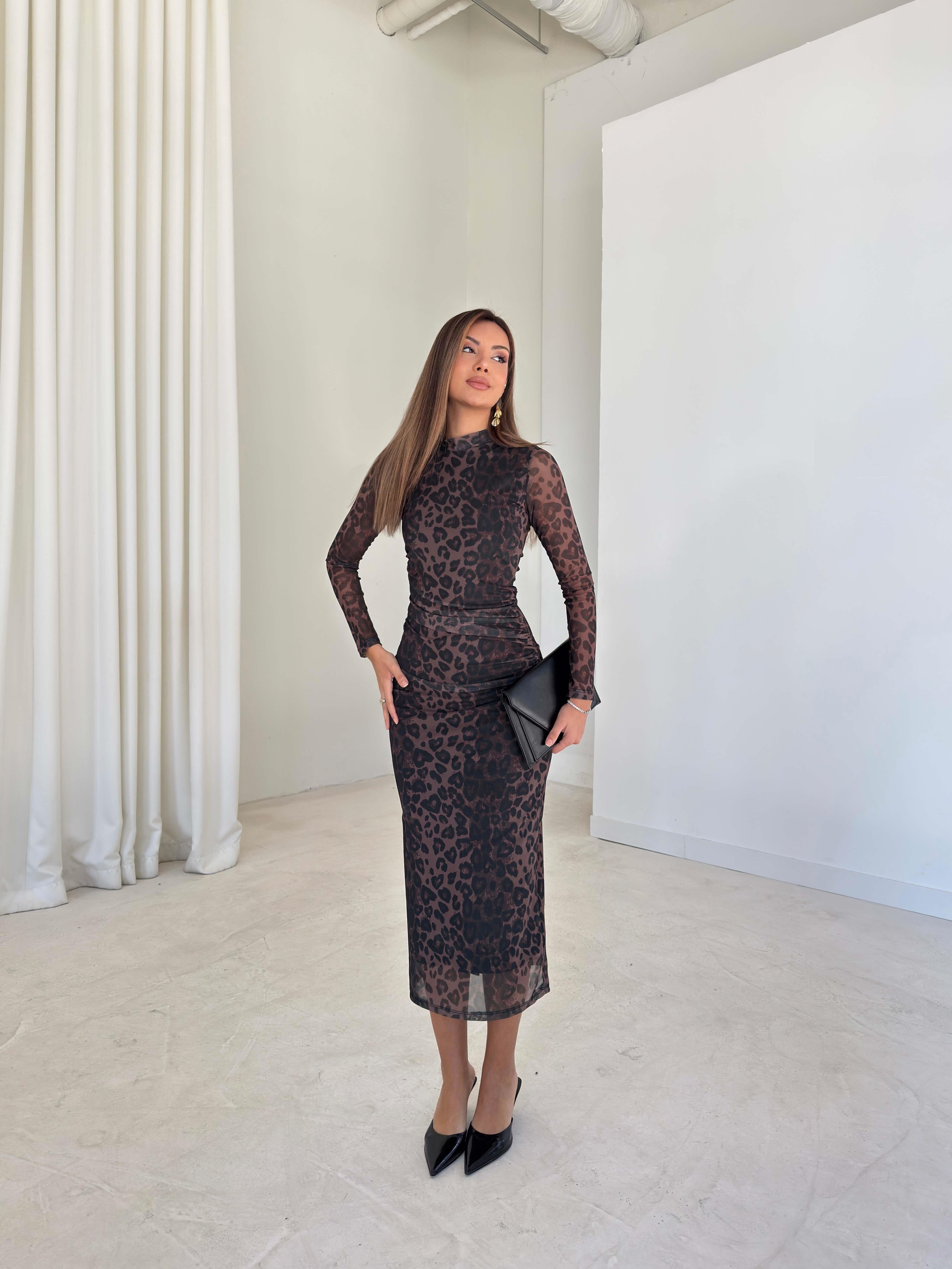 Desenli Drape Detaylı Kolları Tül Coleman Leopar Kadın Elbise 26K217