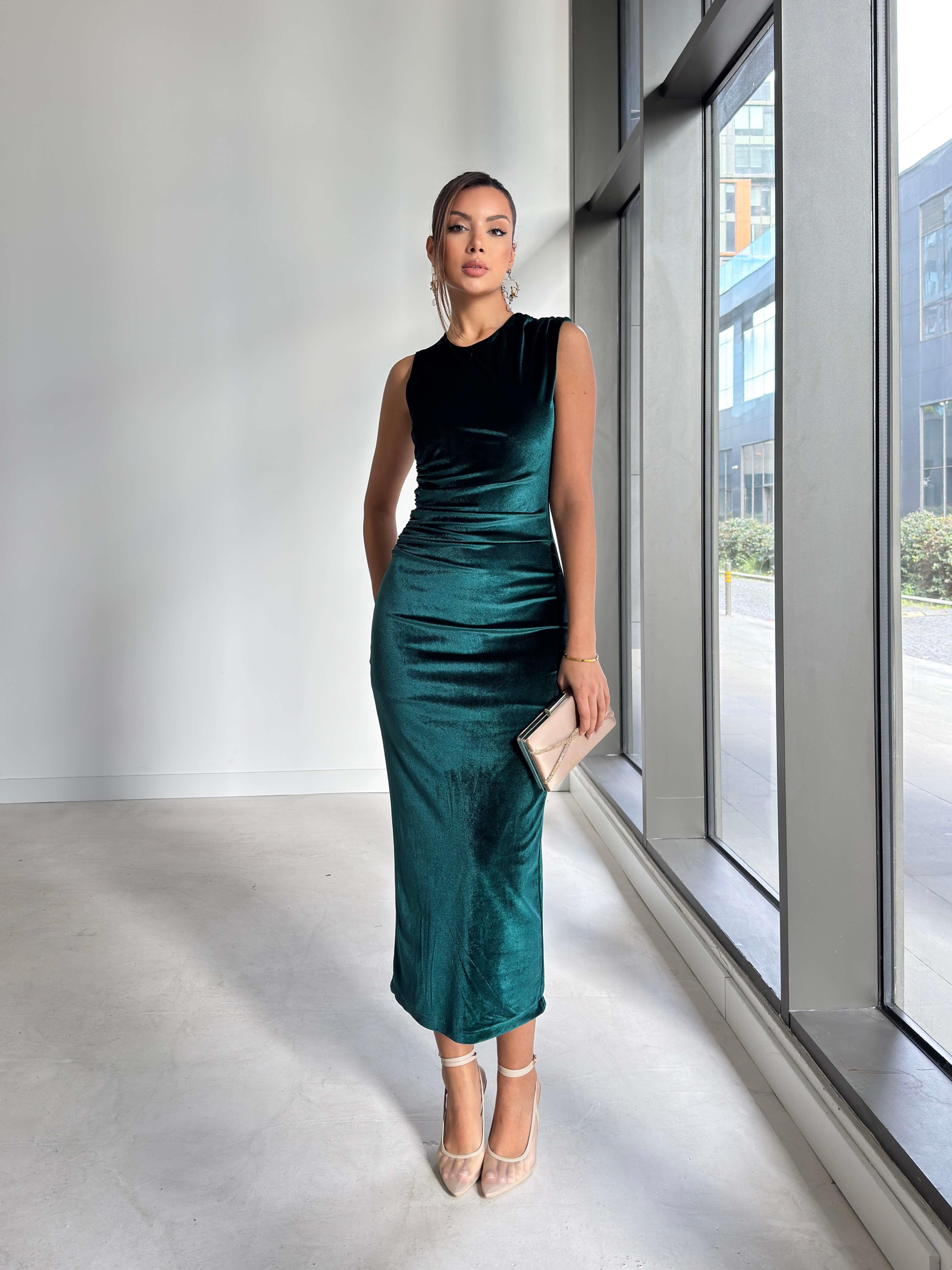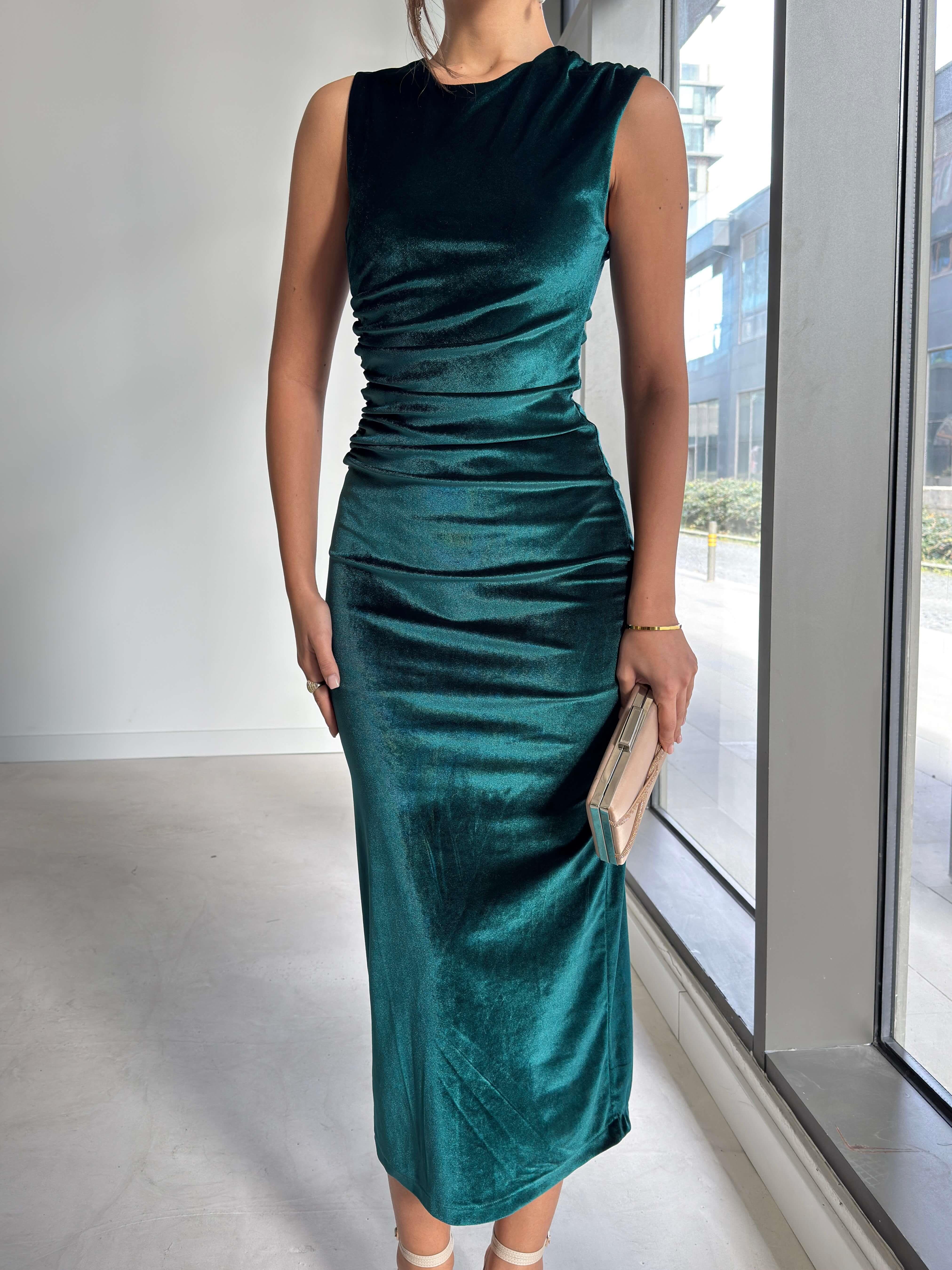 Drape Detaylı Arkası Yırtmaçlı Nelani Yeşil Kadın Kadife Elbise 26K260 (26K260)