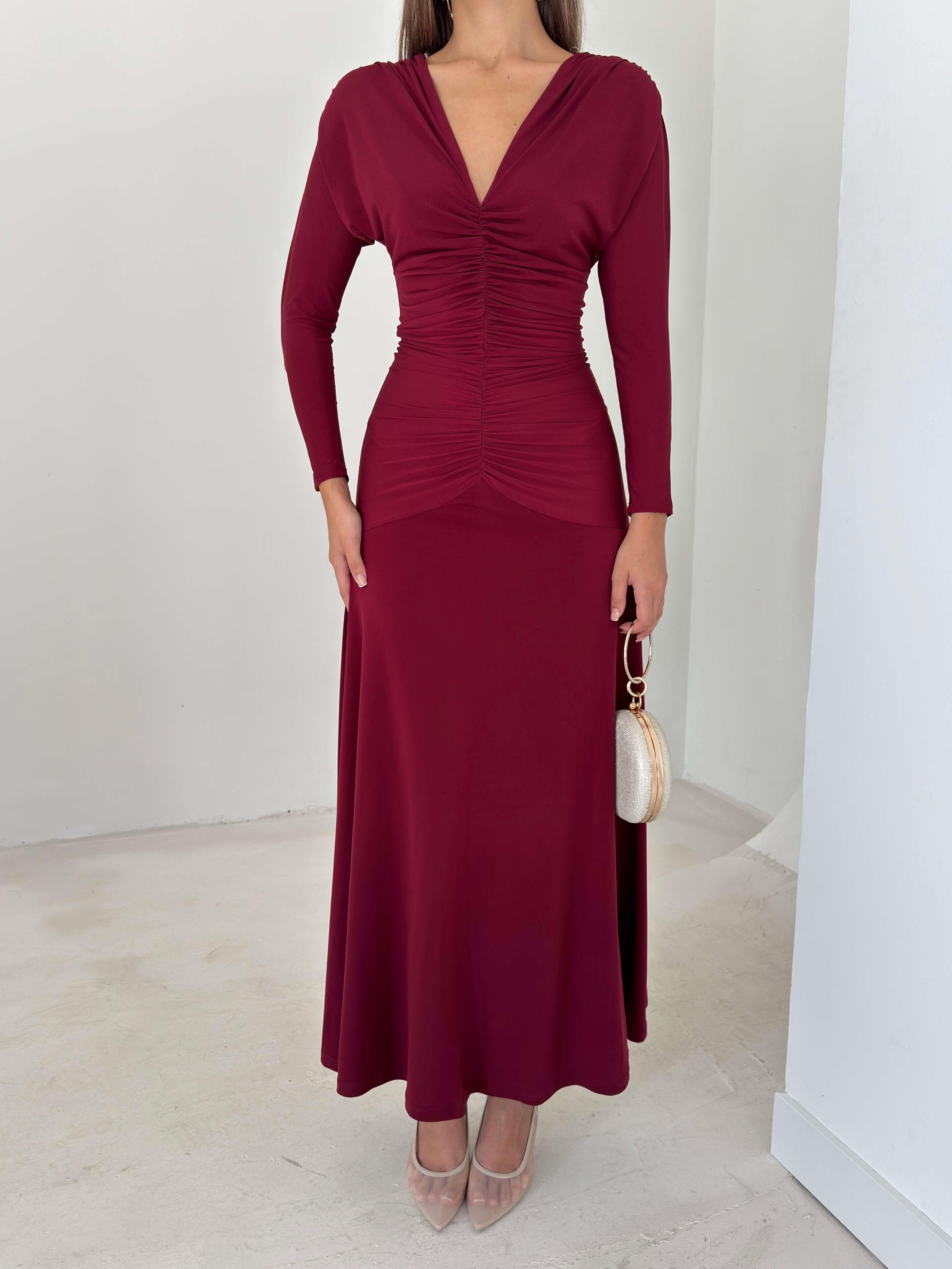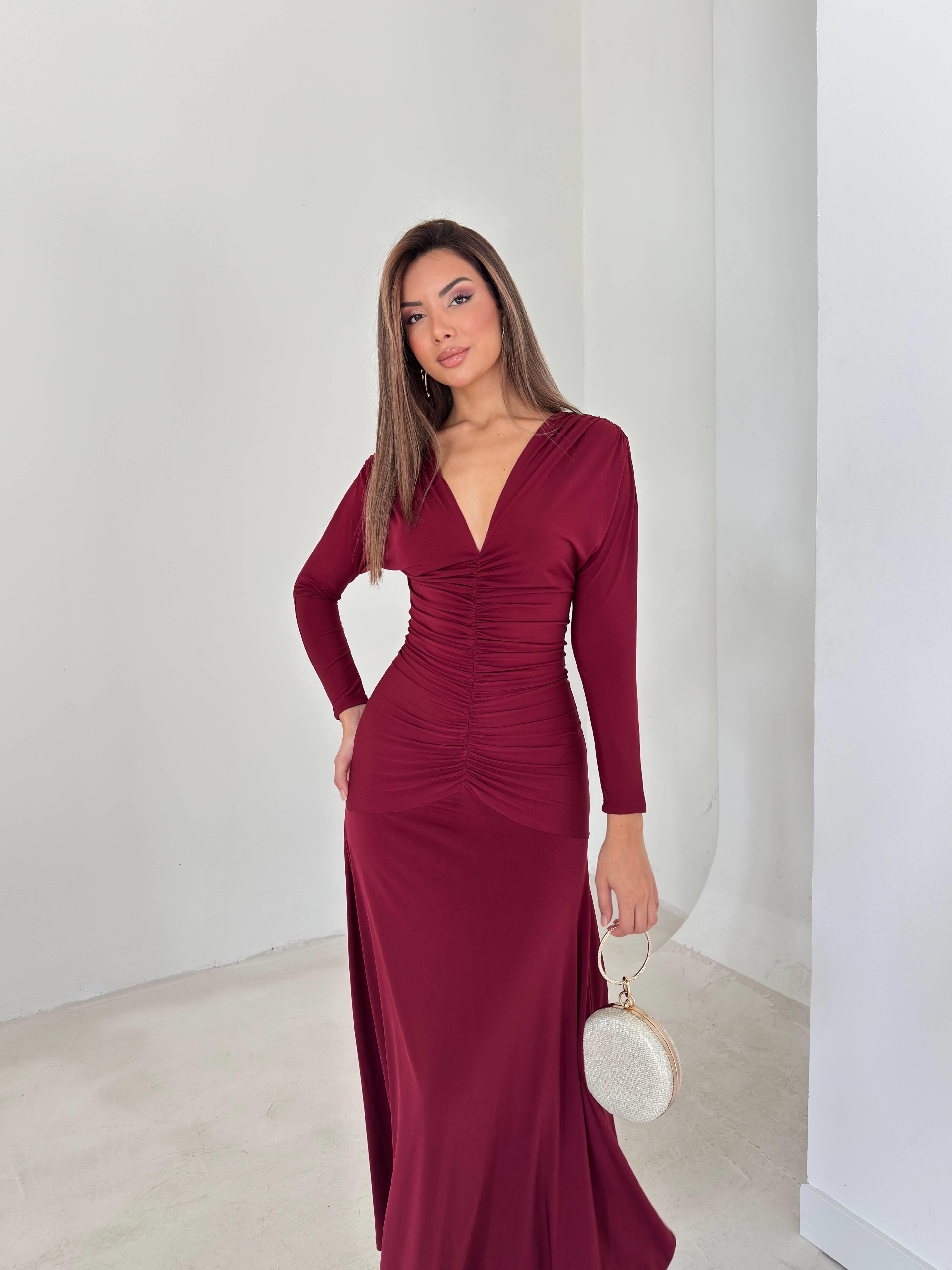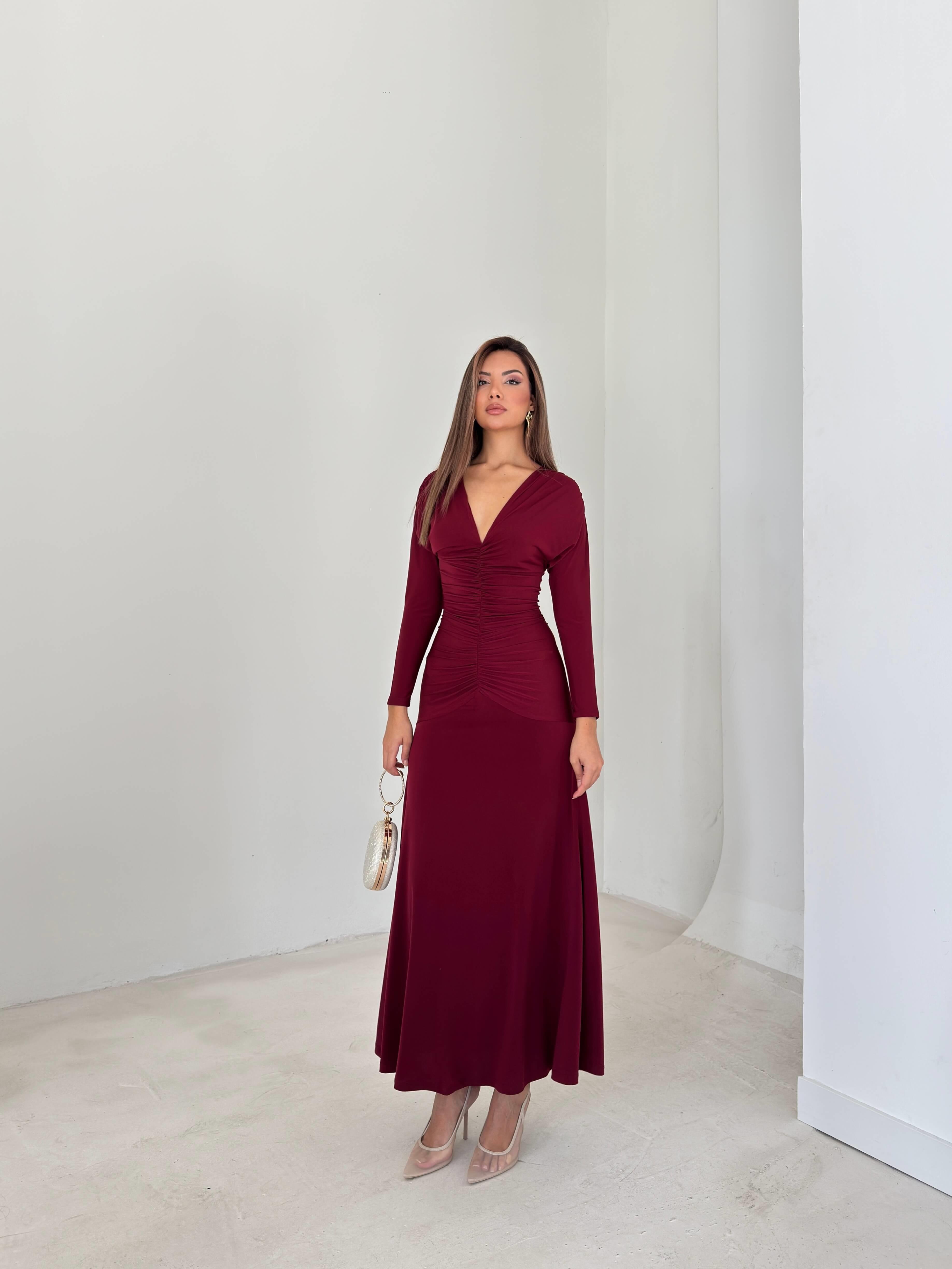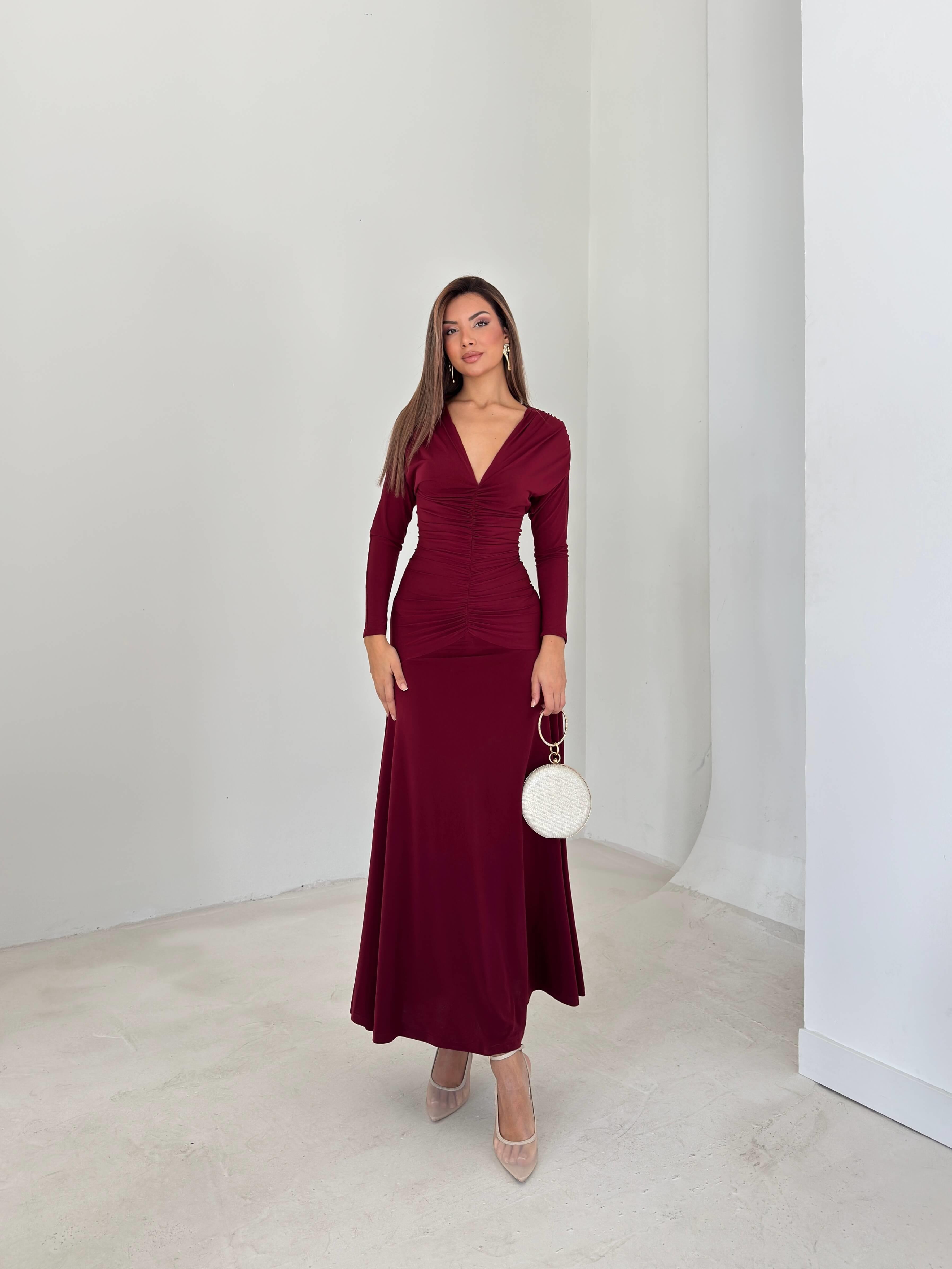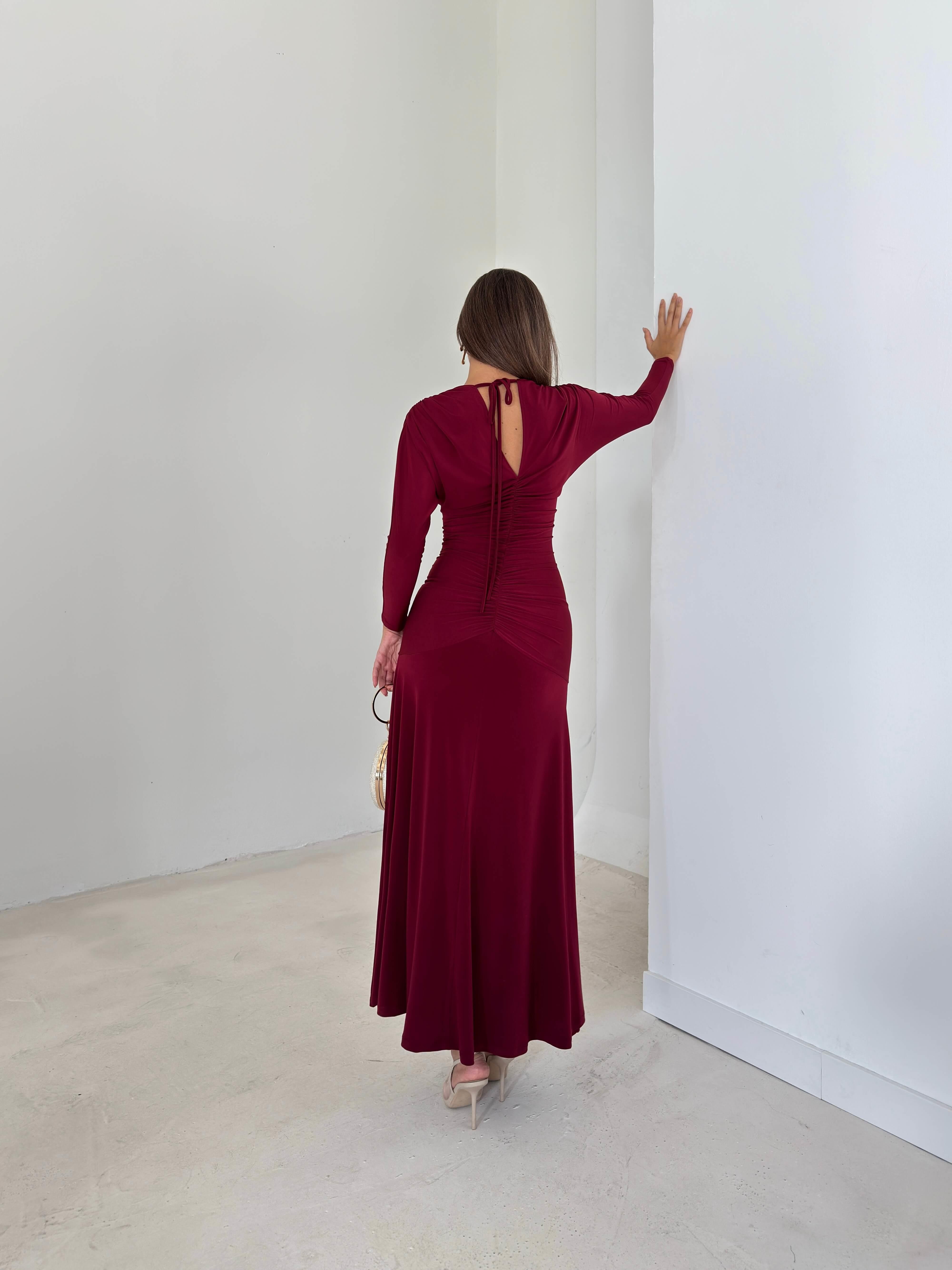 Drapeli Boyundan Bağlamalı V Yaka Degalte Bordo Kadın Elbise 26K143 (26K143)