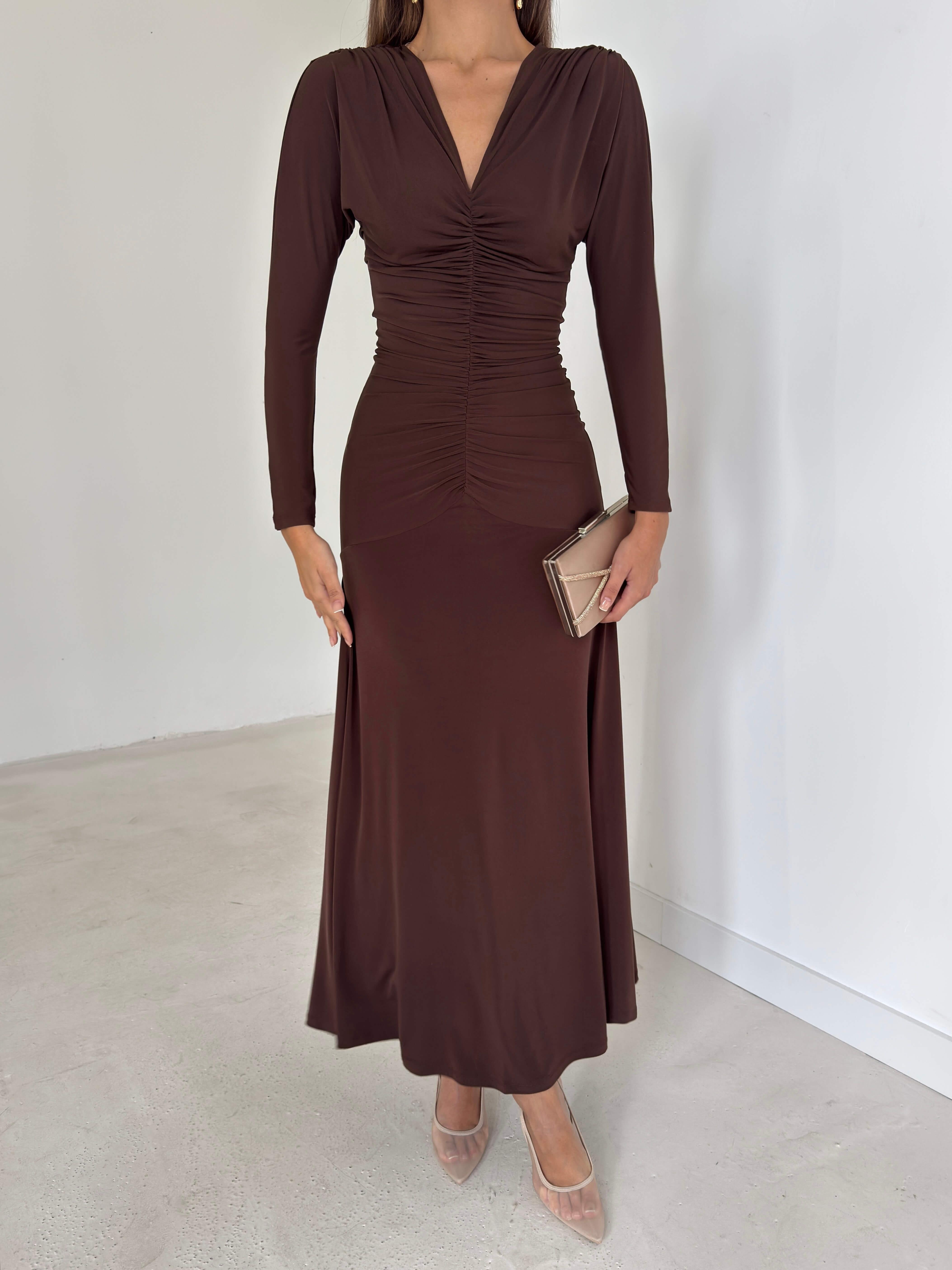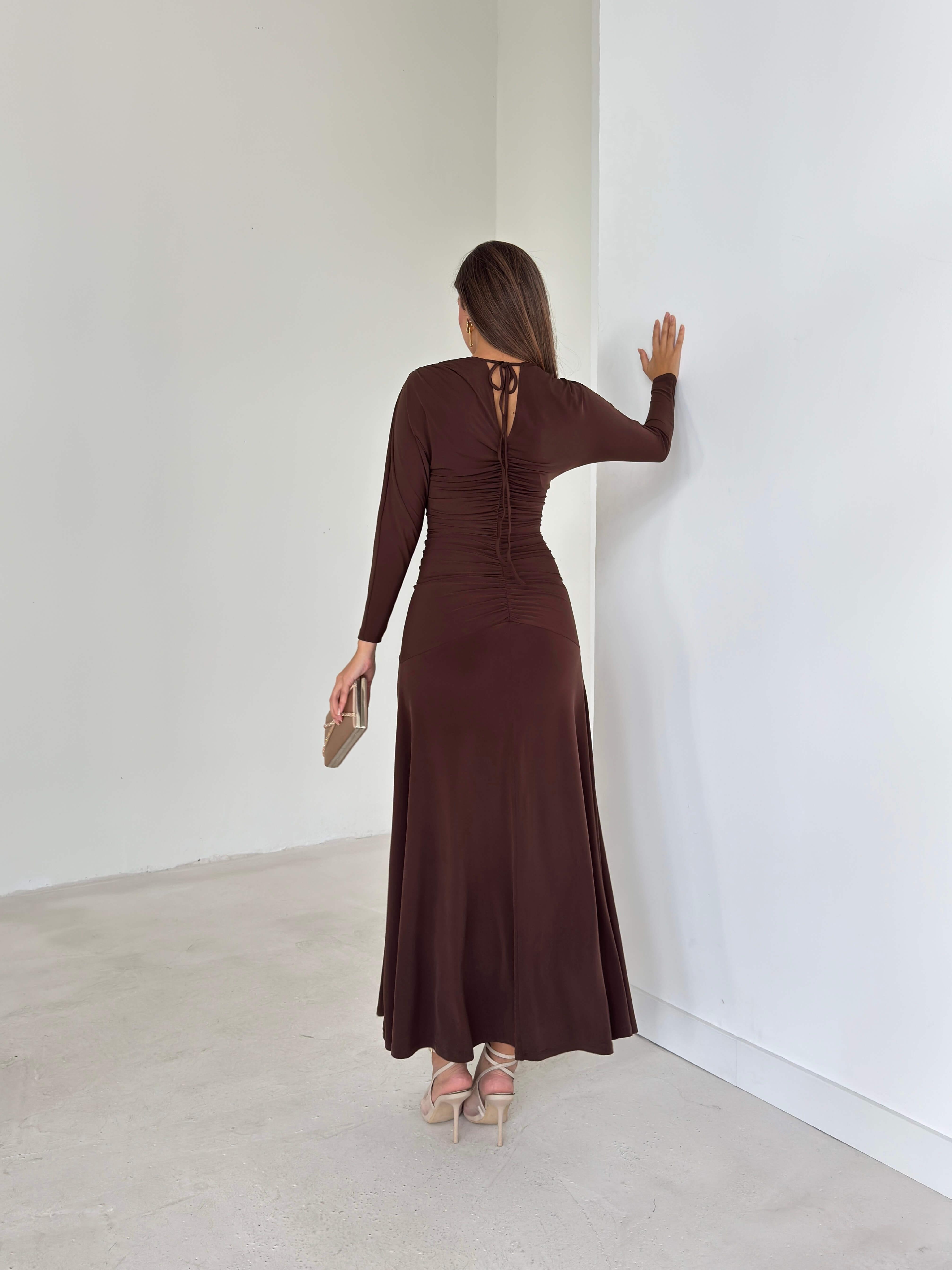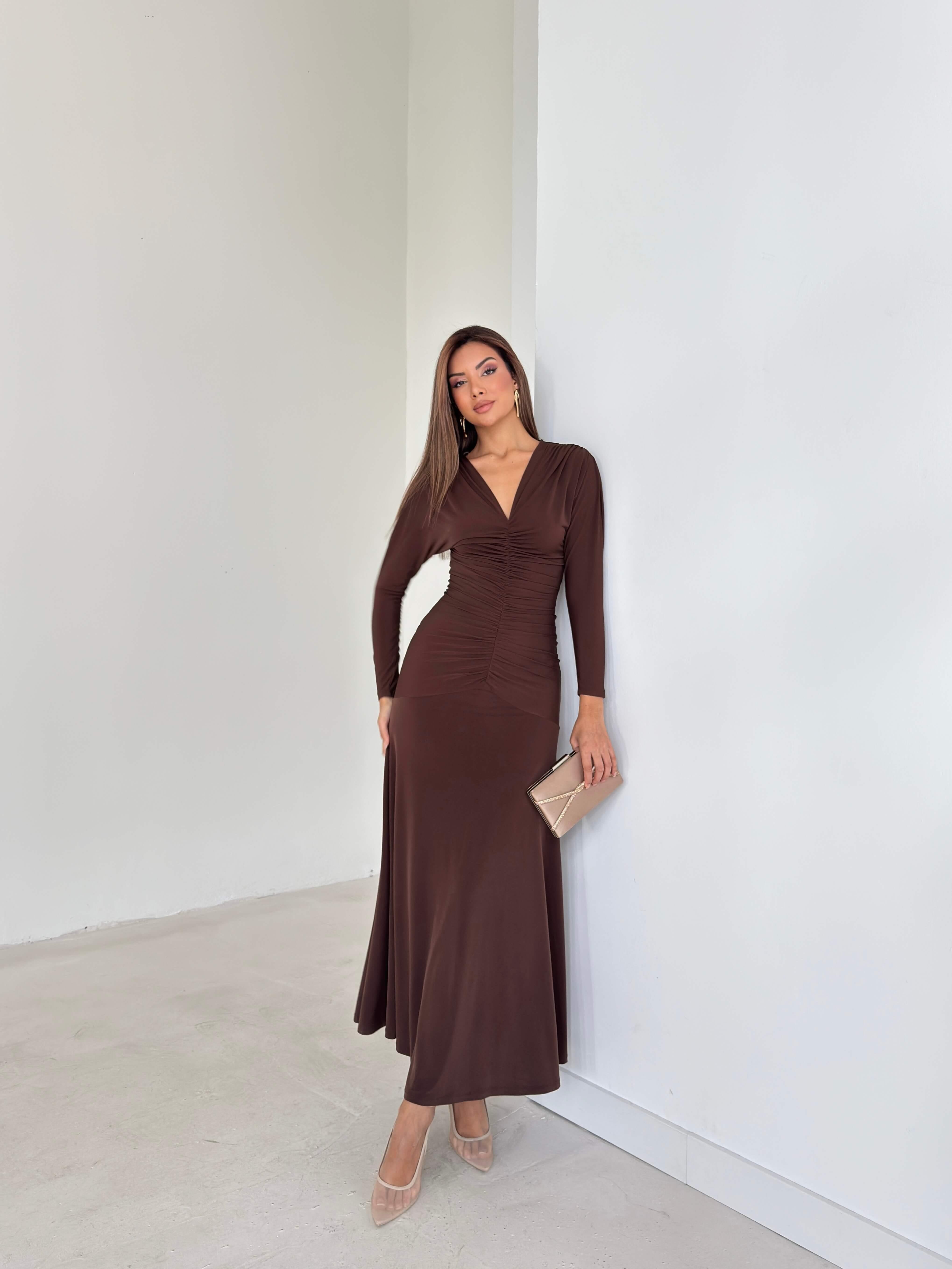Drapeli Boyundan Bağlamalı V Yaka Degalte Kahve Kadın Elbise 26K143 (26K143)