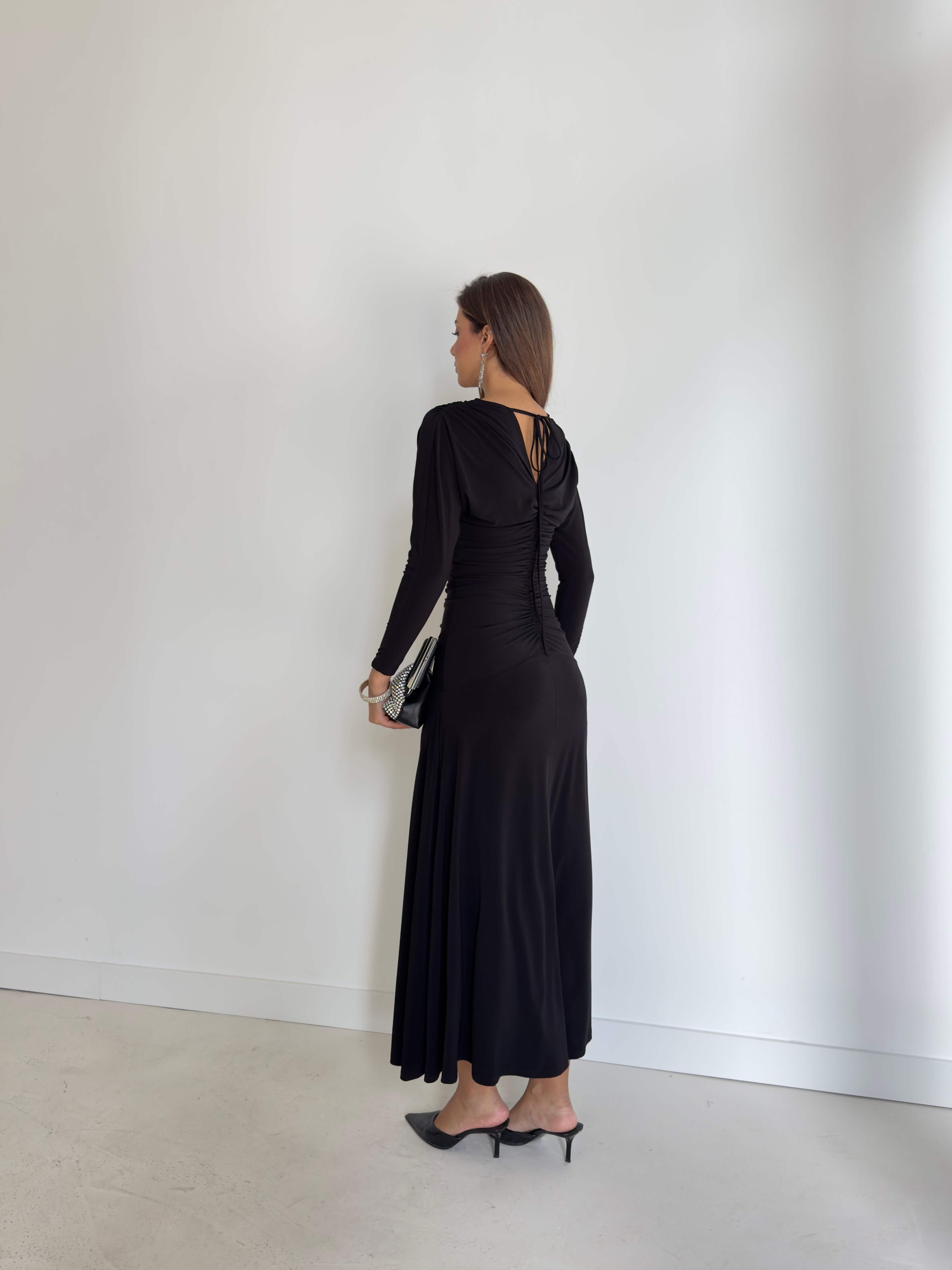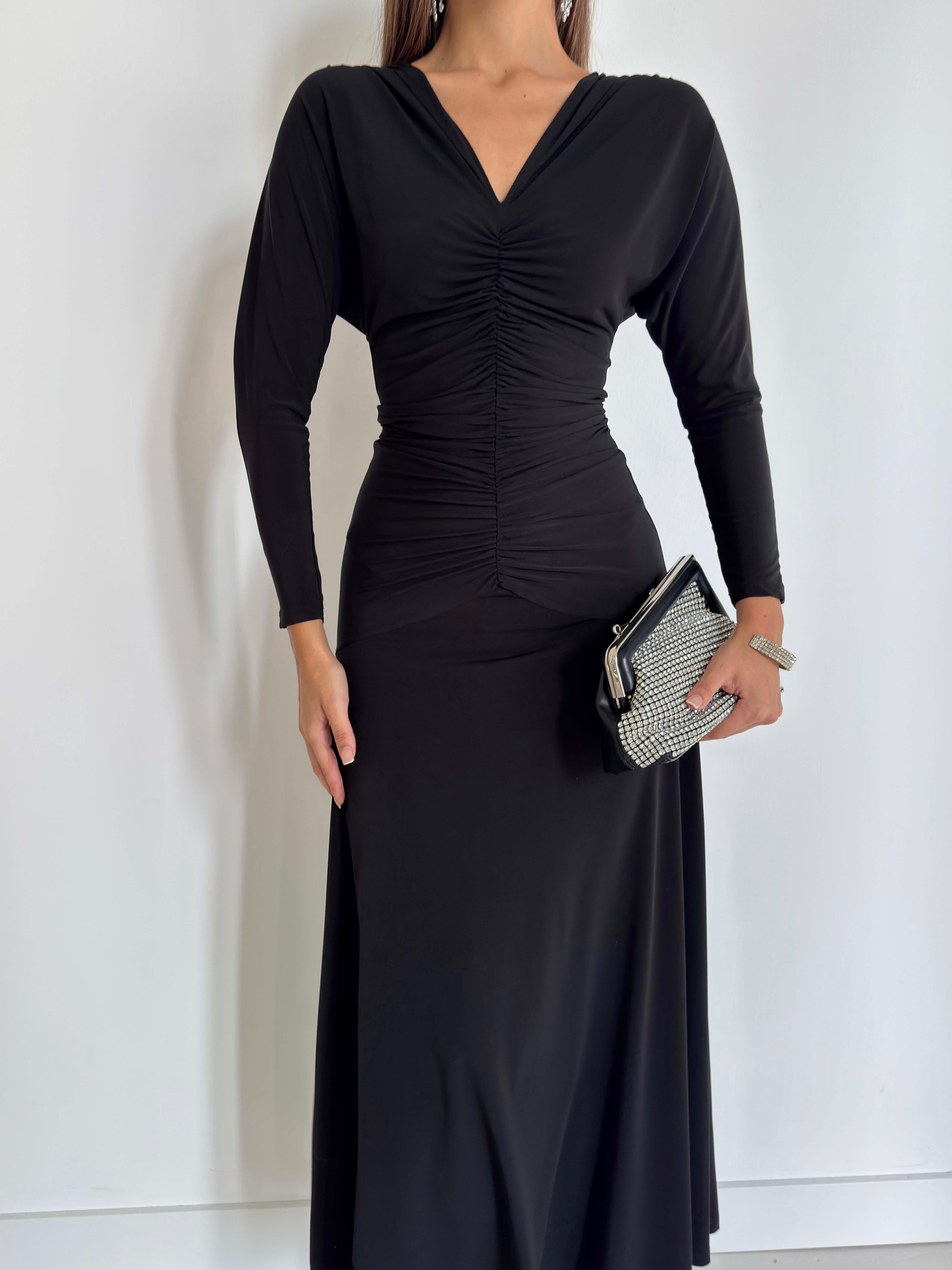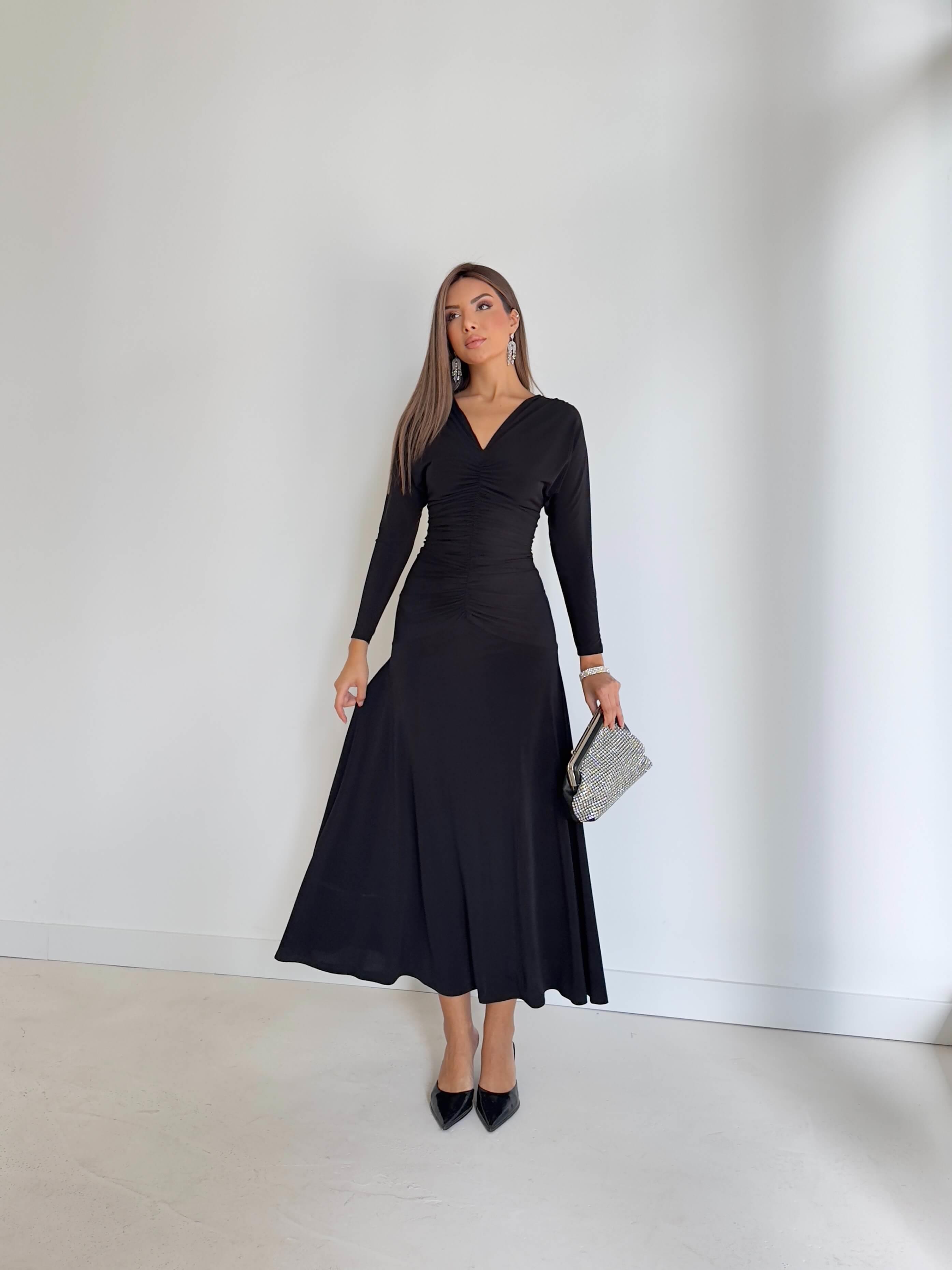 Drapeli Boyundan Bağlamalı V Yaka Degalte Siyah Kadın Elbise 26K143 (26K143)